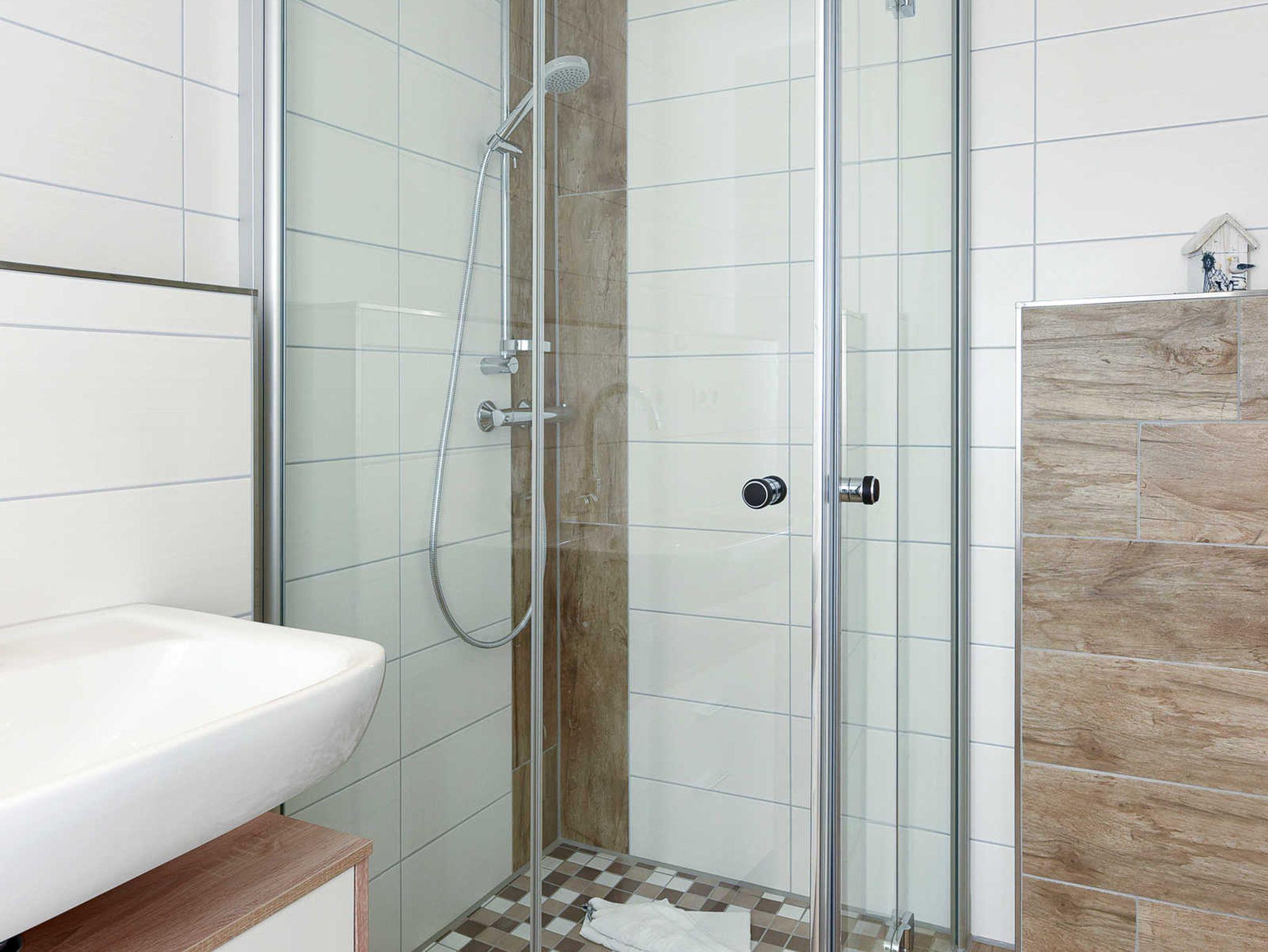 Badezimmer mit Dusche, Waschtisch und WC