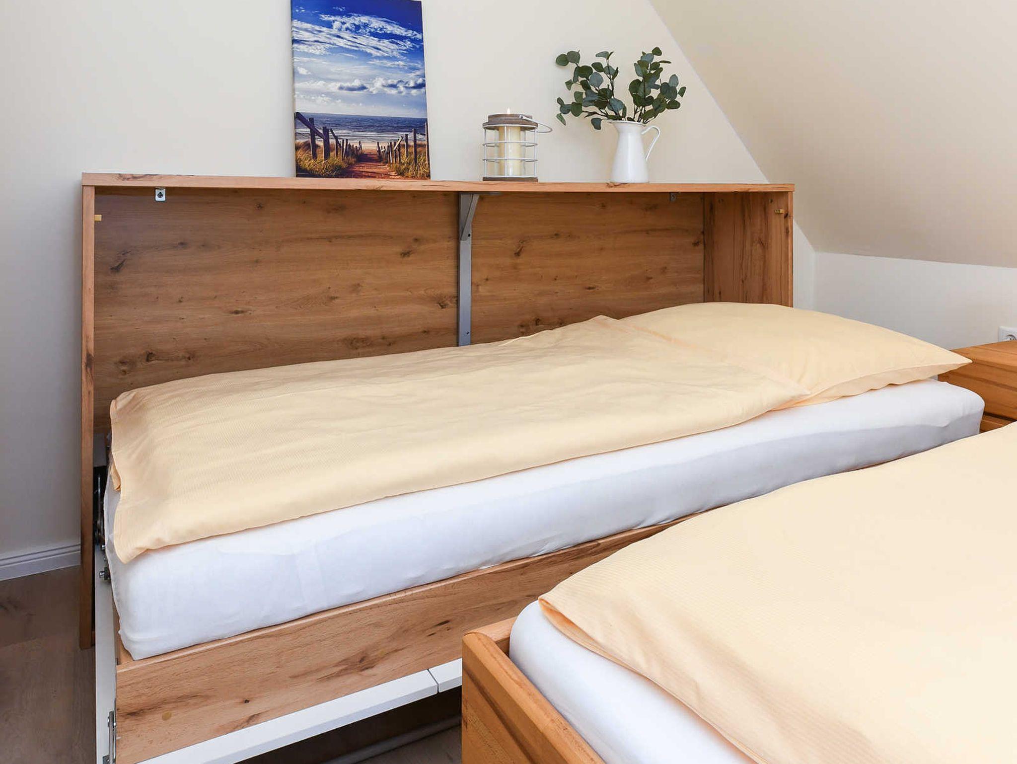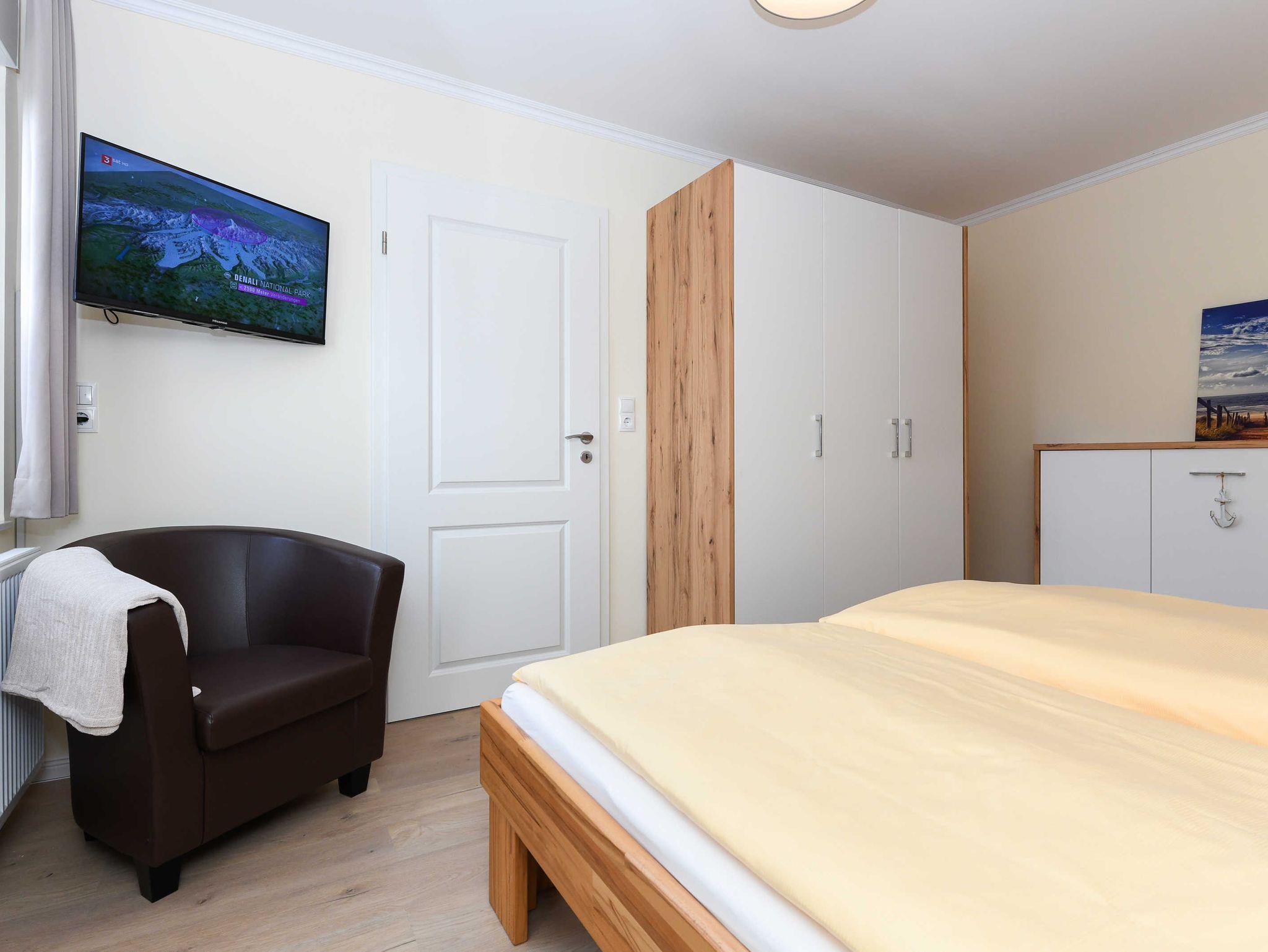 Die Ferienwohnung Sonnendeck, ebenfalls im ersten Obergeschoss ist optimal für 2 Gäste. Es steht im Schlafzimmer aber auch noch ein Schrankbett zum Ausklappen für einen dritten Gast zur Verfügung.
