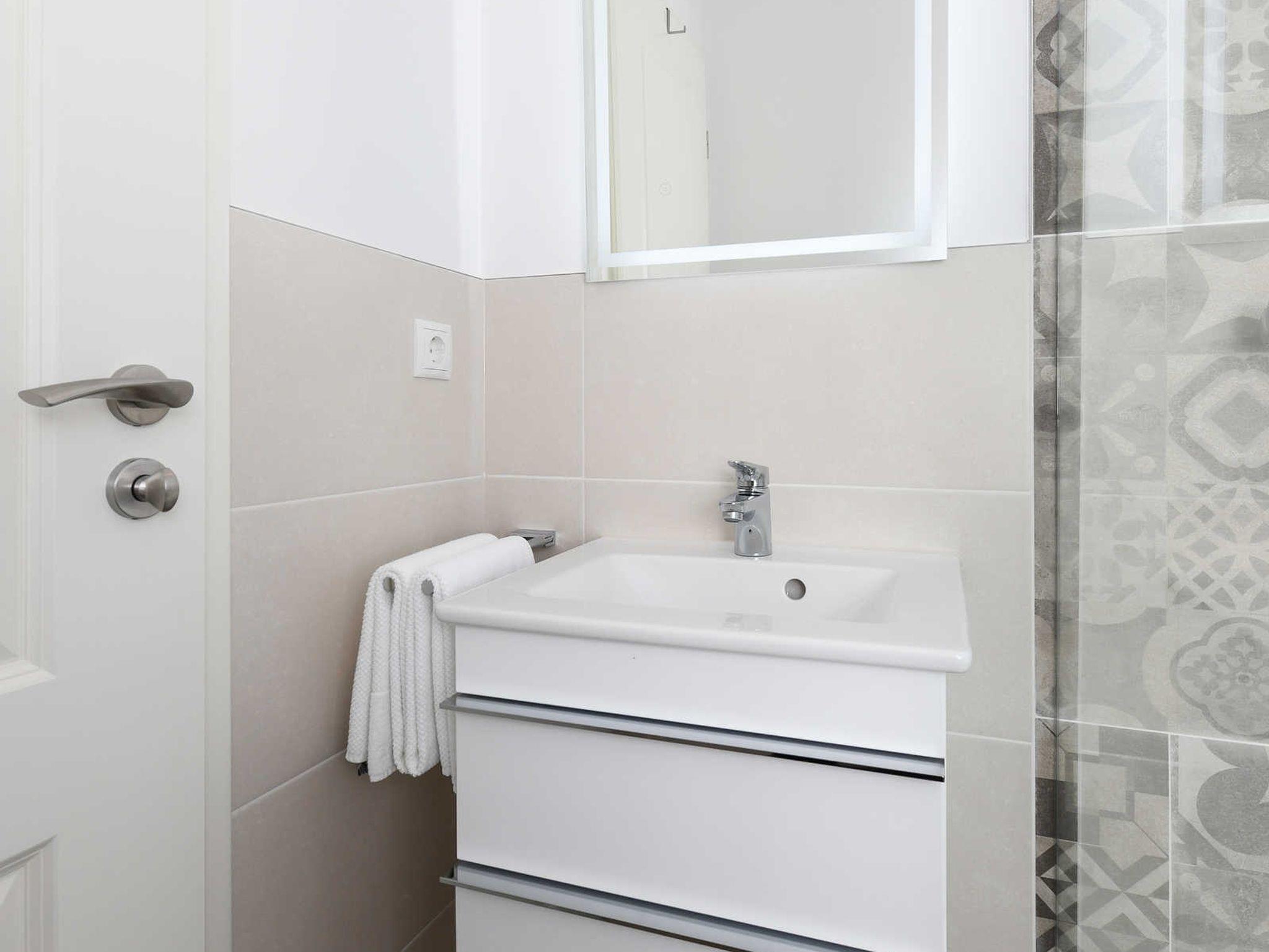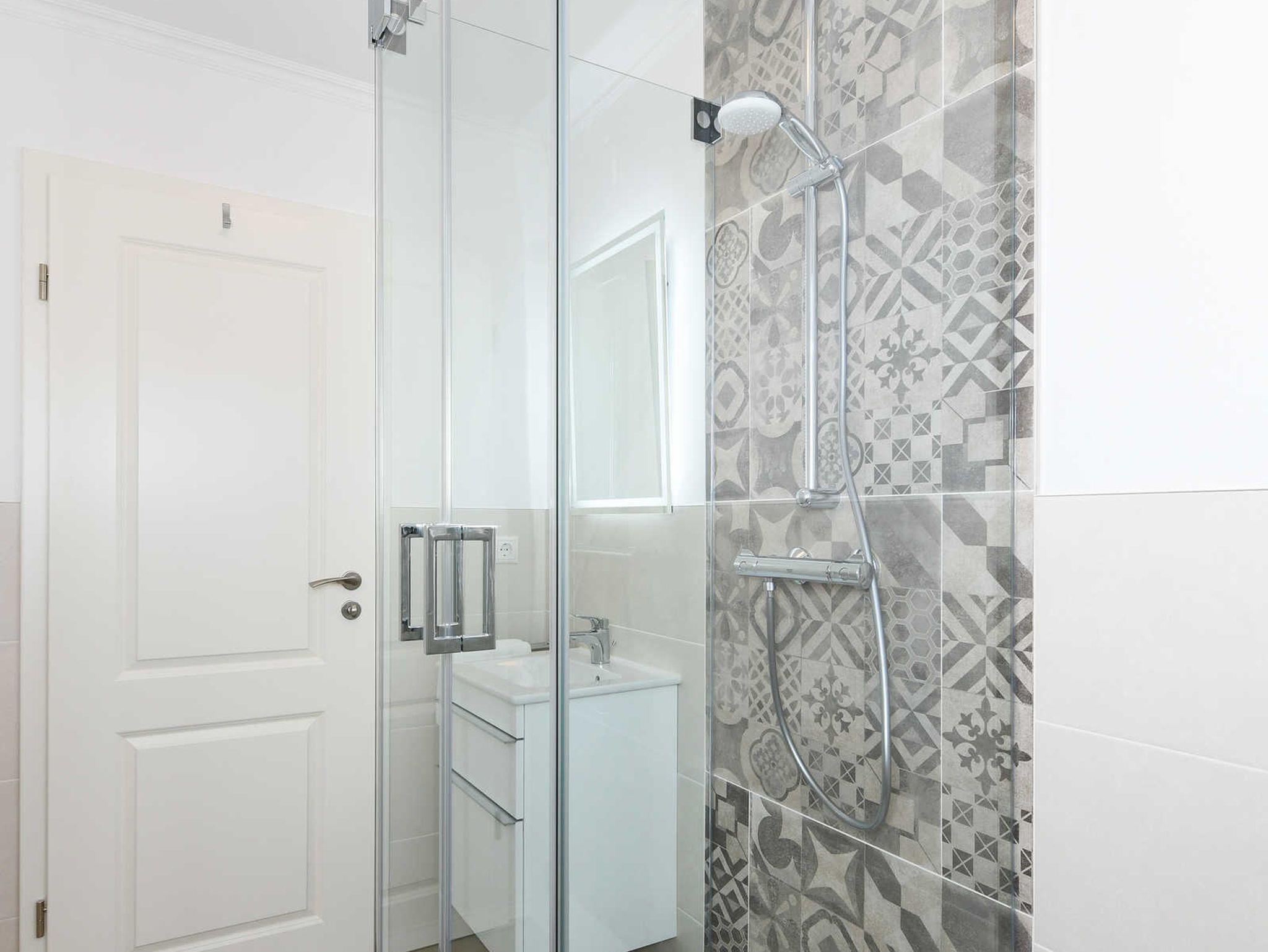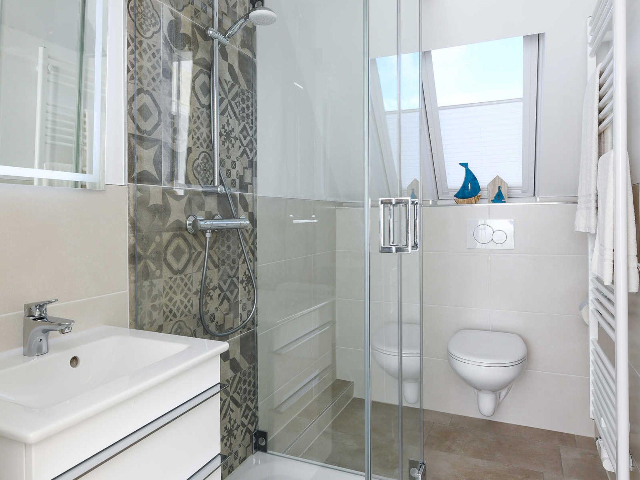 Badezimmer mit Dusche, Waschtisch und WC