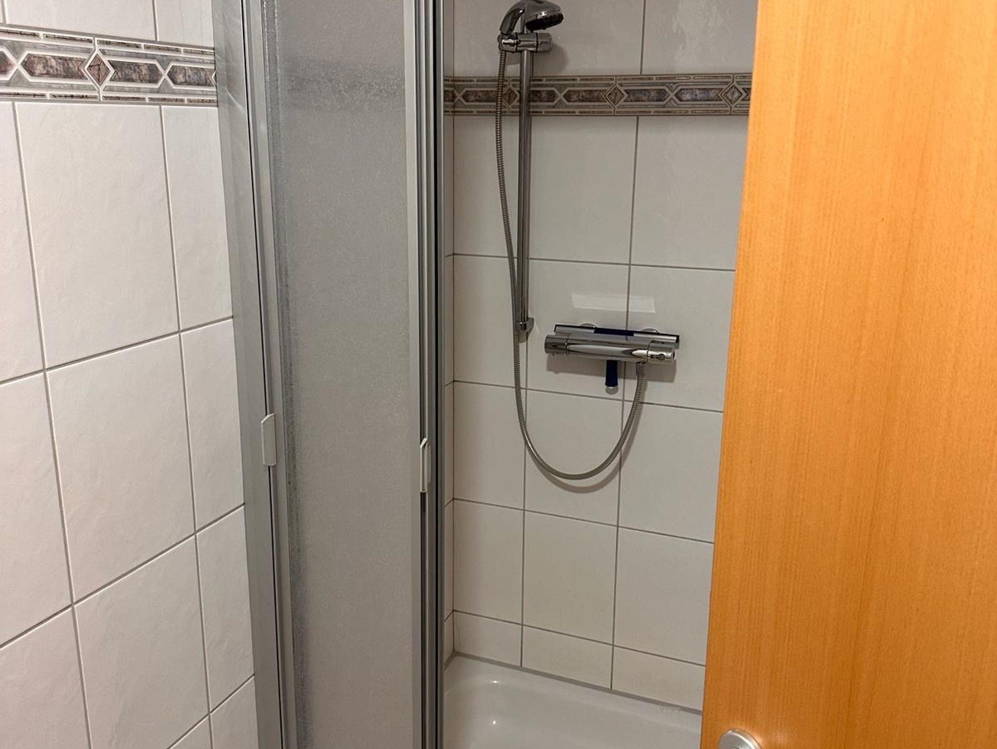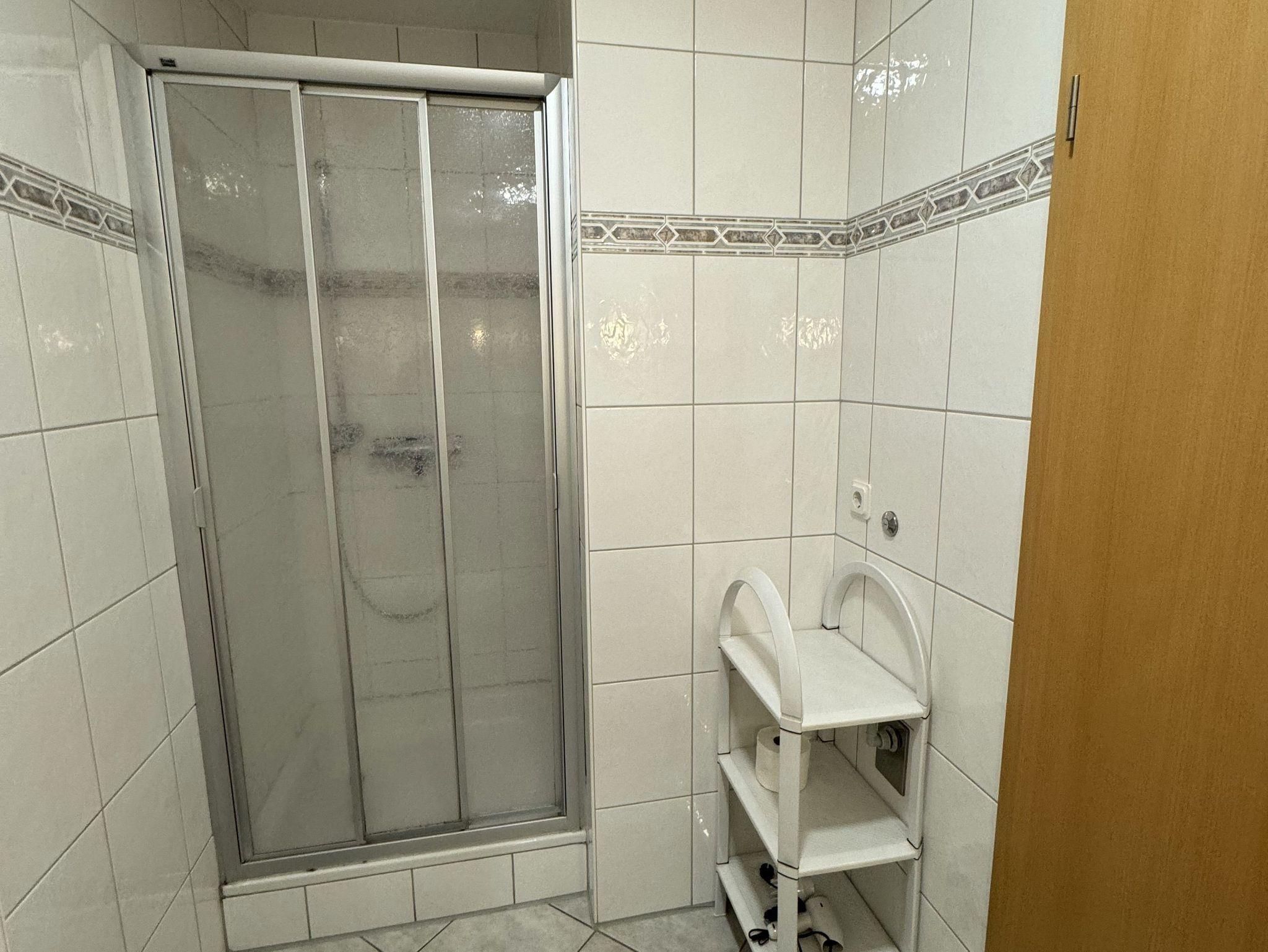 Badezimmer mit Dusche, Waschtisch und WC