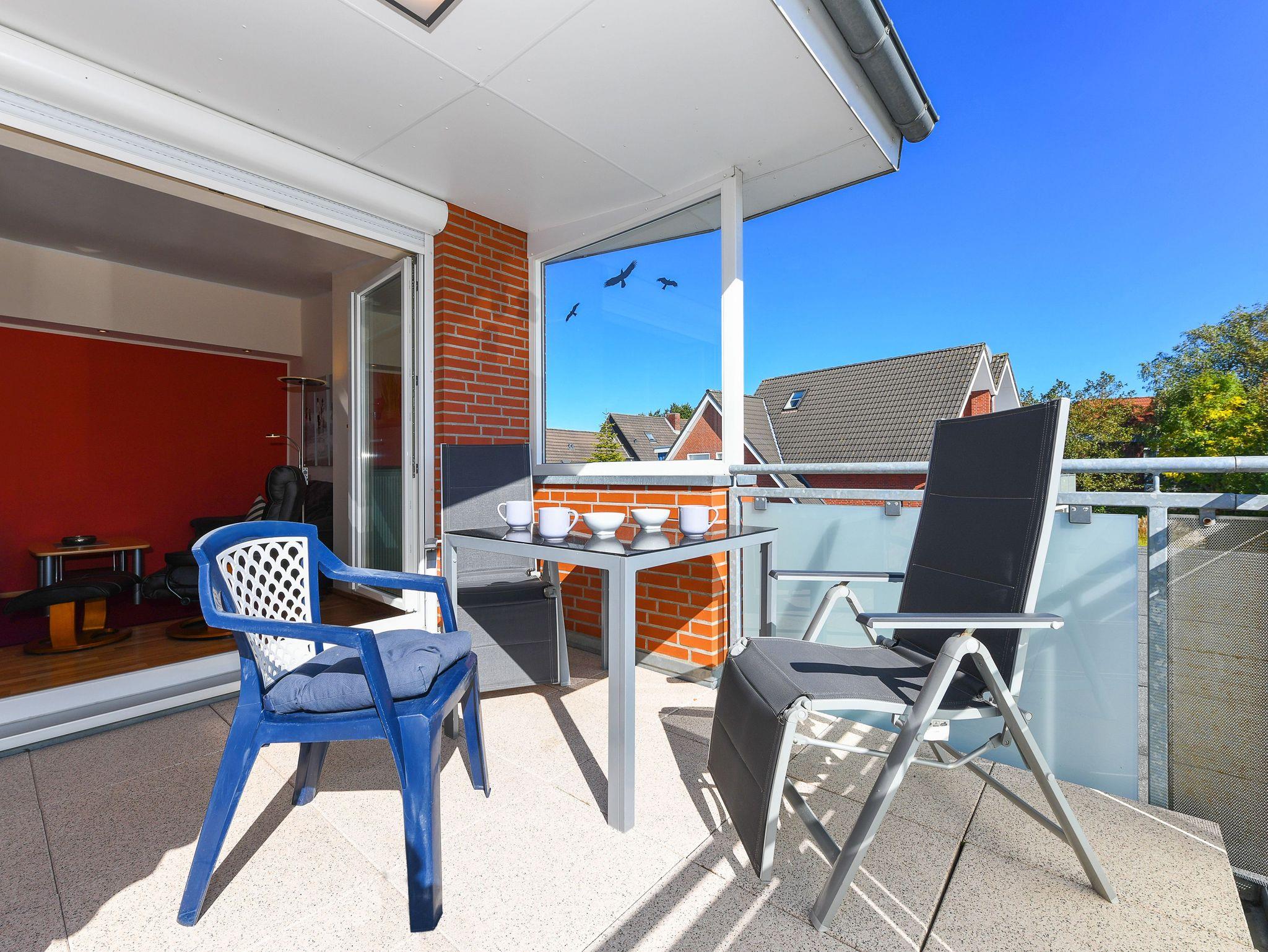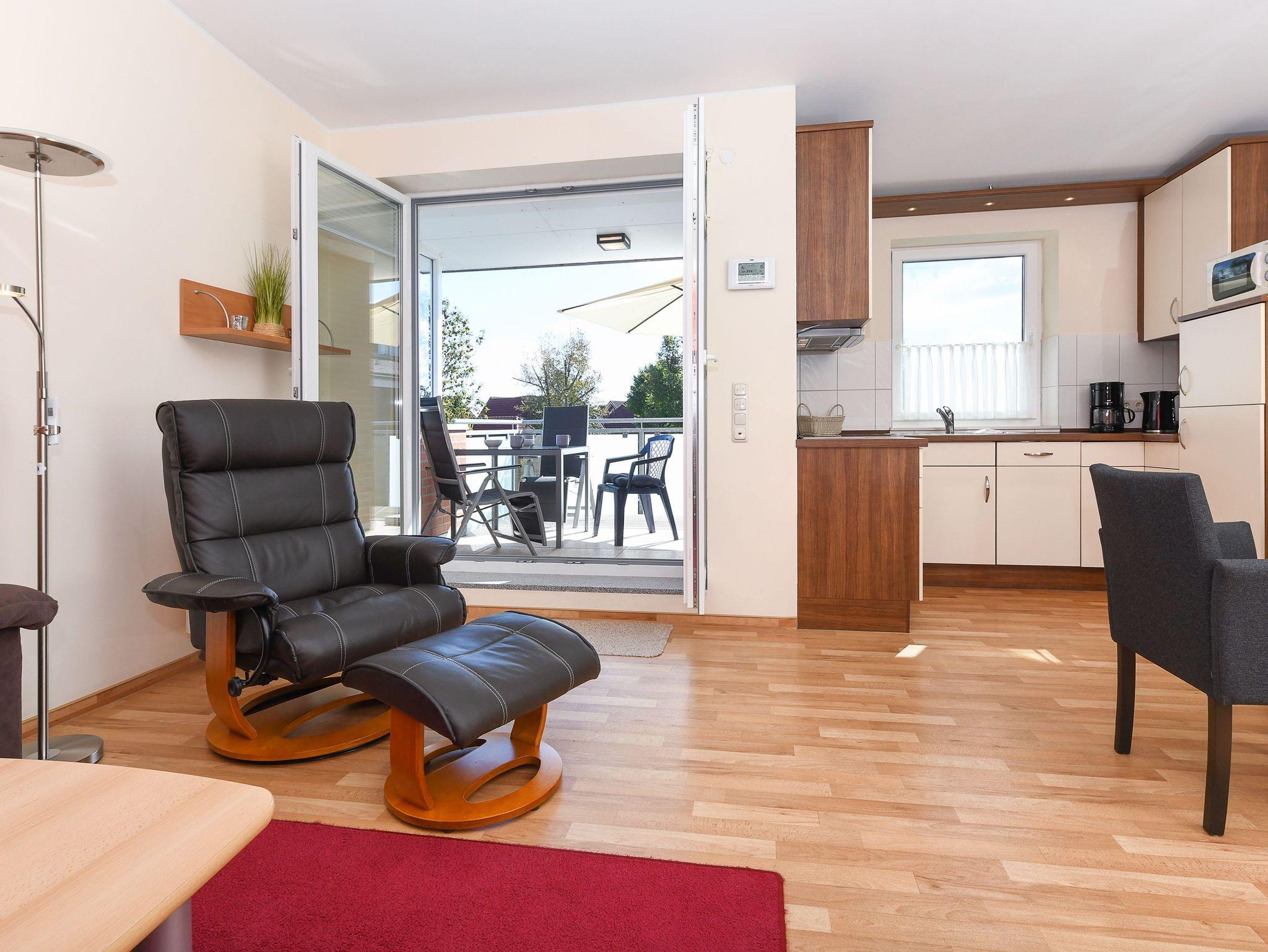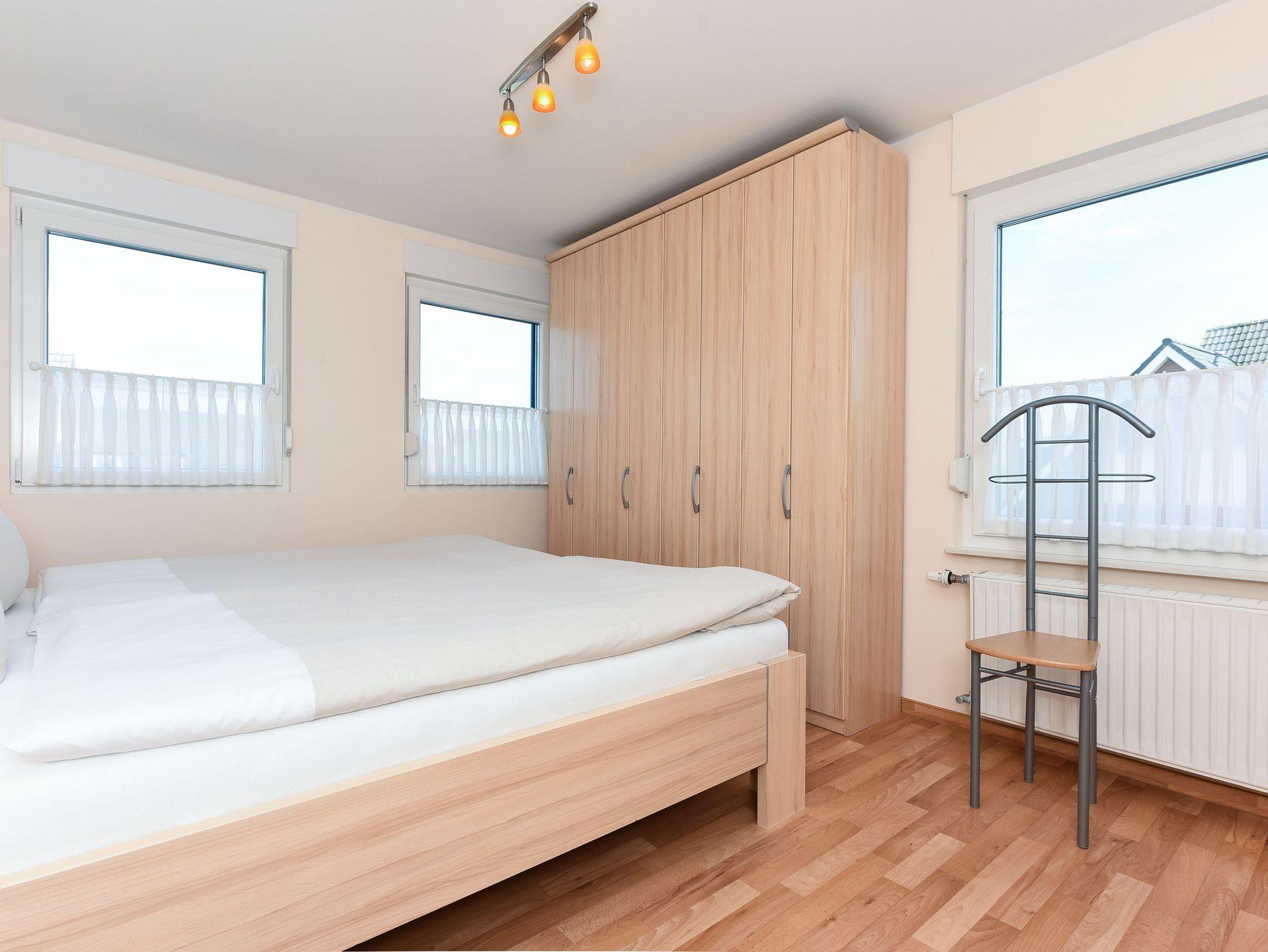 Größe ca. 57 Quadratmeter, Wohnraum mit integrierter Küche, Schlafzimmer, zweites separates, Schlafzimmer/Kinderzimmer, Badezimmer mit Dusche, Waschtisch und WC, Obergeschoss, Balkon, optimal für 1 bis 3 Personen und auf Anfrage zusätzlich ein Kleinkind.