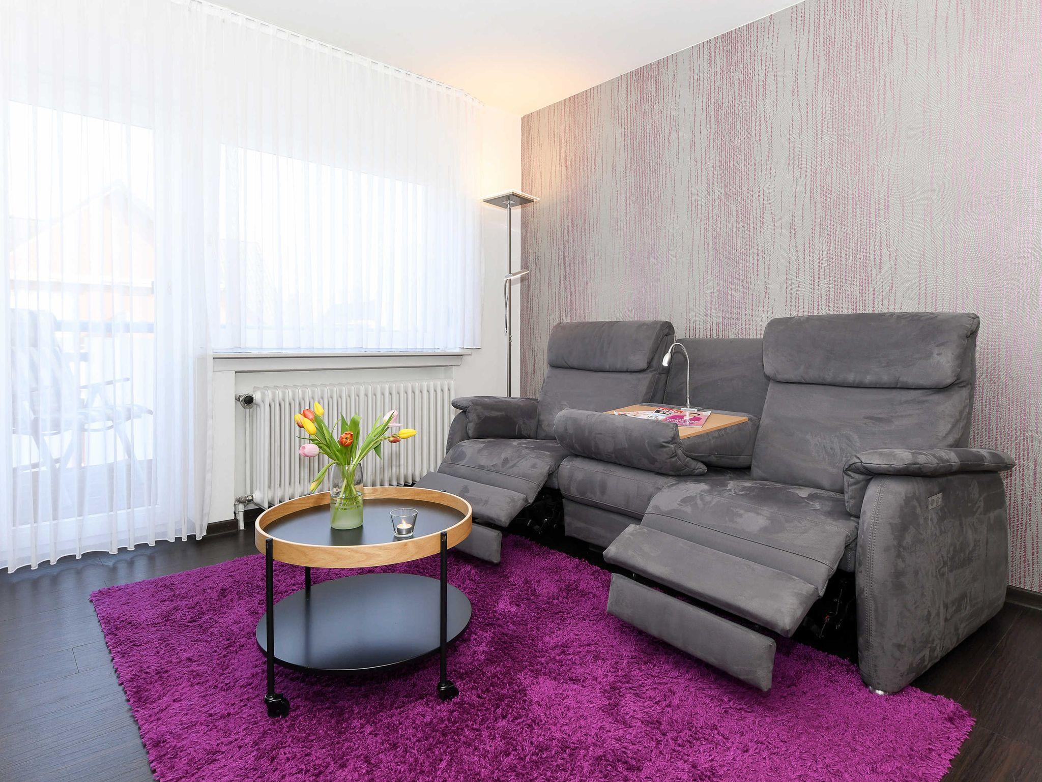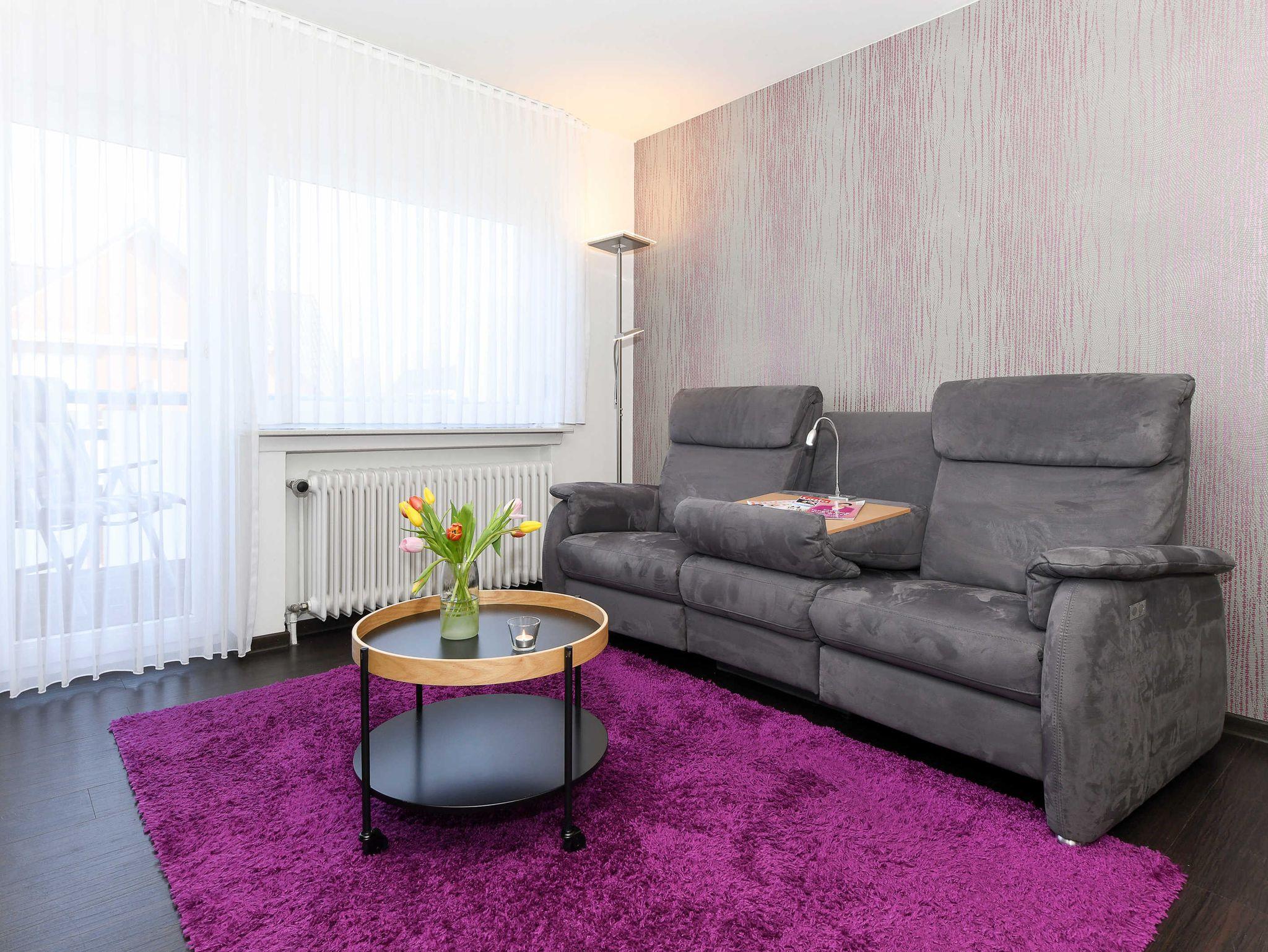 Größe ca. 40 Quadratmeter, Wohnzimmer, Küche, Schlafzimmer, Badezimmer mit Dusche, Waschtisch und WC, Obergeschoss, Balkon, optimal für 1 bis 2 Personen.
