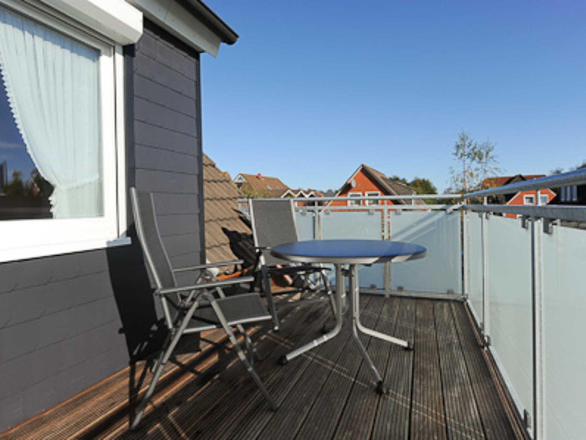 Größe ca. 40 Quadratmeter, Wohnraum mit integrierter Küche, Schlafzimmer, Badezimmer mit Dusche, Waschtisch und WC, Obergeschoss, Balkon, optimal für 1 bis 2 Personen.
