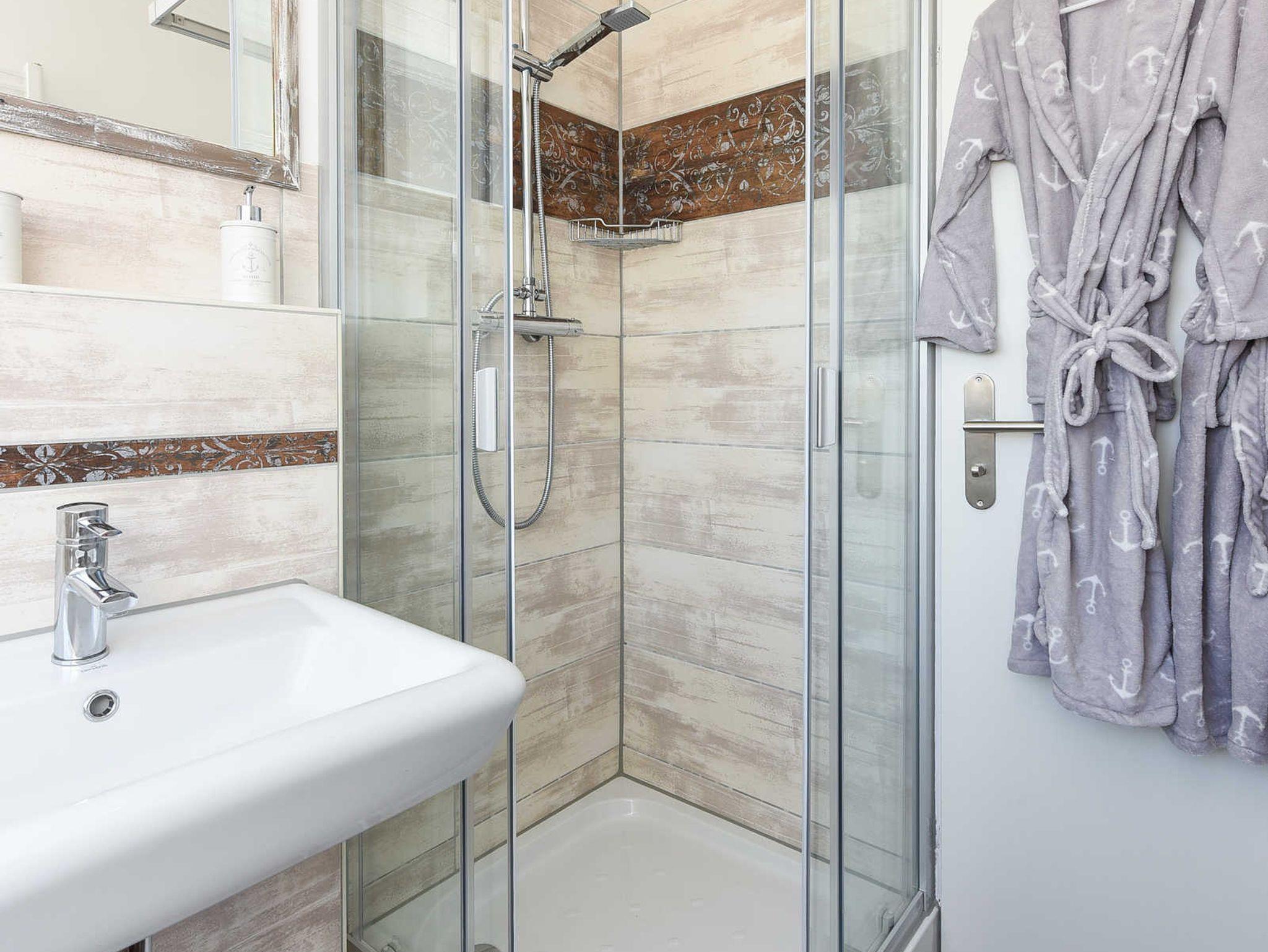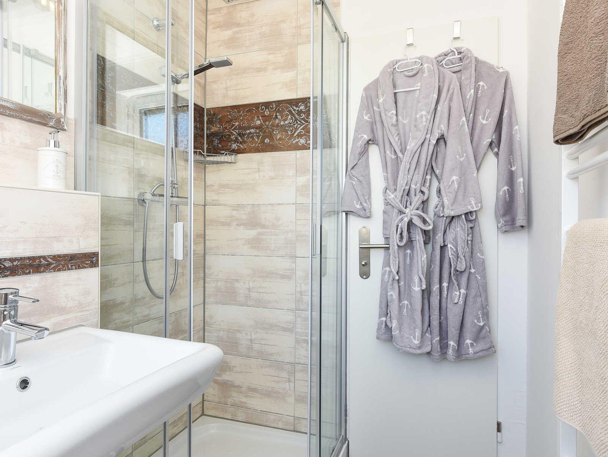 Badezimmer mit Dusche, Waschtisch und WC