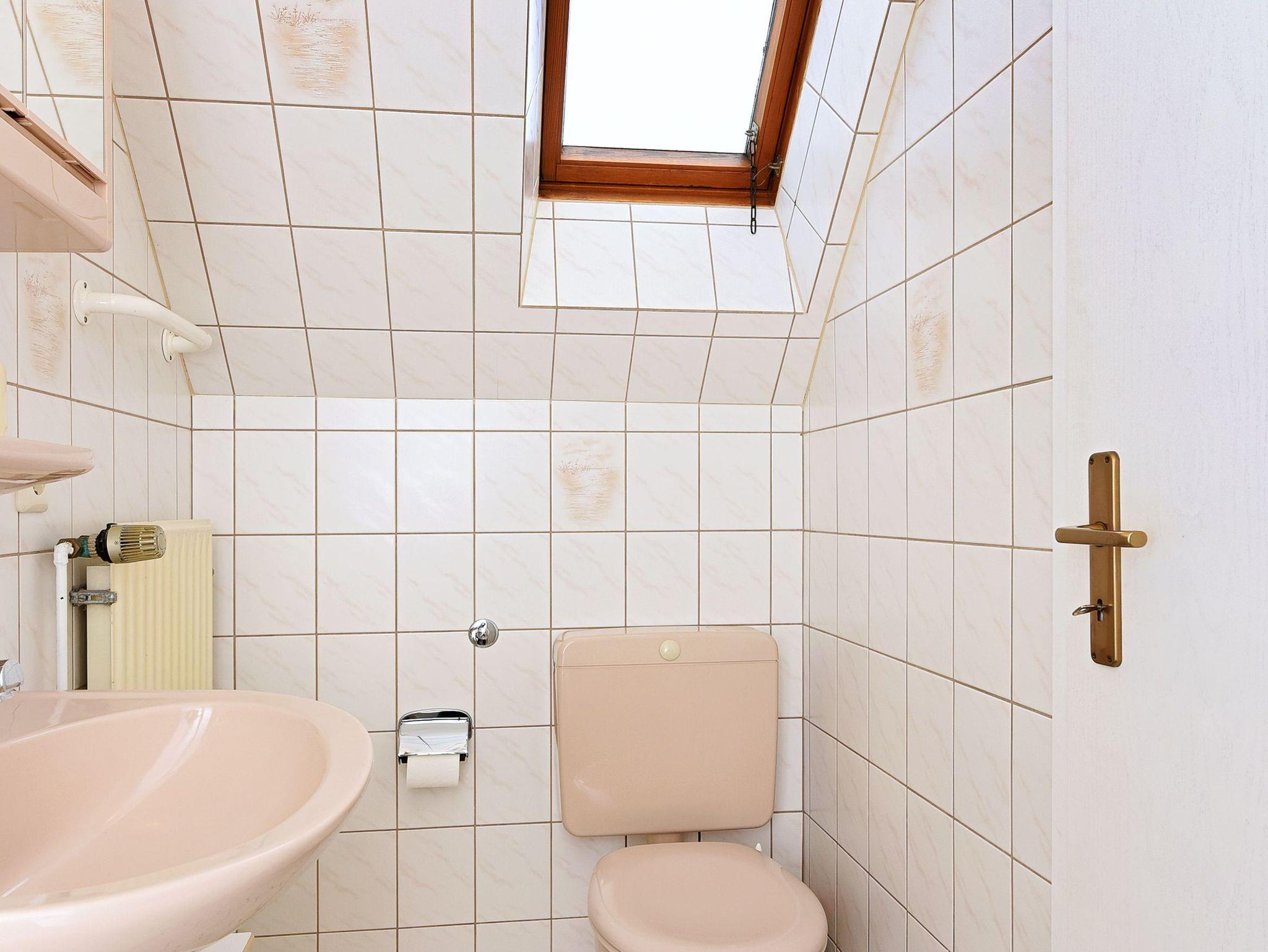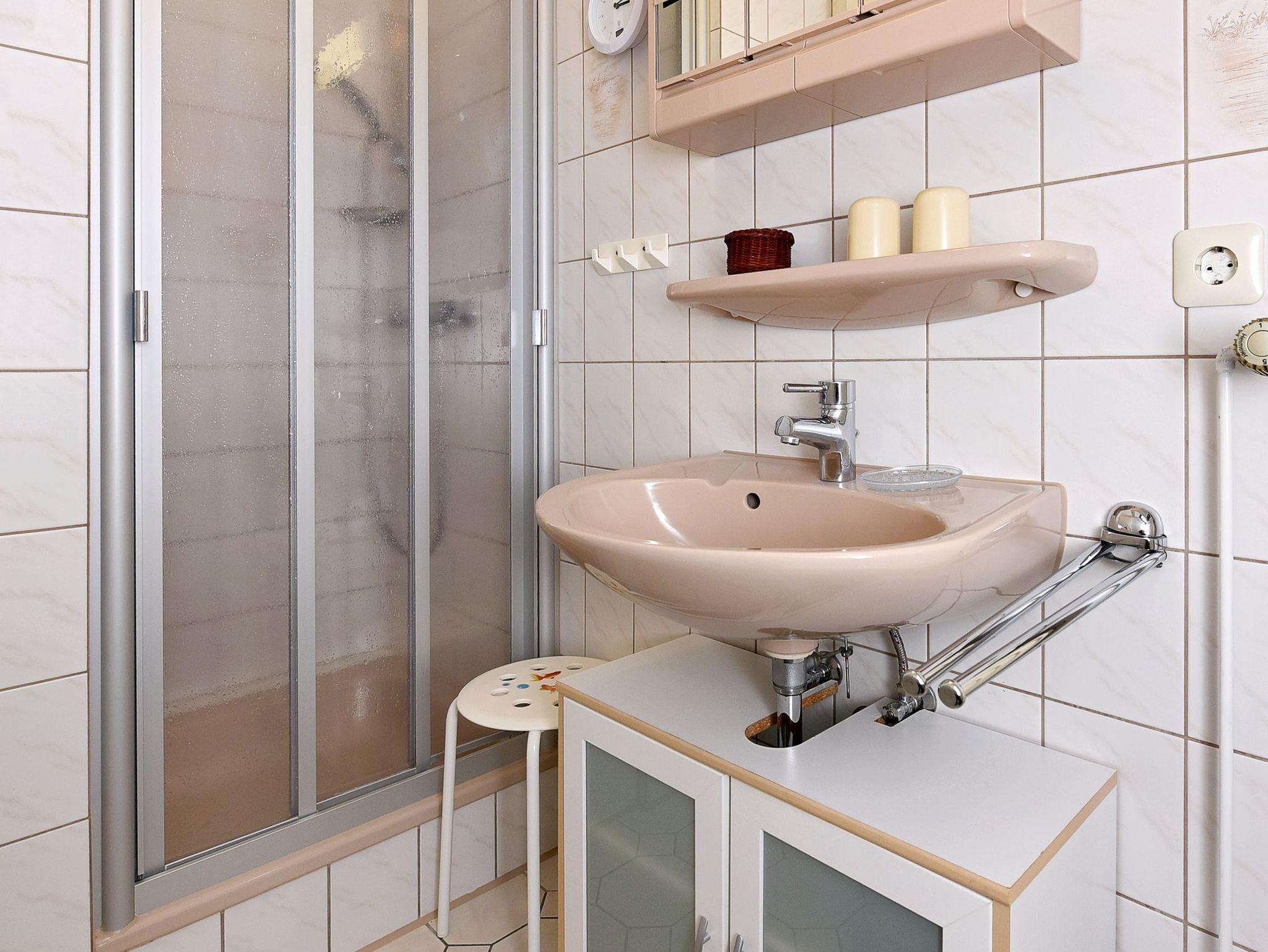 Badezimmer mit Dusche, Waschtisch und WC