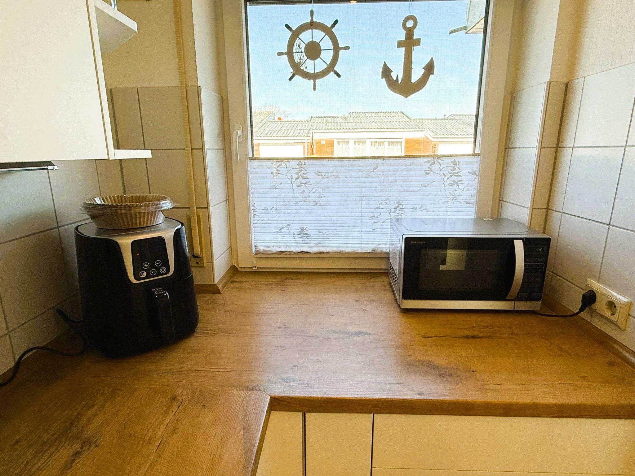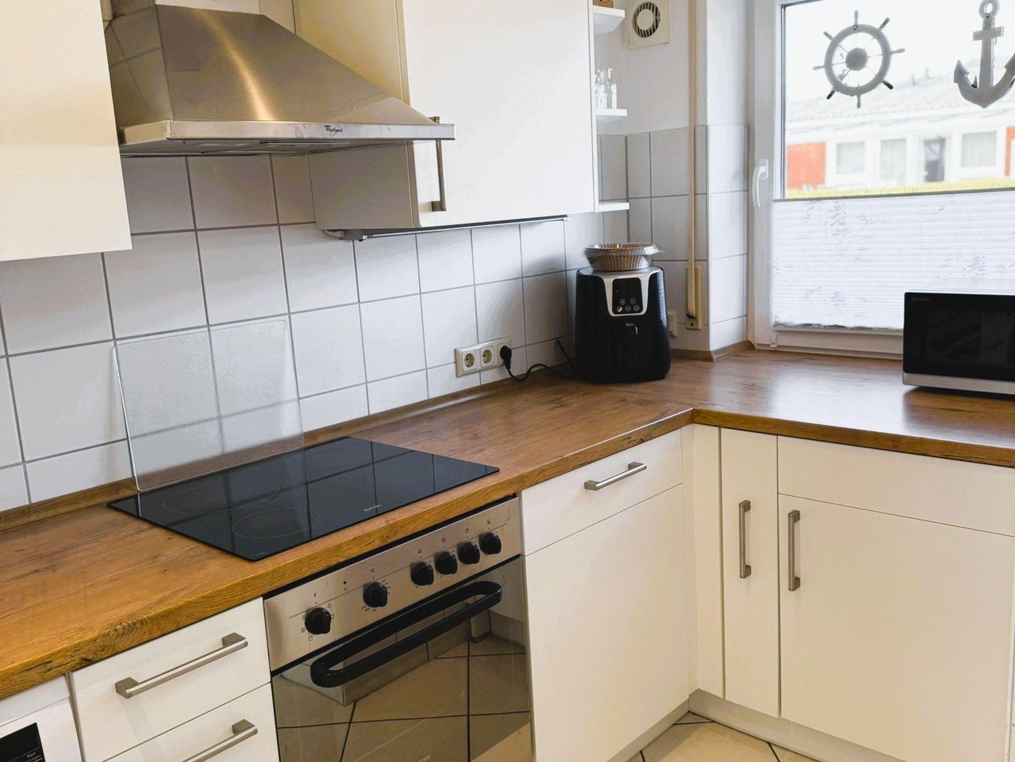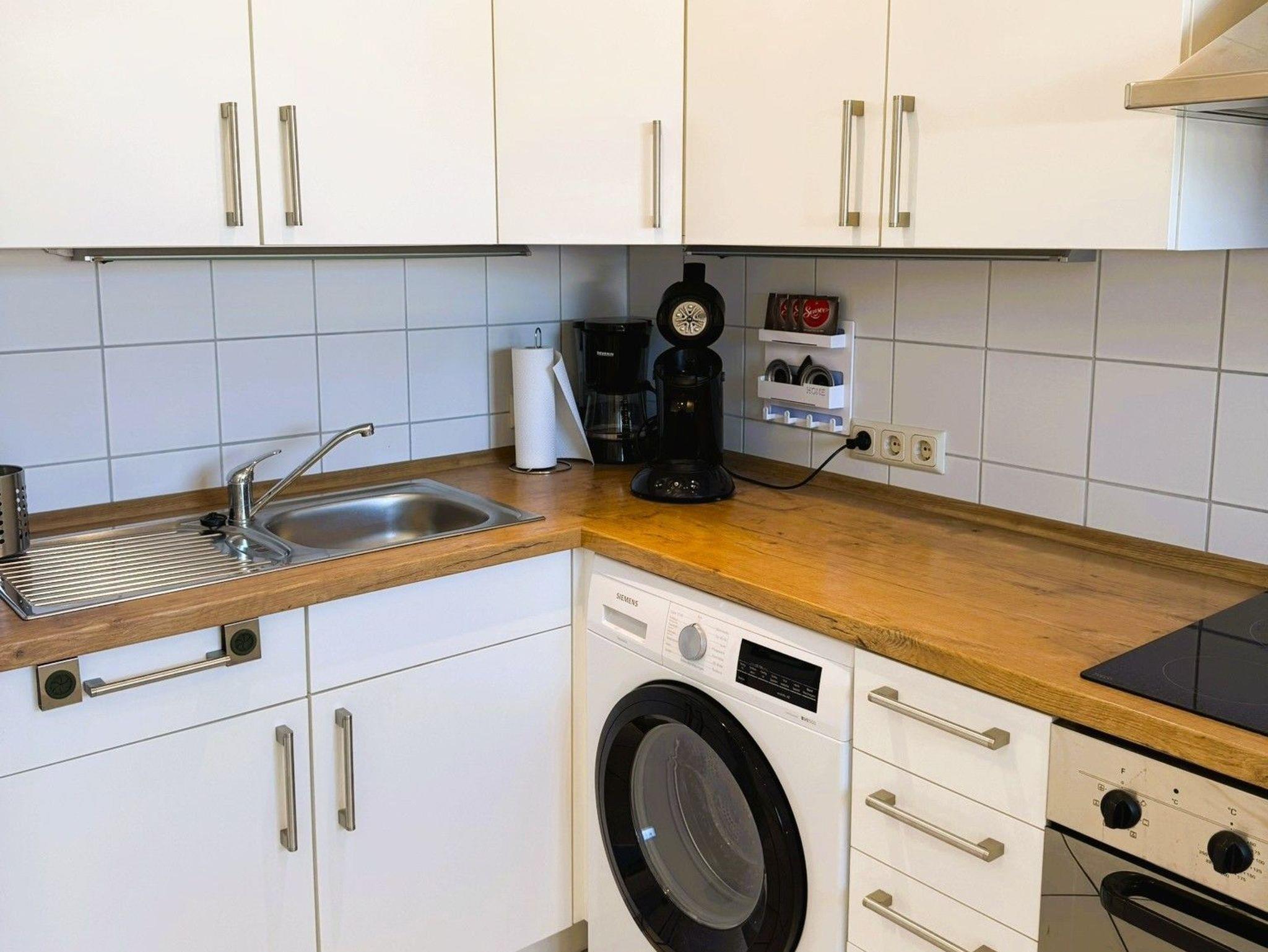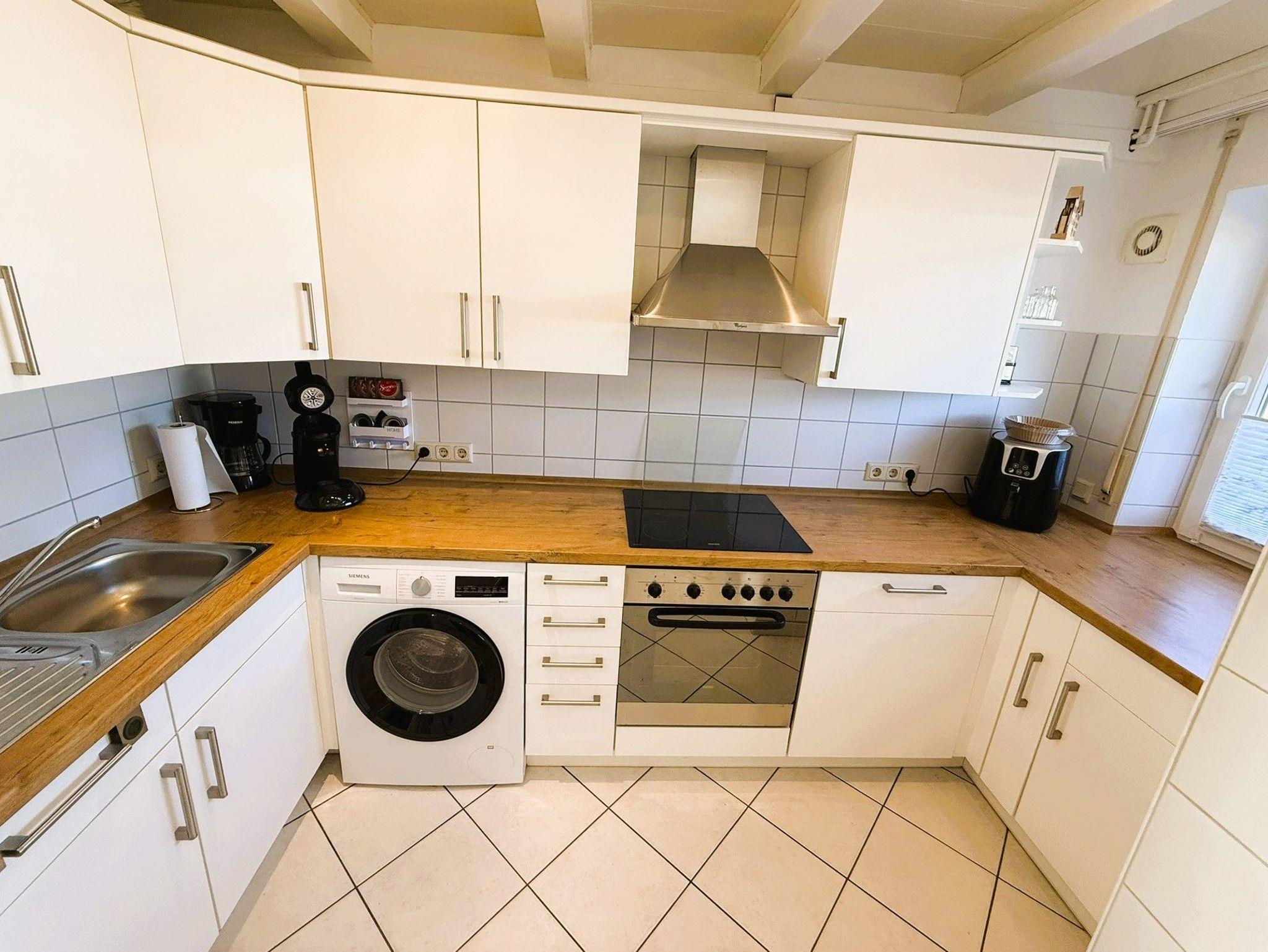 Gut ausgestattete Küche (Spülmaschine, Waschmaschine, Mikrowelle, Toaster, Mixer, Stabmixer, Backofen etc.). Es stehen eine Senseo Kaffeemaschine, eine Kaffeemaschine und eine Heißluftfritteuse zur Verfügung. 4 Küchentücher liegen für Sie bereit.