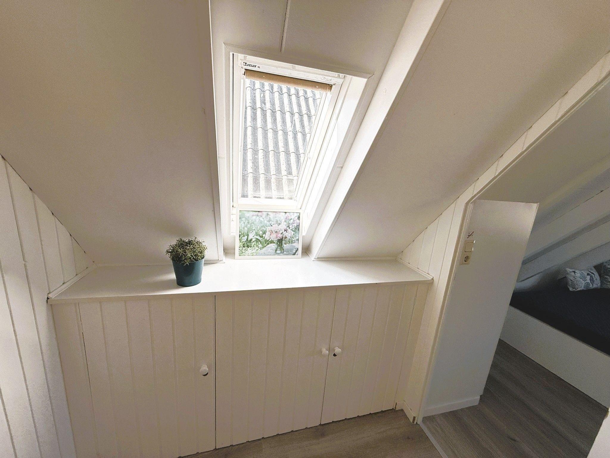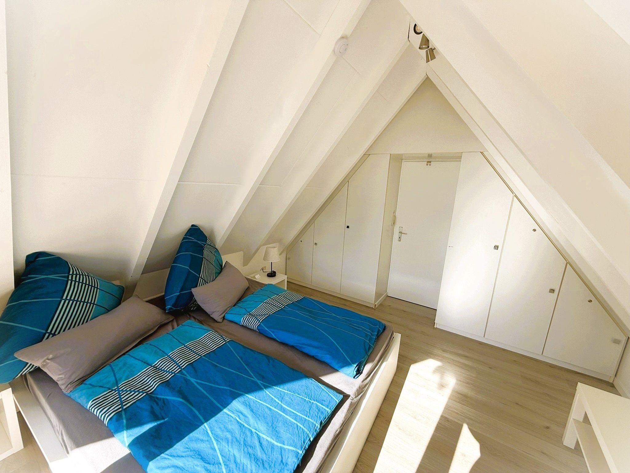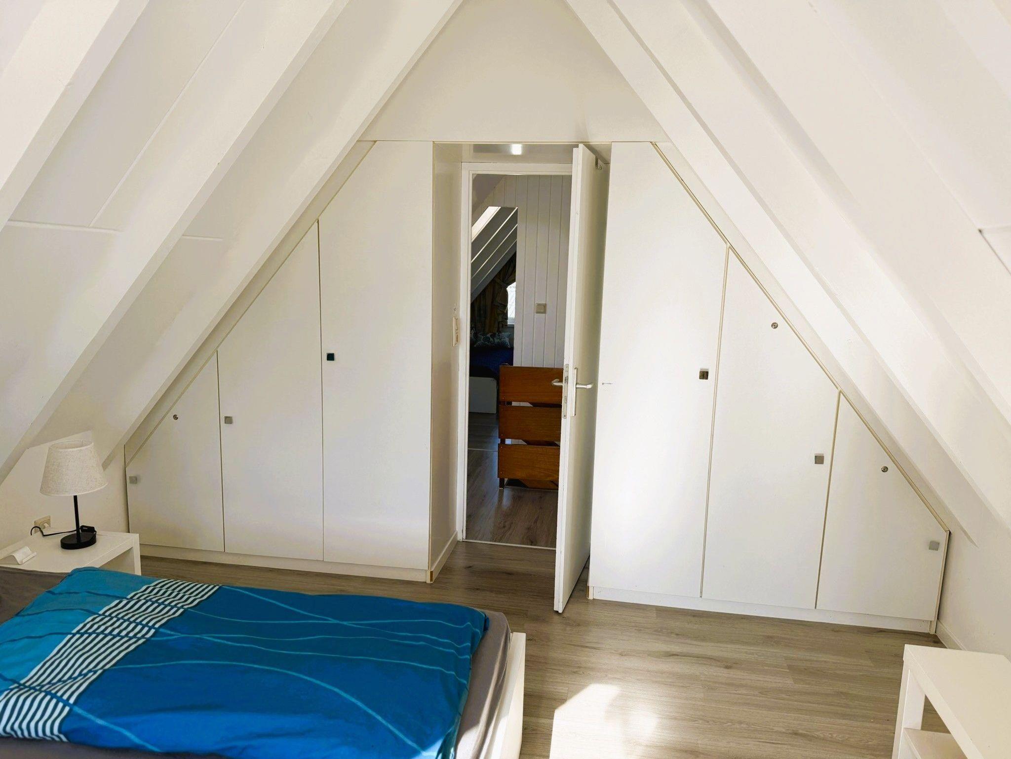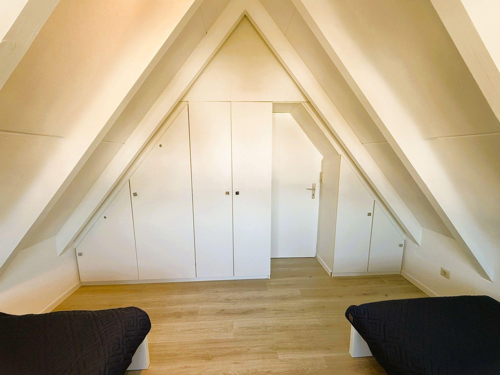 2. Schlafzimmer (Dachgeschoss) mit 2 feststehenden Einzelbetten und Einbau-Kleiderschränken. Auch dieses Zimmer bietet viel Platz.