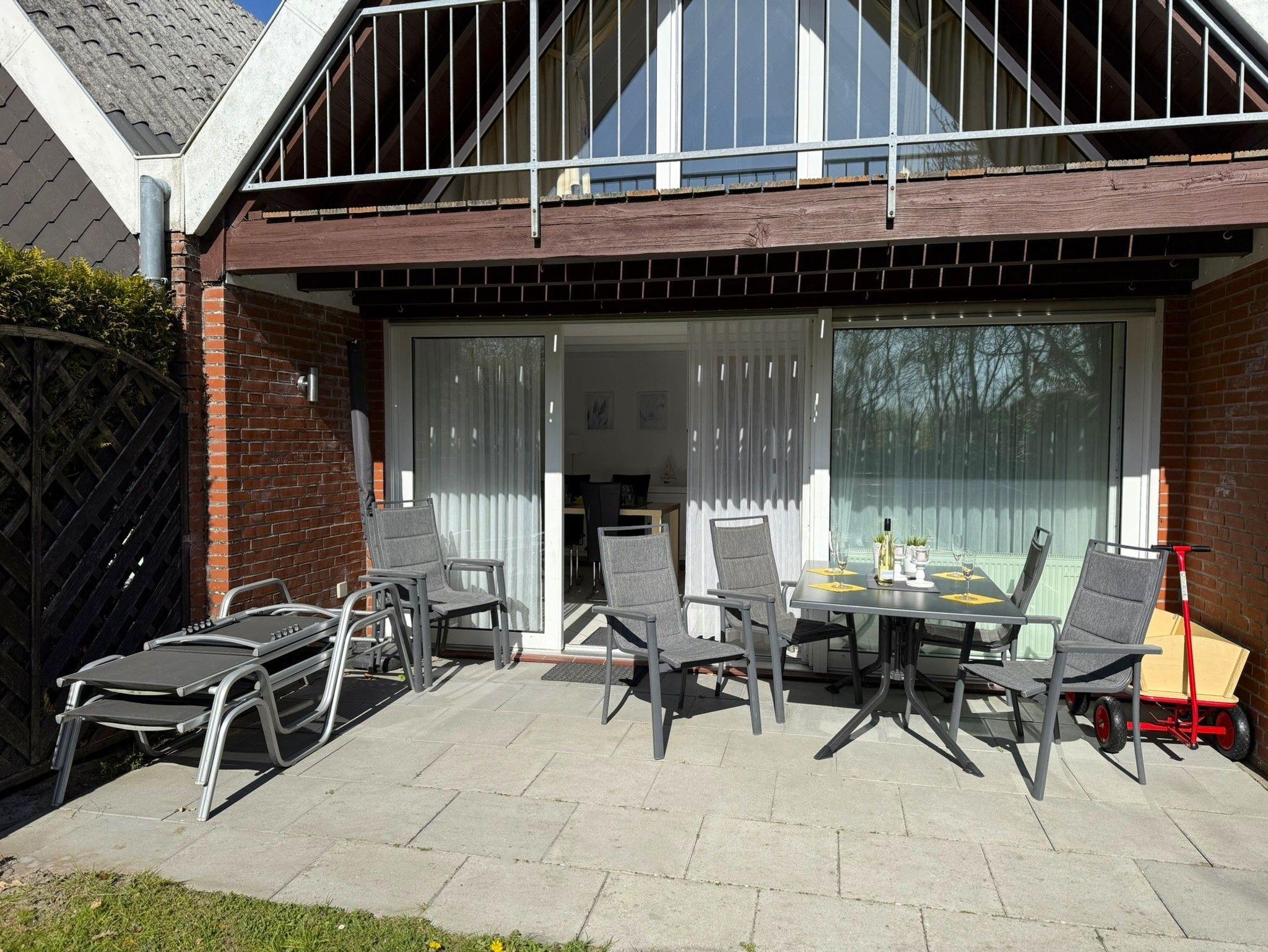 • Die Terrasse mit überdachter Sitzecke, Liegestühle, Grill ist durch eine Hecke geschützt.