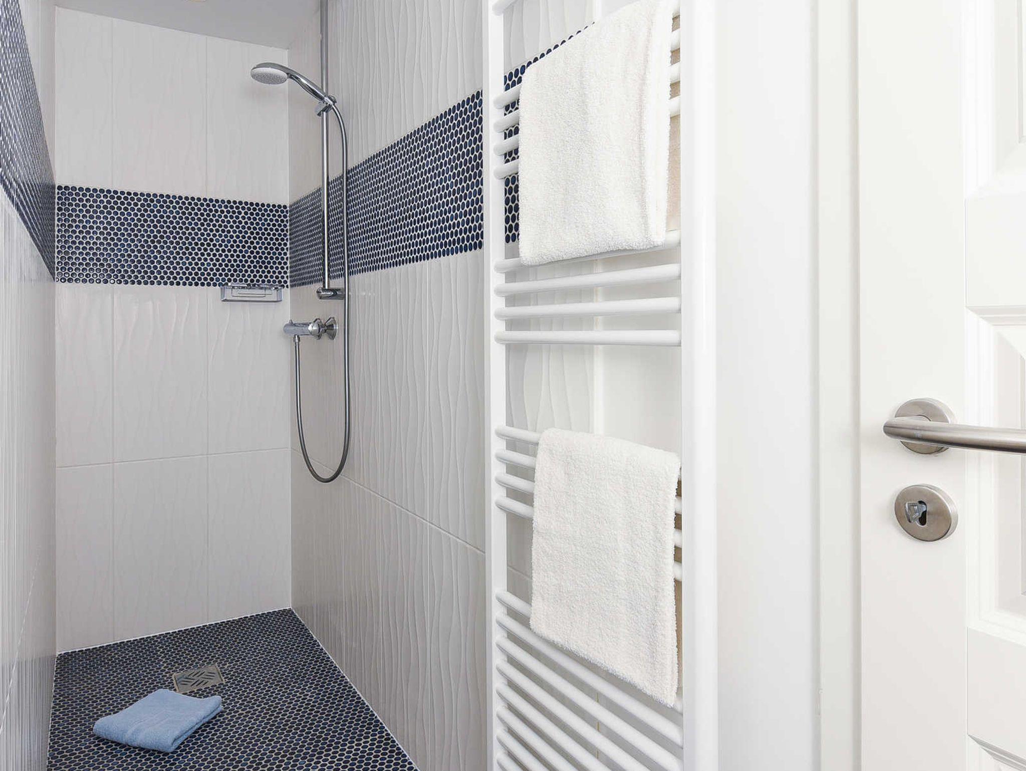 Badezimmer mit Dusche, Waschtisch und WC