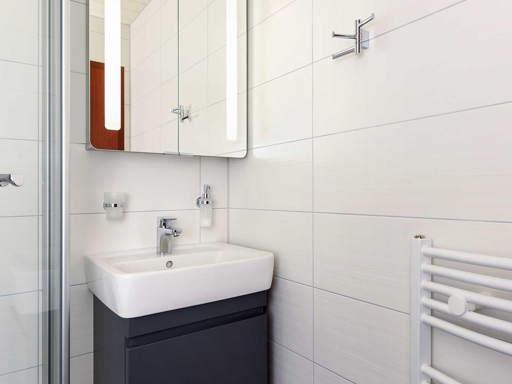 Badezimmer mit Dusche, Waschtisch und WC