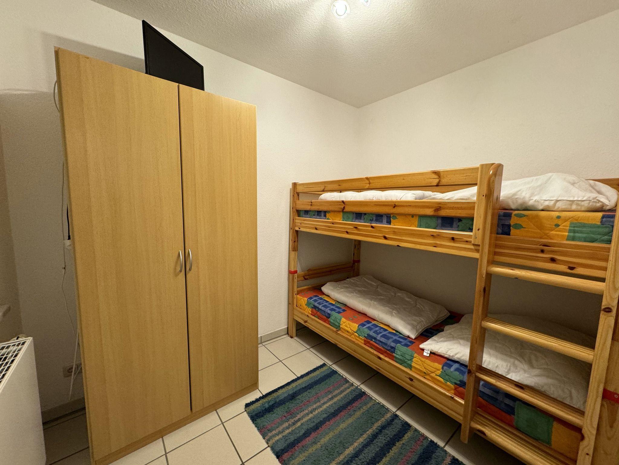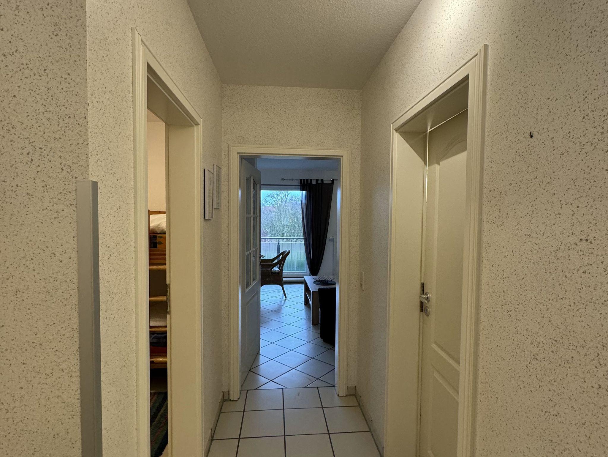 Ferienwohnung Seekuh, Wohnzimmer mit Essbereich und Küche, Flur, Badezimmer mit Dusche und WC, Elternschlafzimmer, Kinderschlafzimmer mit Etagenbett, Balkon, Tiefgaragenstellplatz