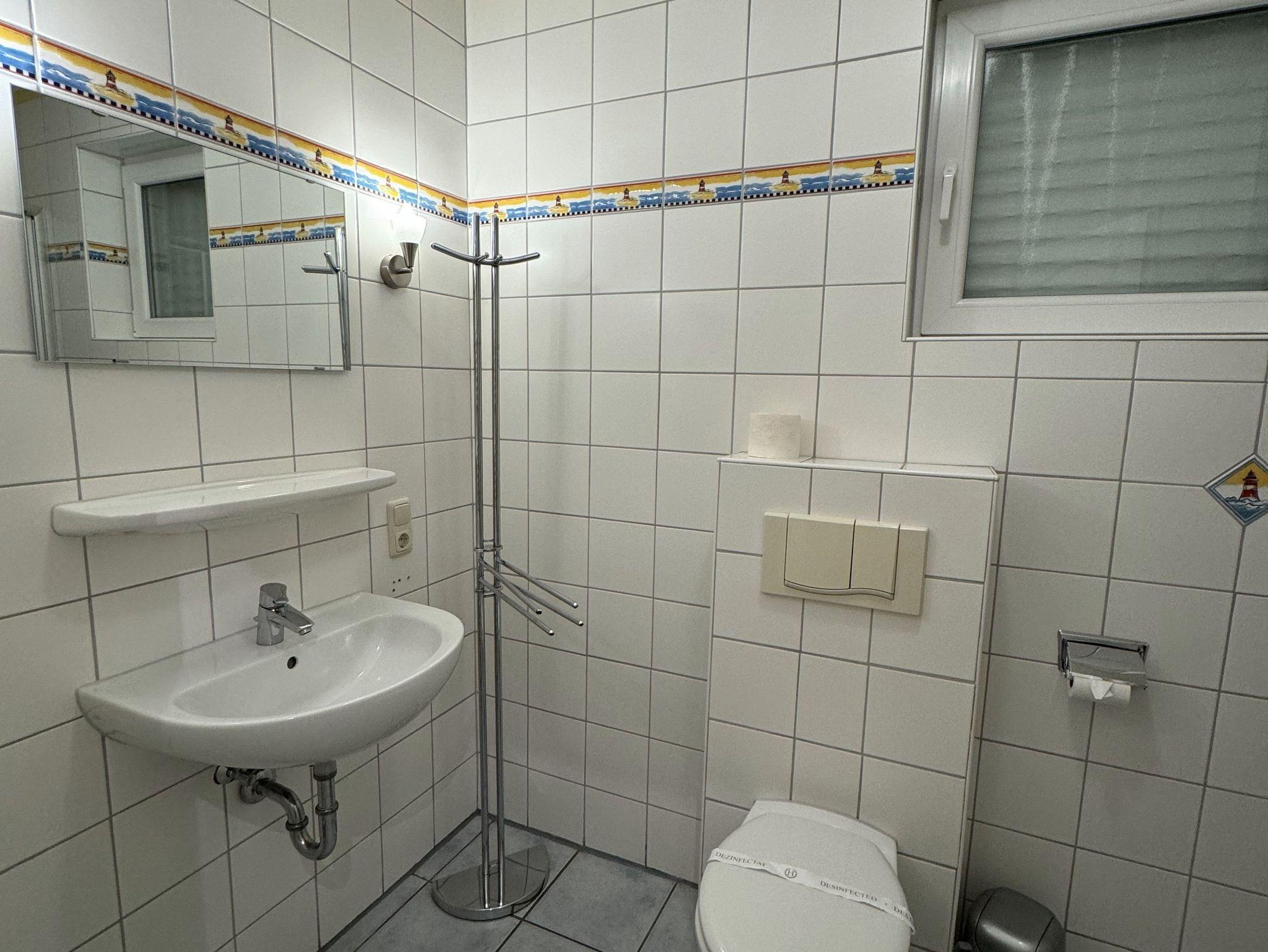 Badezimmer mit Dusche, Waschtisch und WC