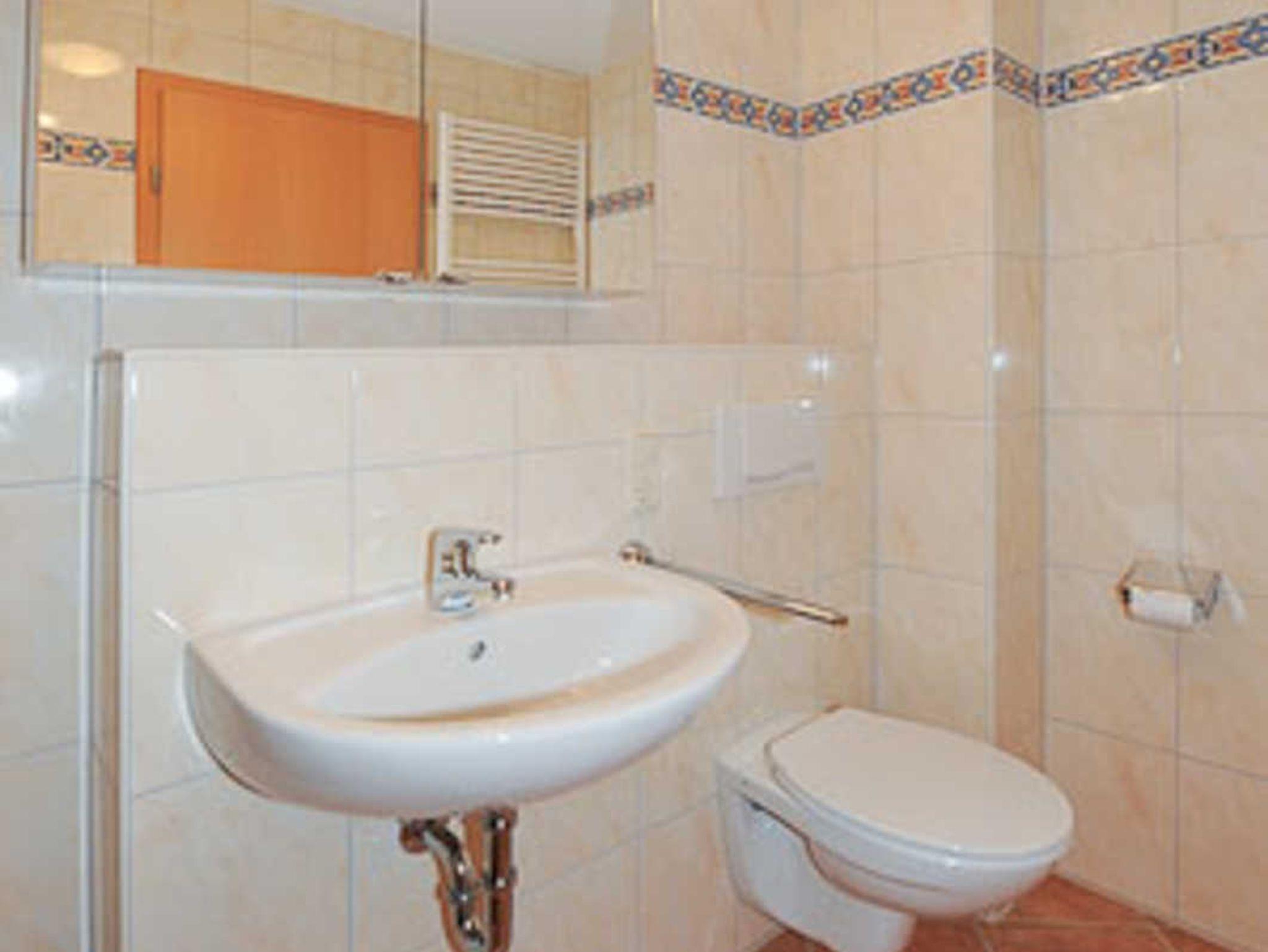 Badezimmer mit Dusche, Waschtisch und WC