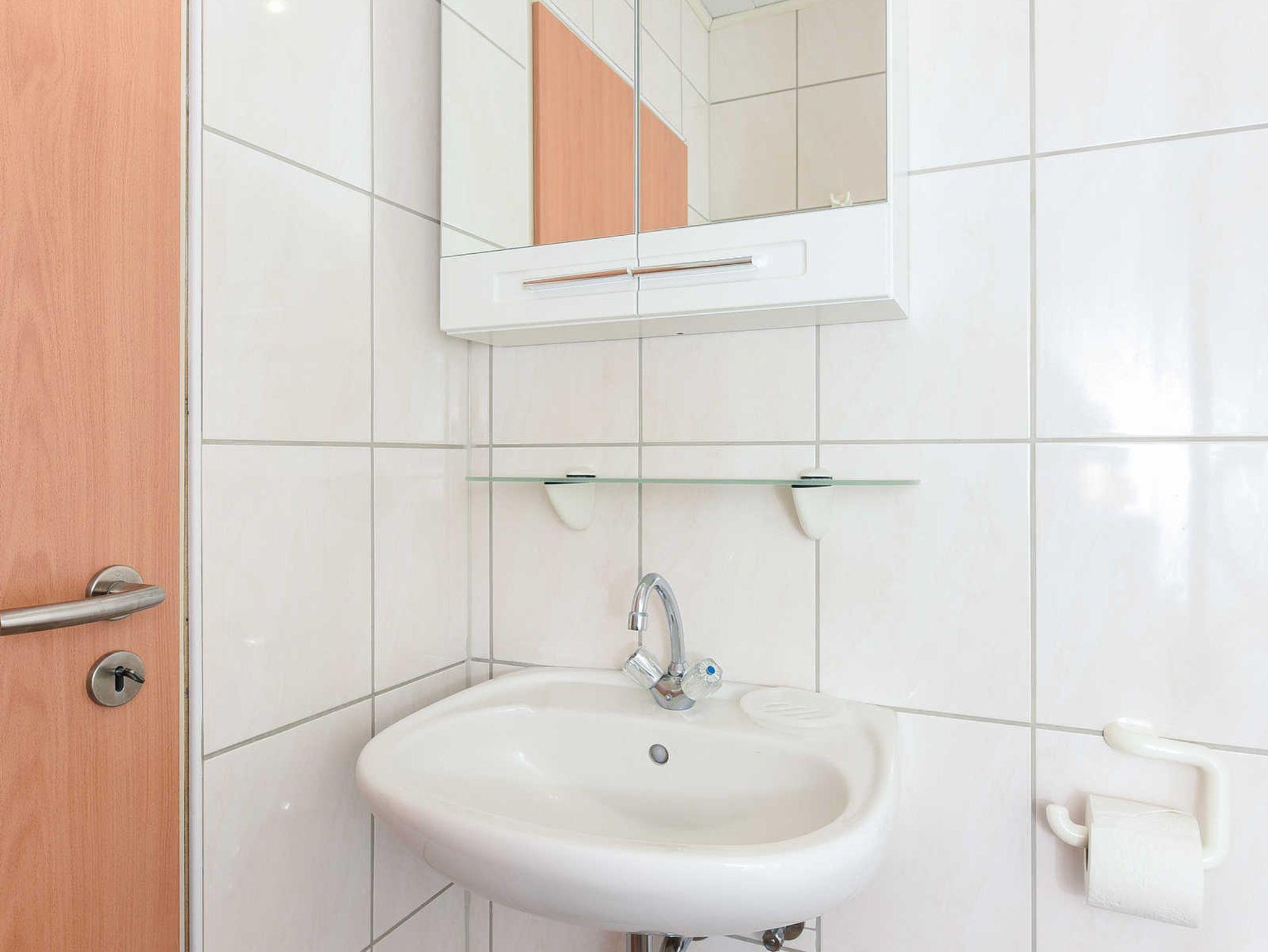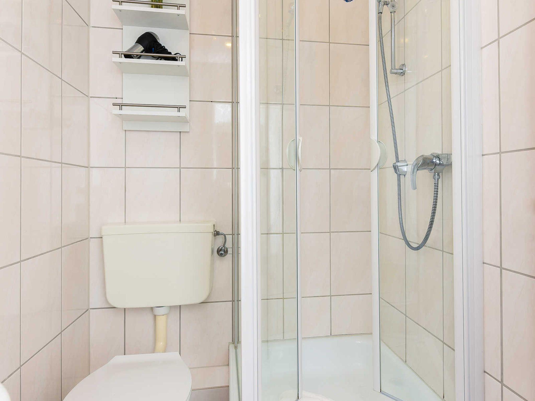 Badezimmer mit Dusche, Waschtisch und WC