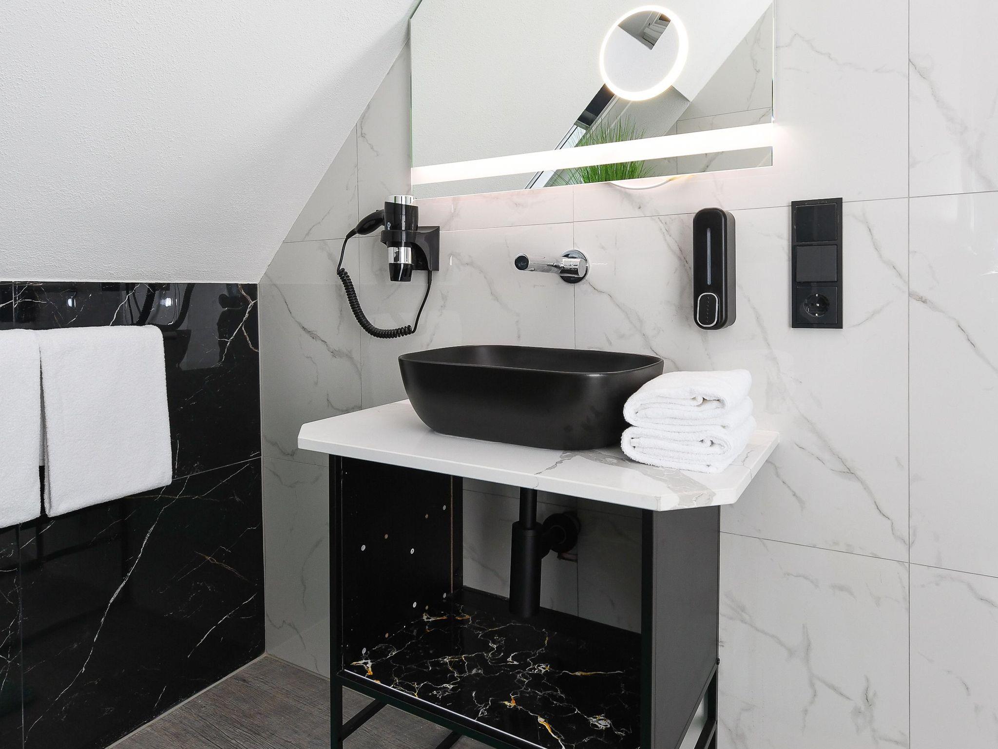 Badezimmer mit Dusche, Waschtisch und WC