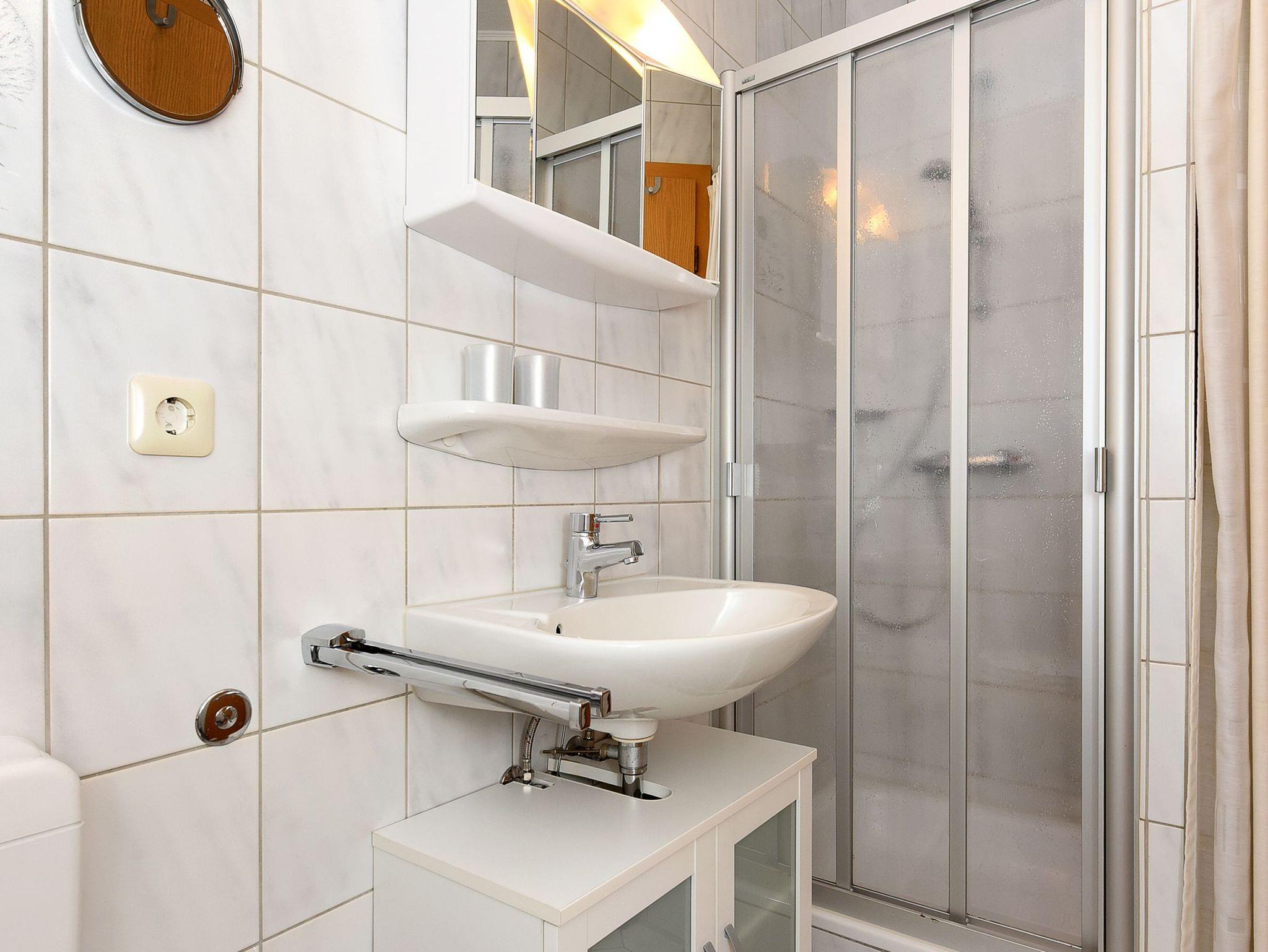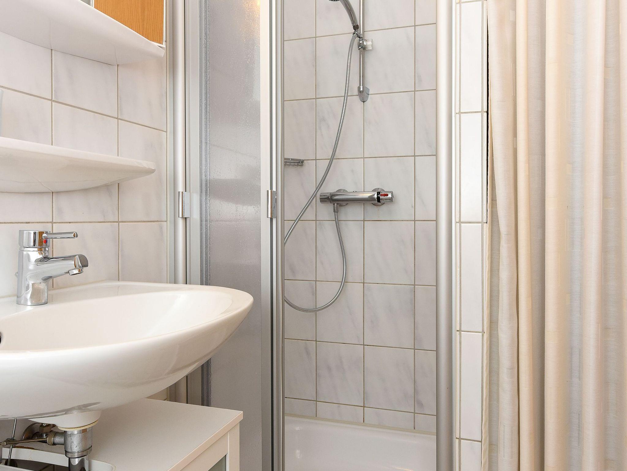 Badezimmer mit Dusche, Waschtisch und WC