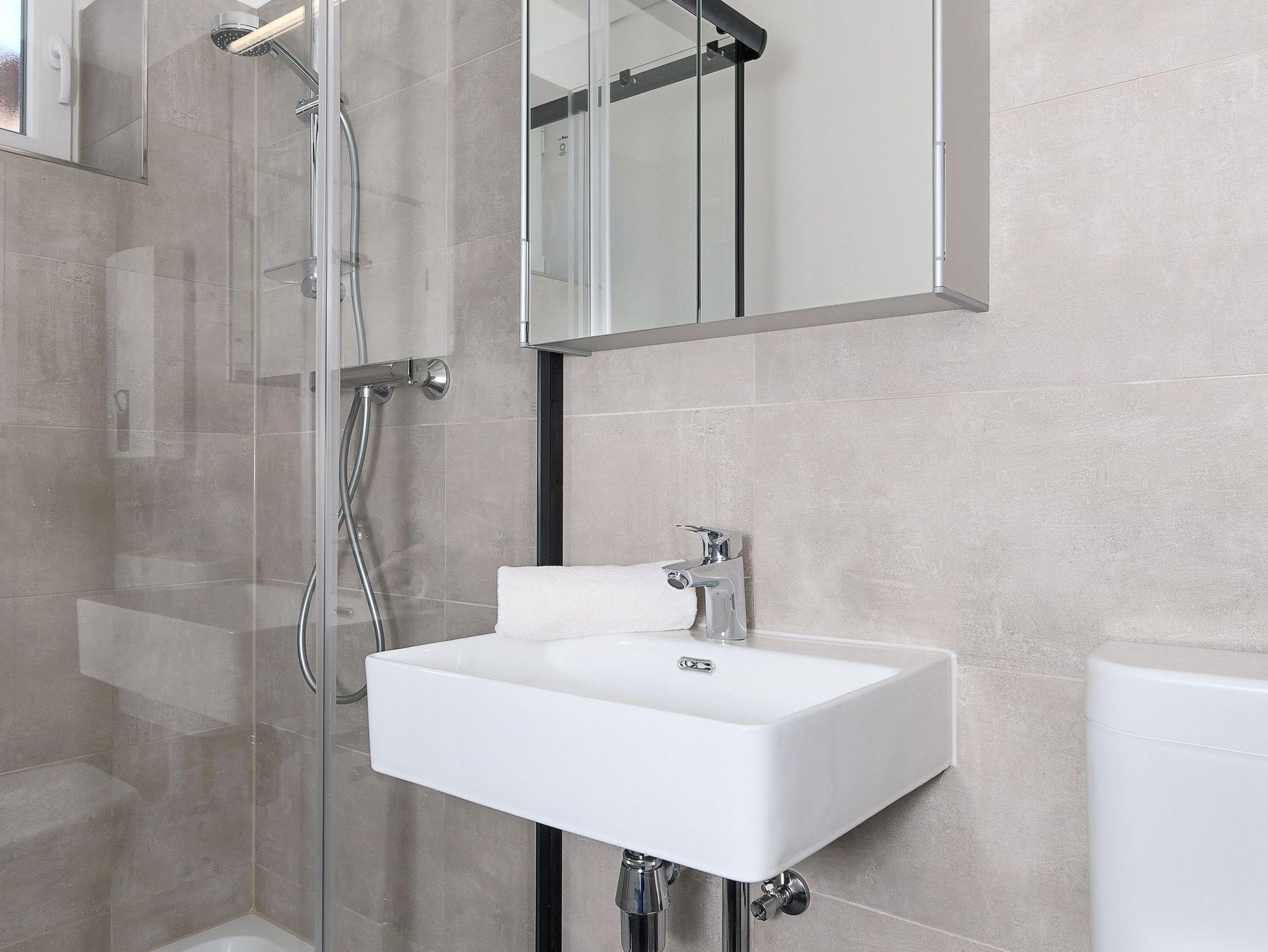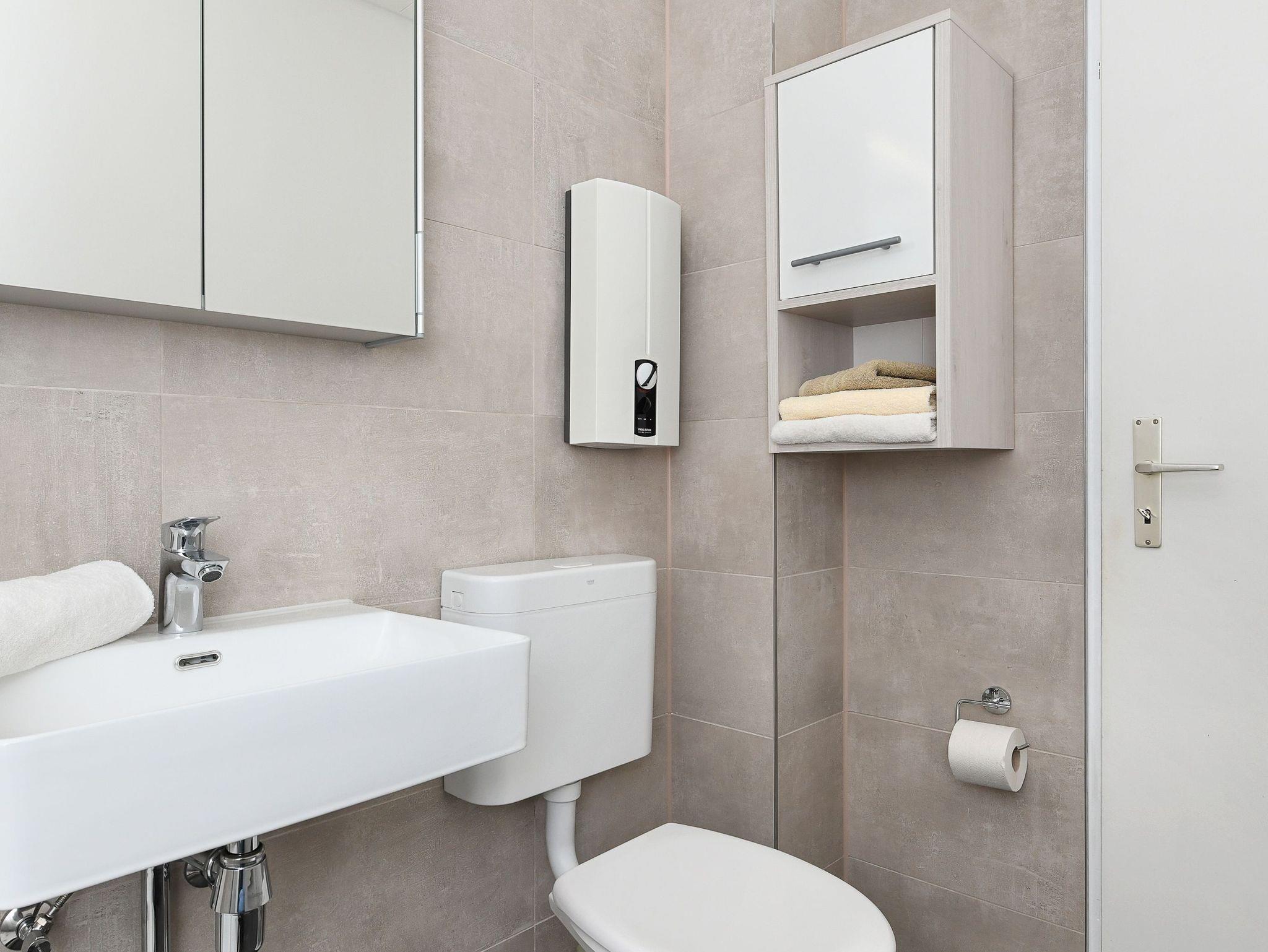 Badezimmer mit Dusche, Waschtisch und WC