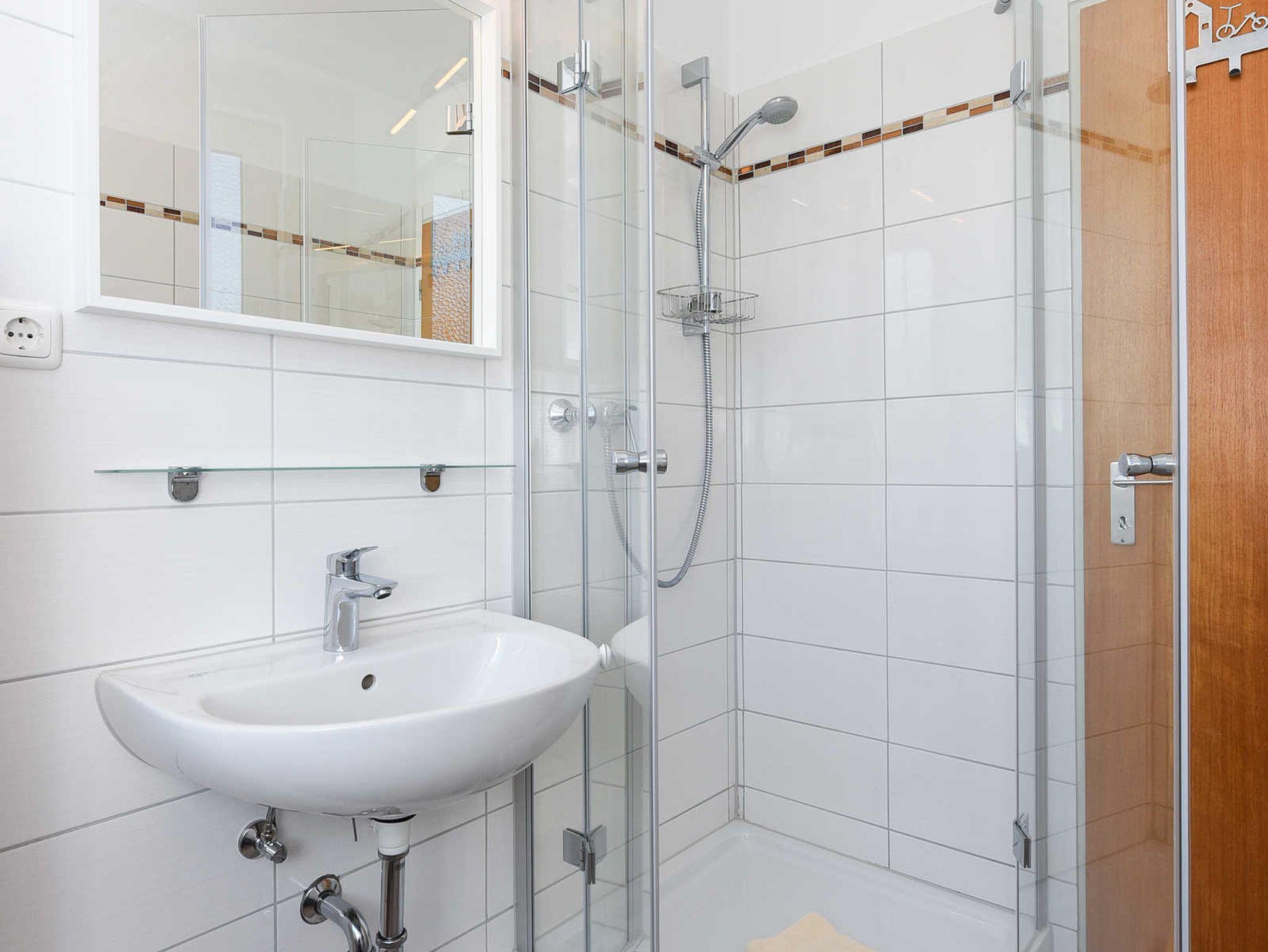 Badezimmer mit Dusche, Waschtisch und WC