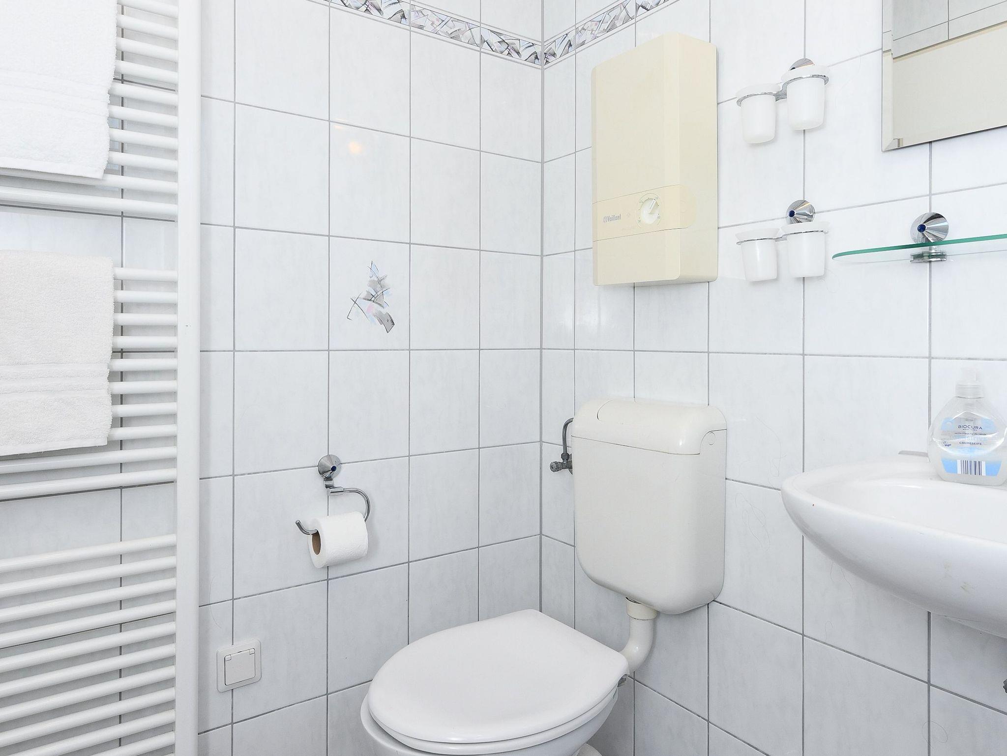Badezimmer mit Dusche, Waschtisch und WC