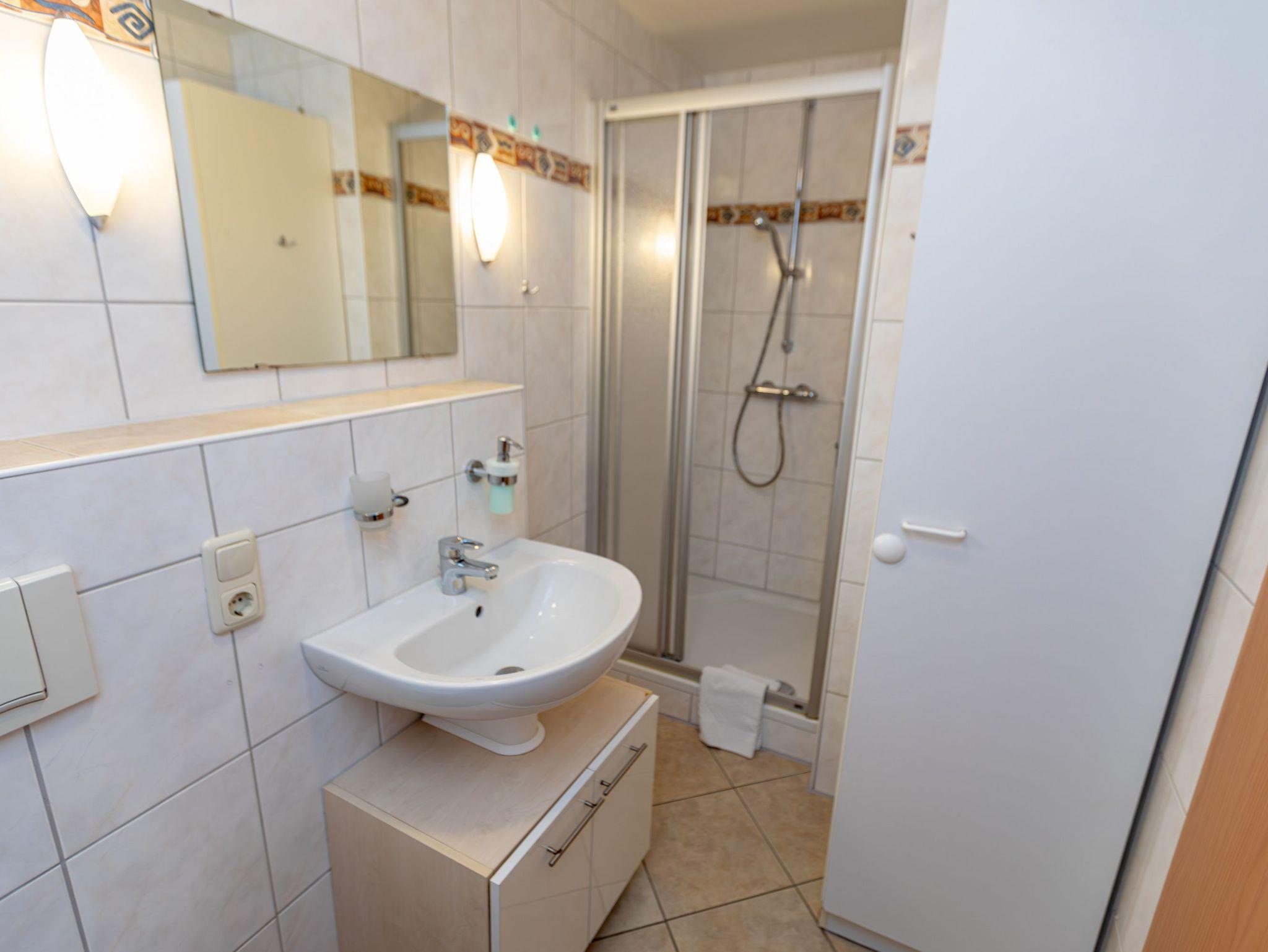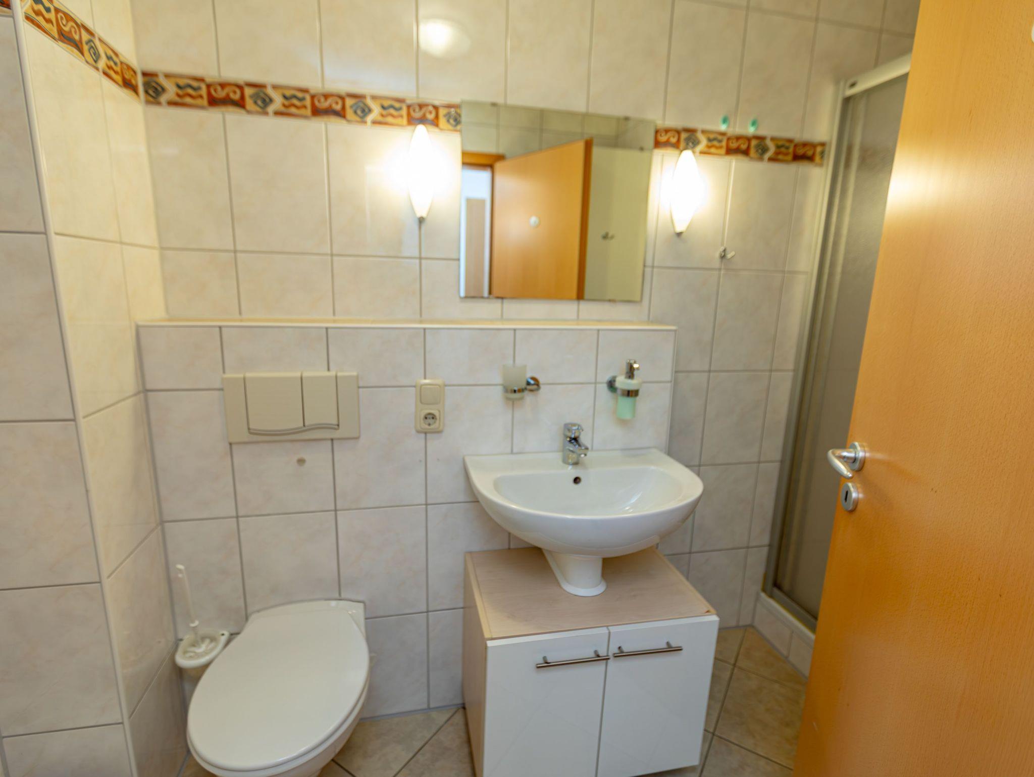 - Badezimmer mit Dusche, Waschtisch und WC