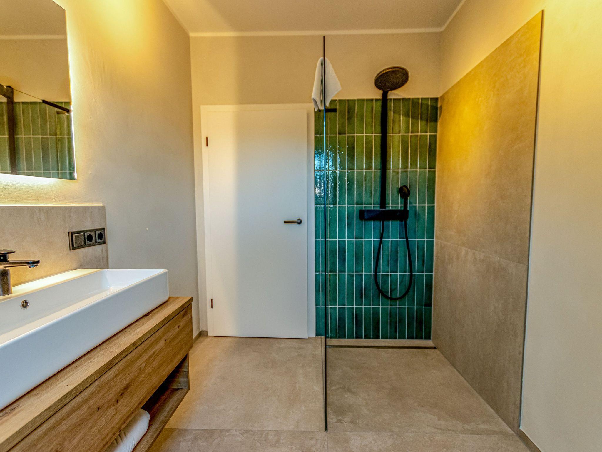Großzügiges, modernes Badezimmer mit einer großen, geräumigen und sehr modernen Duscharmatur.