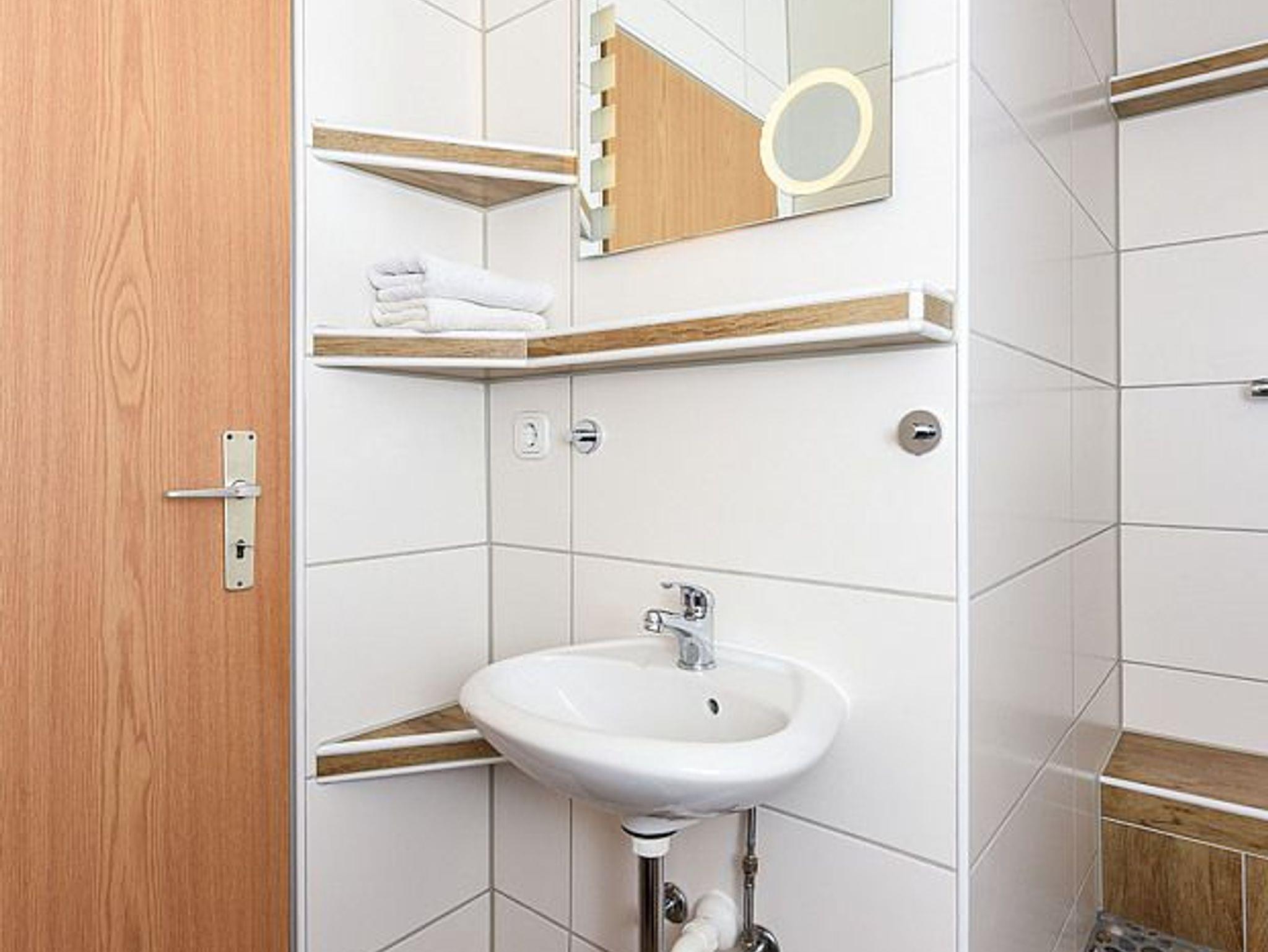 Badezimmer mit Dusche, Waschtisch und WC