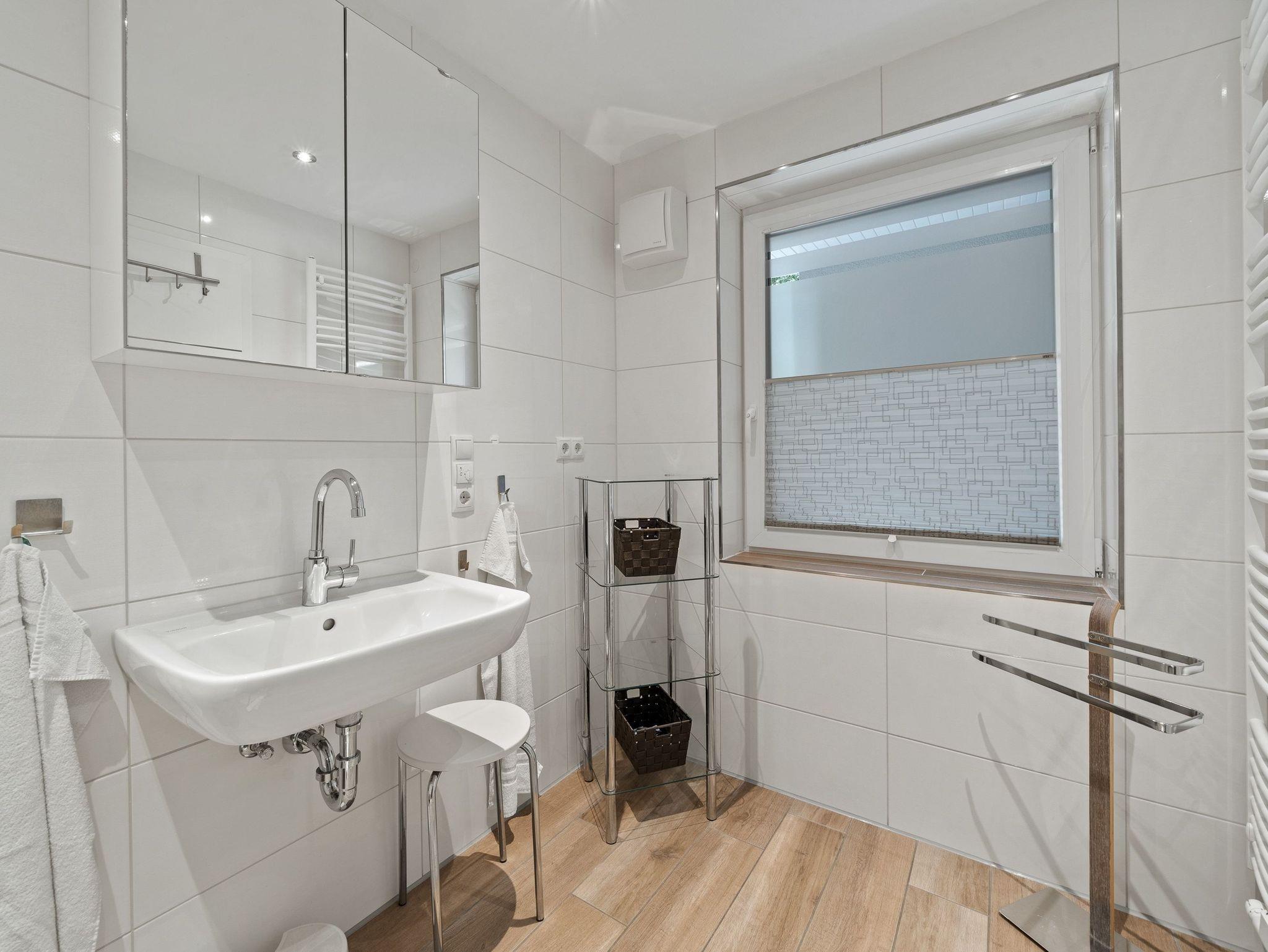 - Badezimmer mit Dusche, Waschtisch und WC