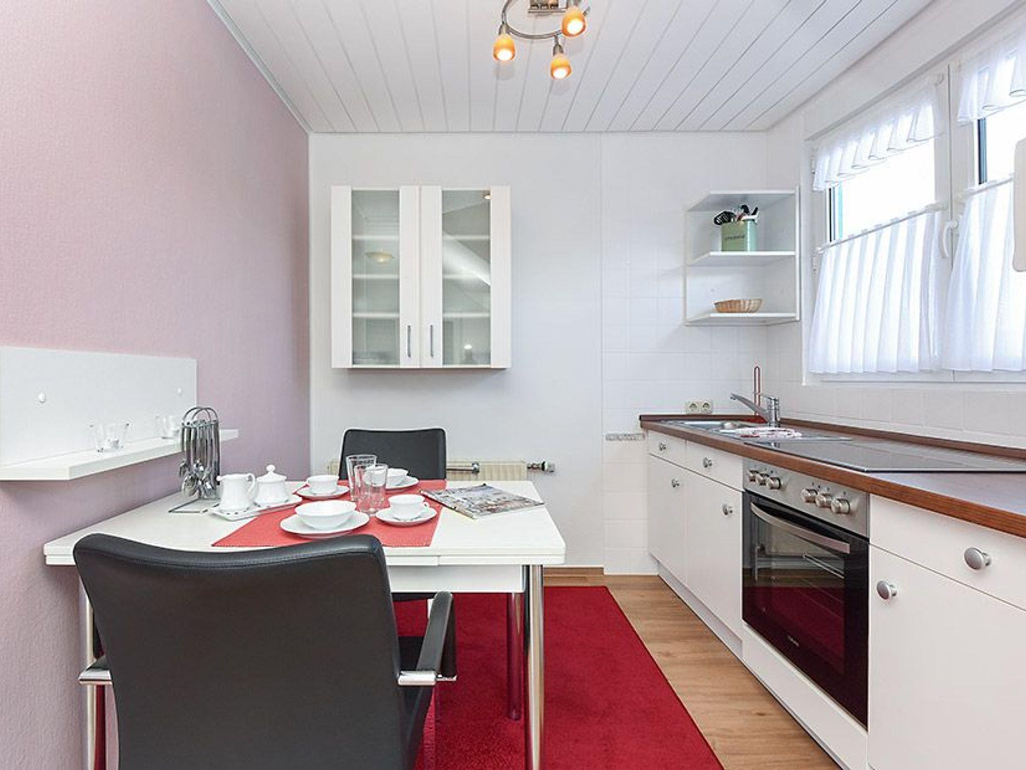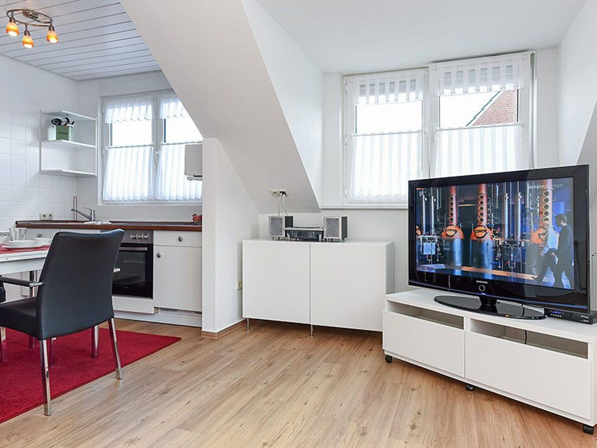 Größe ca. 50 Quadratmeter, Wohnraum mit integrierter Küche, Schlafzimmer, Badezimmer mit Dusche, Waschtisch und WC, Obergeschoss, Balkon, optimal für 1 bis 2 Personen.
