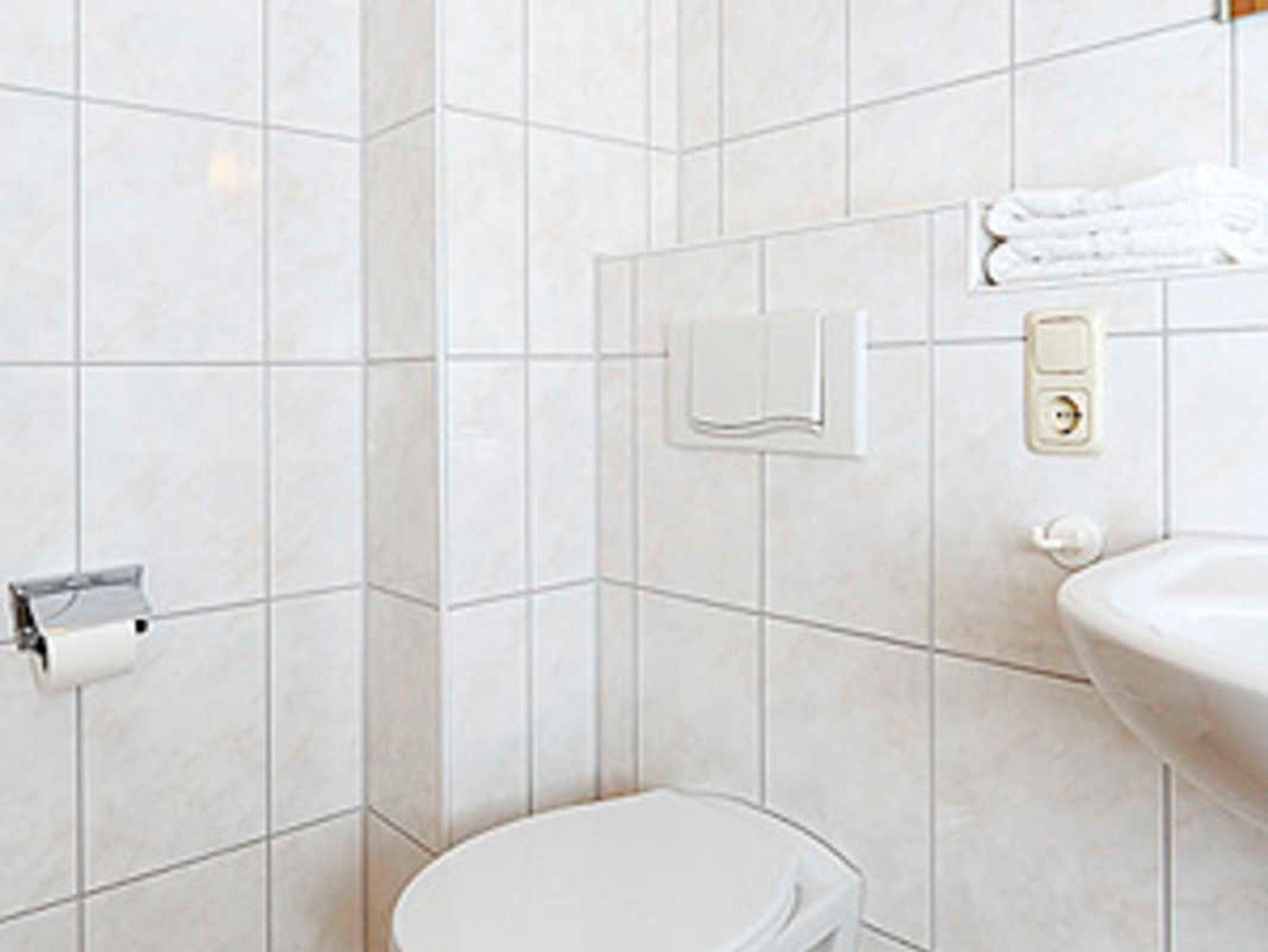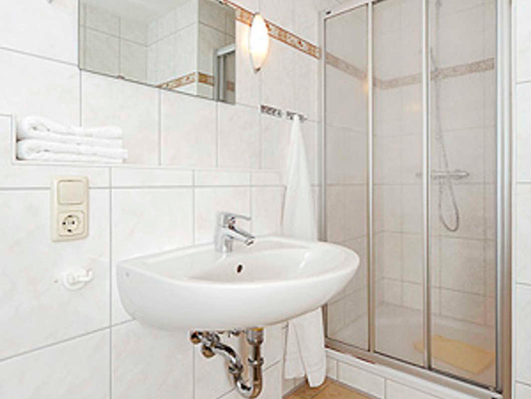 Badezimmer mit Dusche, Waschtisch und WC