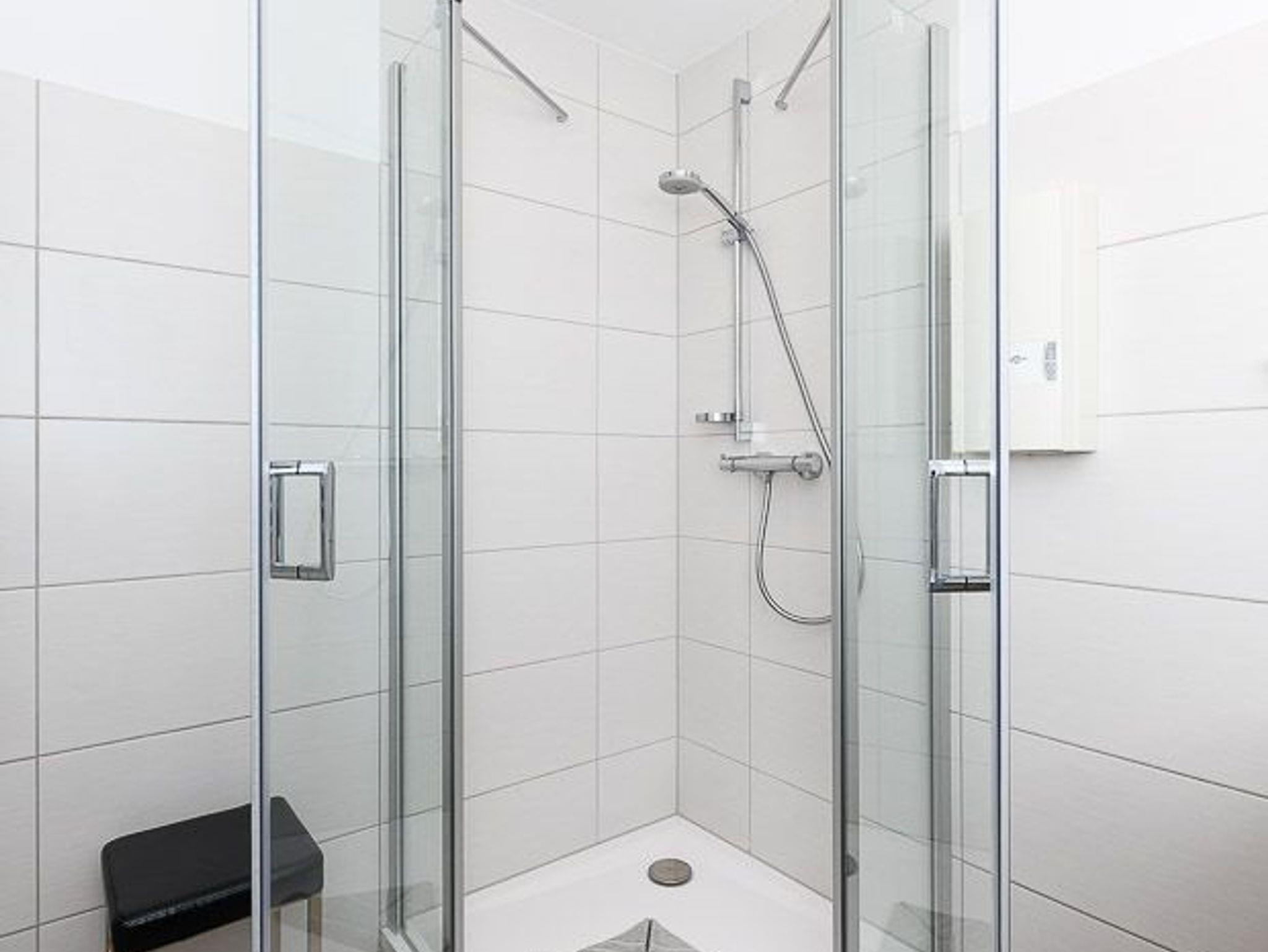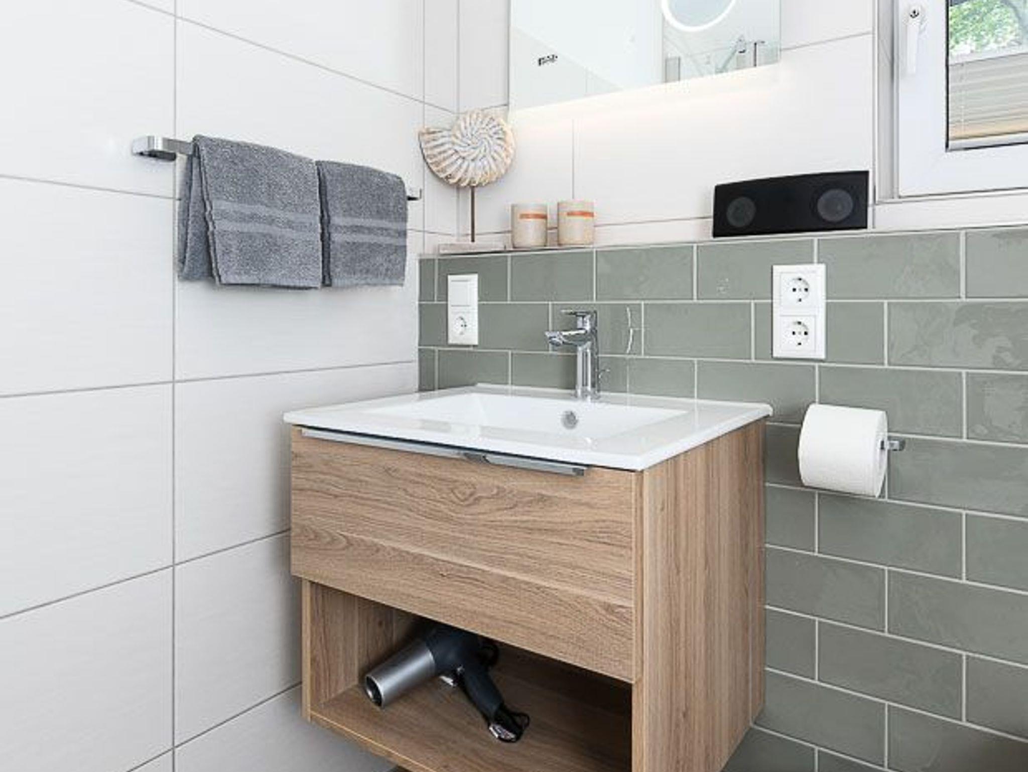 Badezimmer mit Dusche, Waschtisch und WC