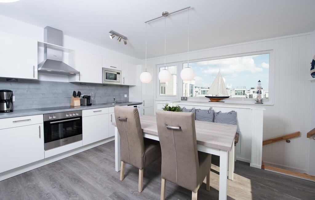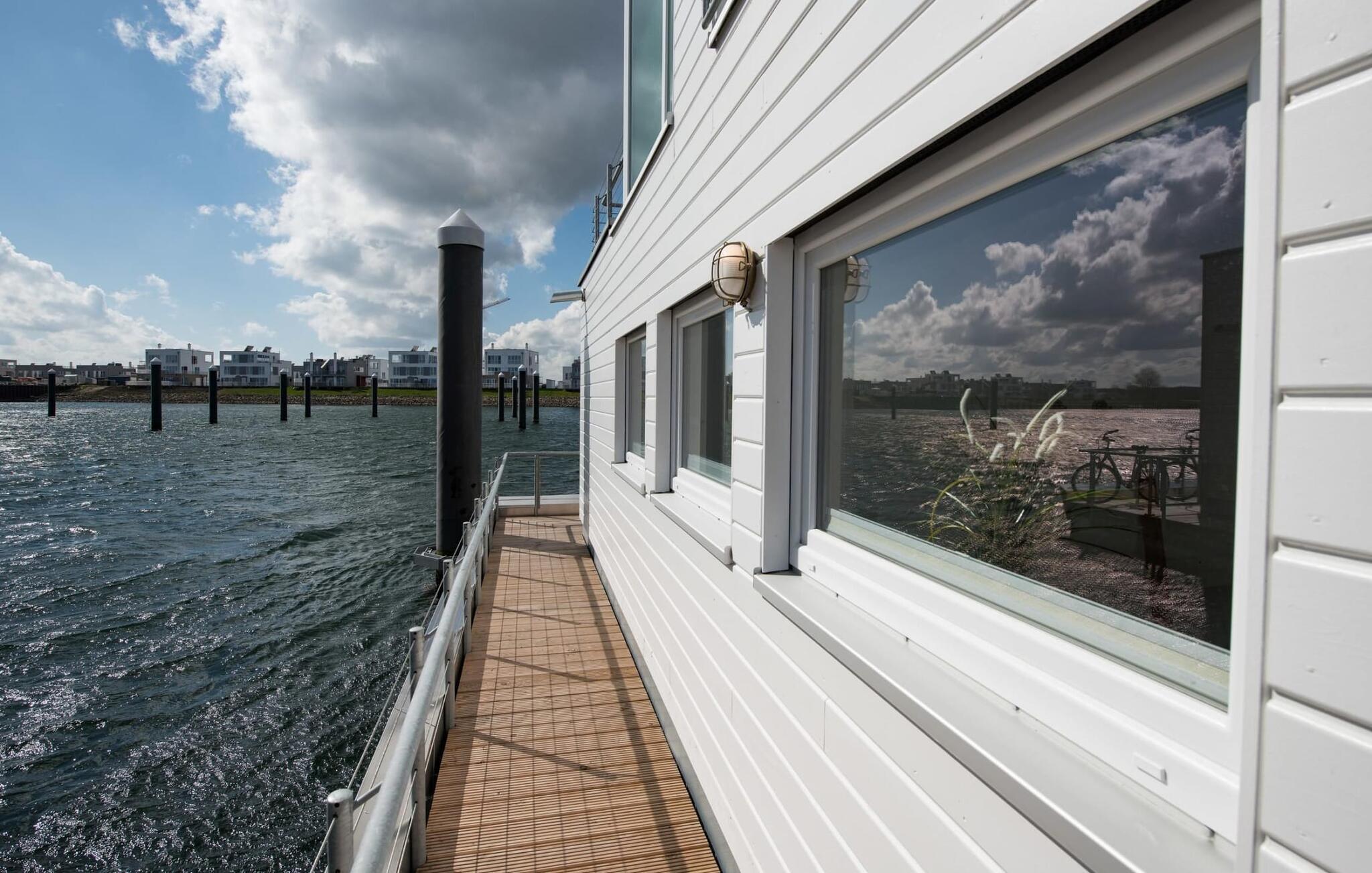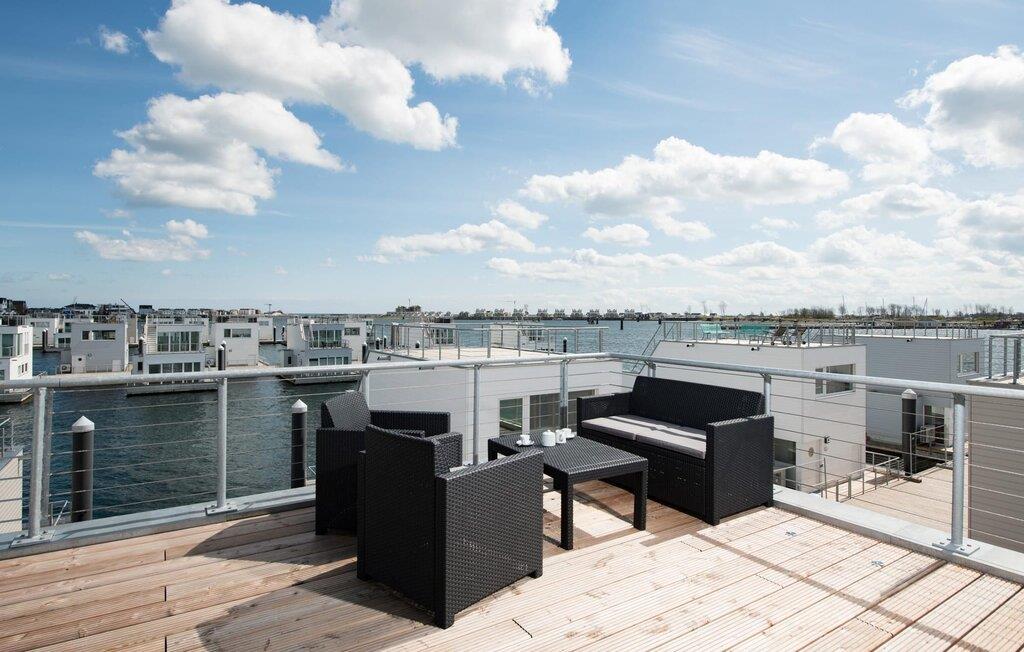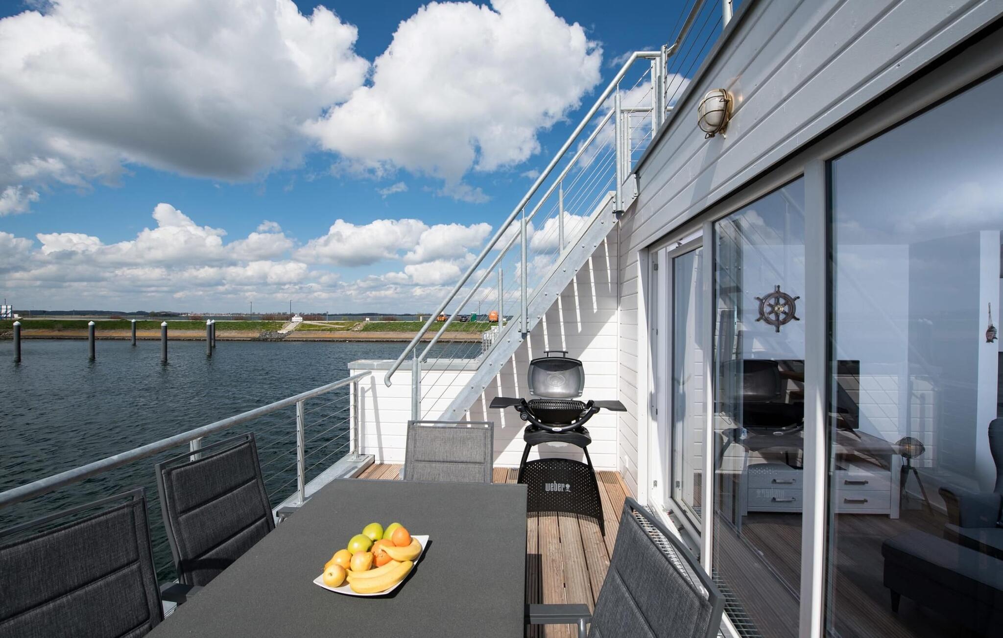 Det flytende huset strekker seg over tre nivåer. Den åpne stue- og spisestuen med utsikt over vannet, fullt utstyrt kjøkken og tilstøtende terrasse ligger i øverste etasje. Herfra har du tilgang til den spektakulære takterrassen med utsikt over seil- og sportsbåthavnen, Schlei og dens munning ut i Østersjøen. Terrassen er utstyrt med hagemøbler av høy kvalitet og en elektrisk Weber-grill, og byr på ren feriefølelse og fantastiske solnedganger.