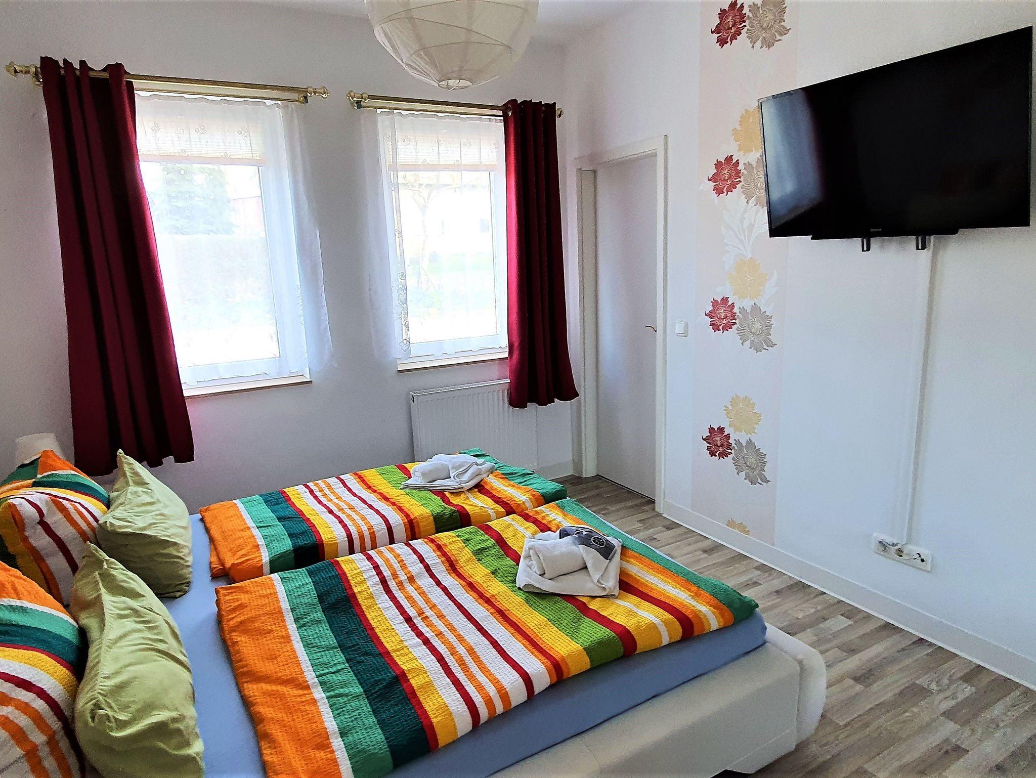 Schlafzimmer mit großem Doppelbett und zusätzlichem HD-TV