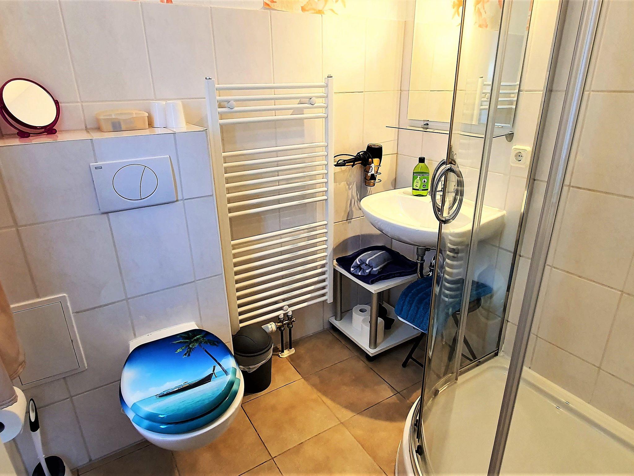 Badezimmer mit hochwertigen Fliesen, Dusche und regelbarer Fußbodenheizung
