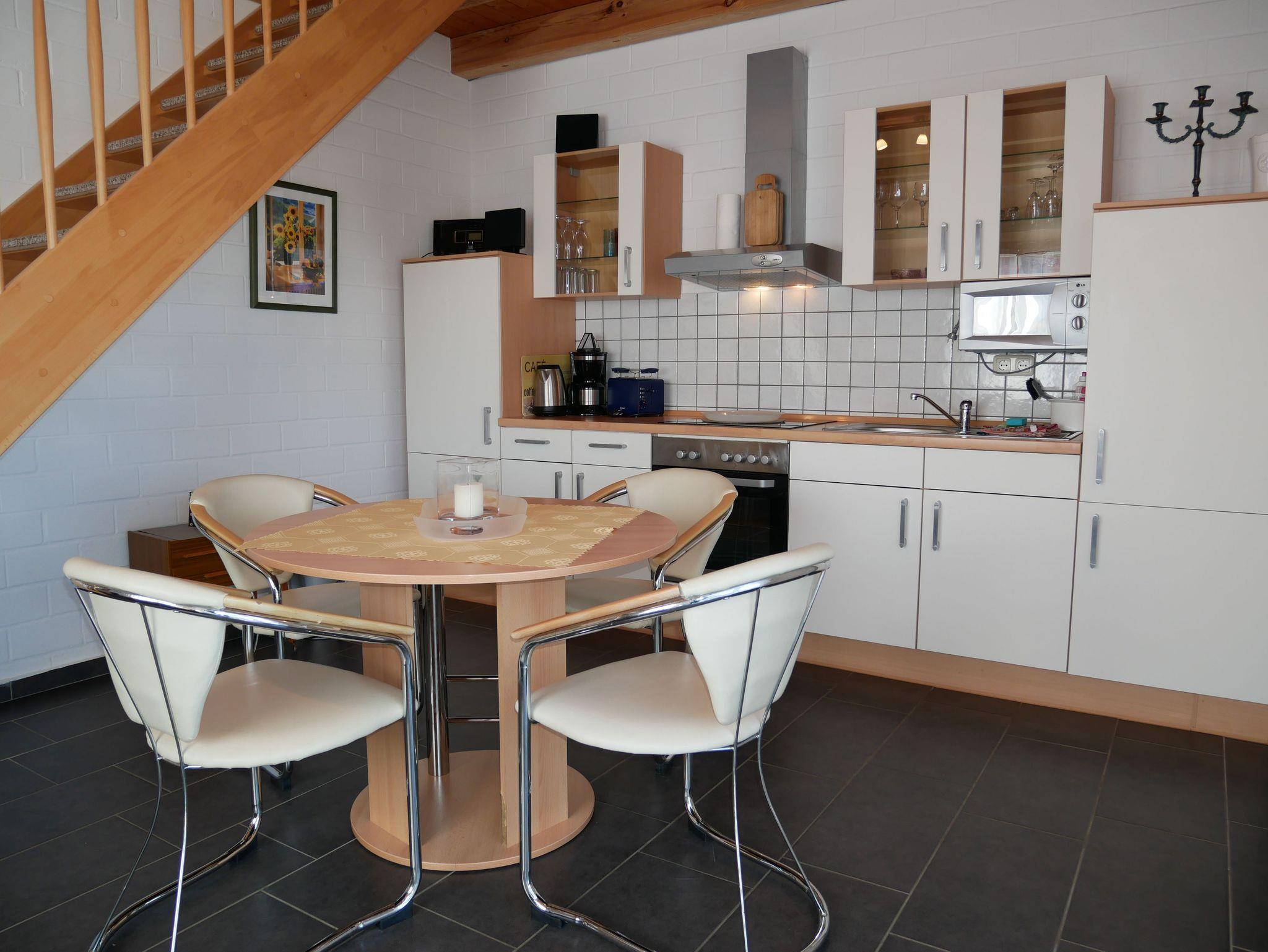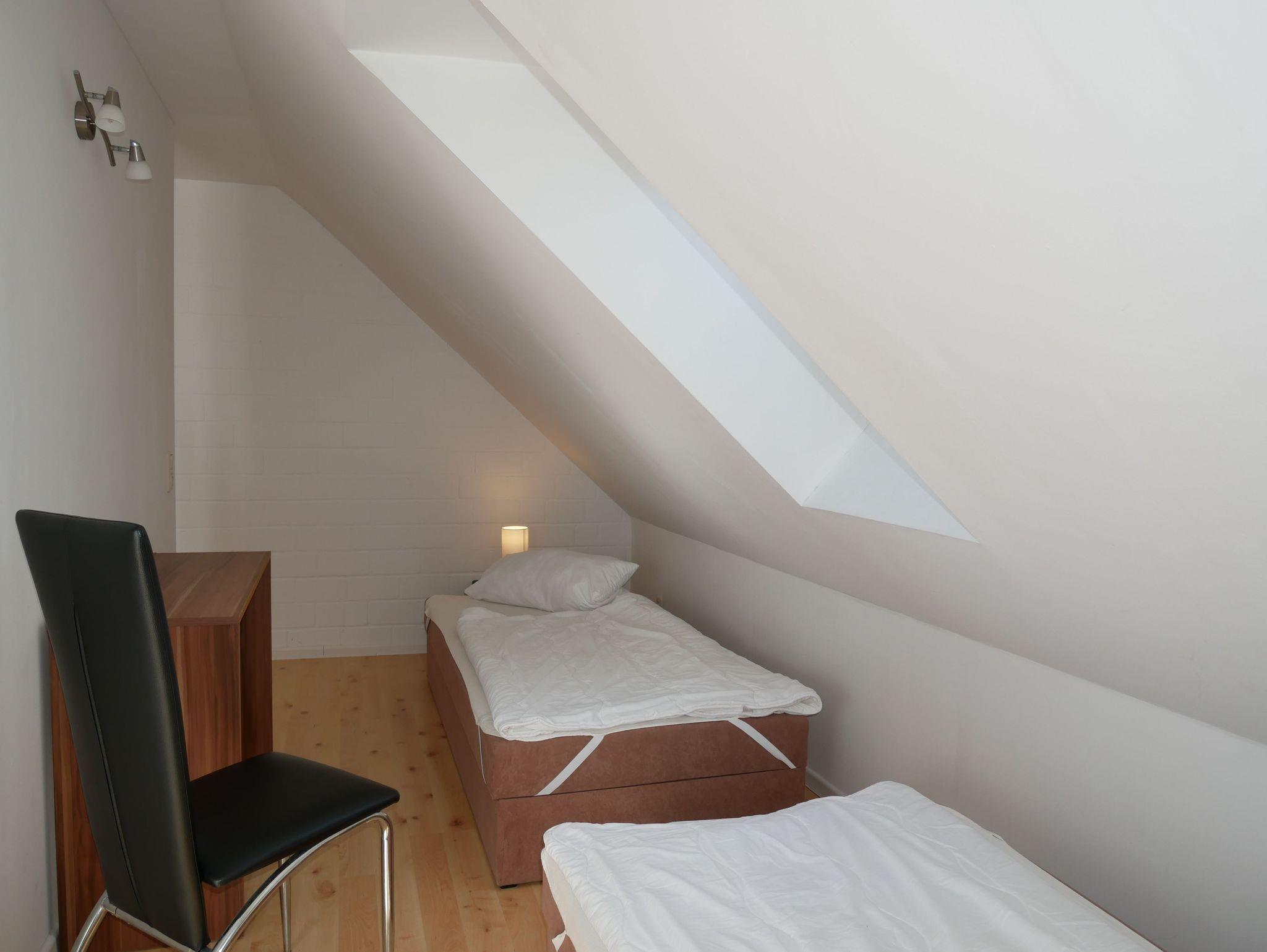 In das Obergeschoss gelangt man über eine offene Buchentreppe. Diese Etage ist offen gestaltet und in einen optisch abgetrennten Schlafbereich mit 2 Einzelbetten und einem großzügigen Wohnbereich mit Flat-TV und Schlafcouch (Aufbettungsmöglichkeit für die 5. Person) aufgeteilt.