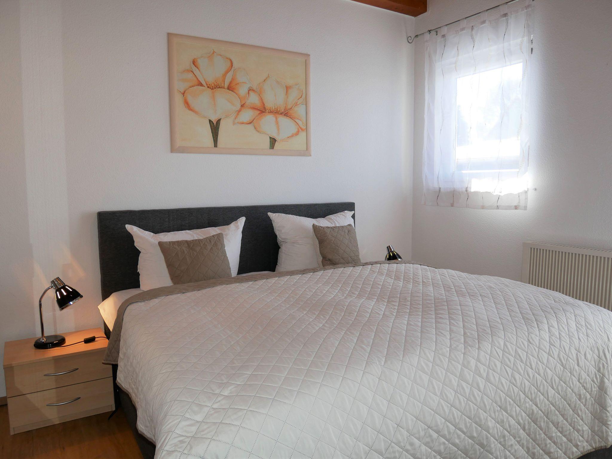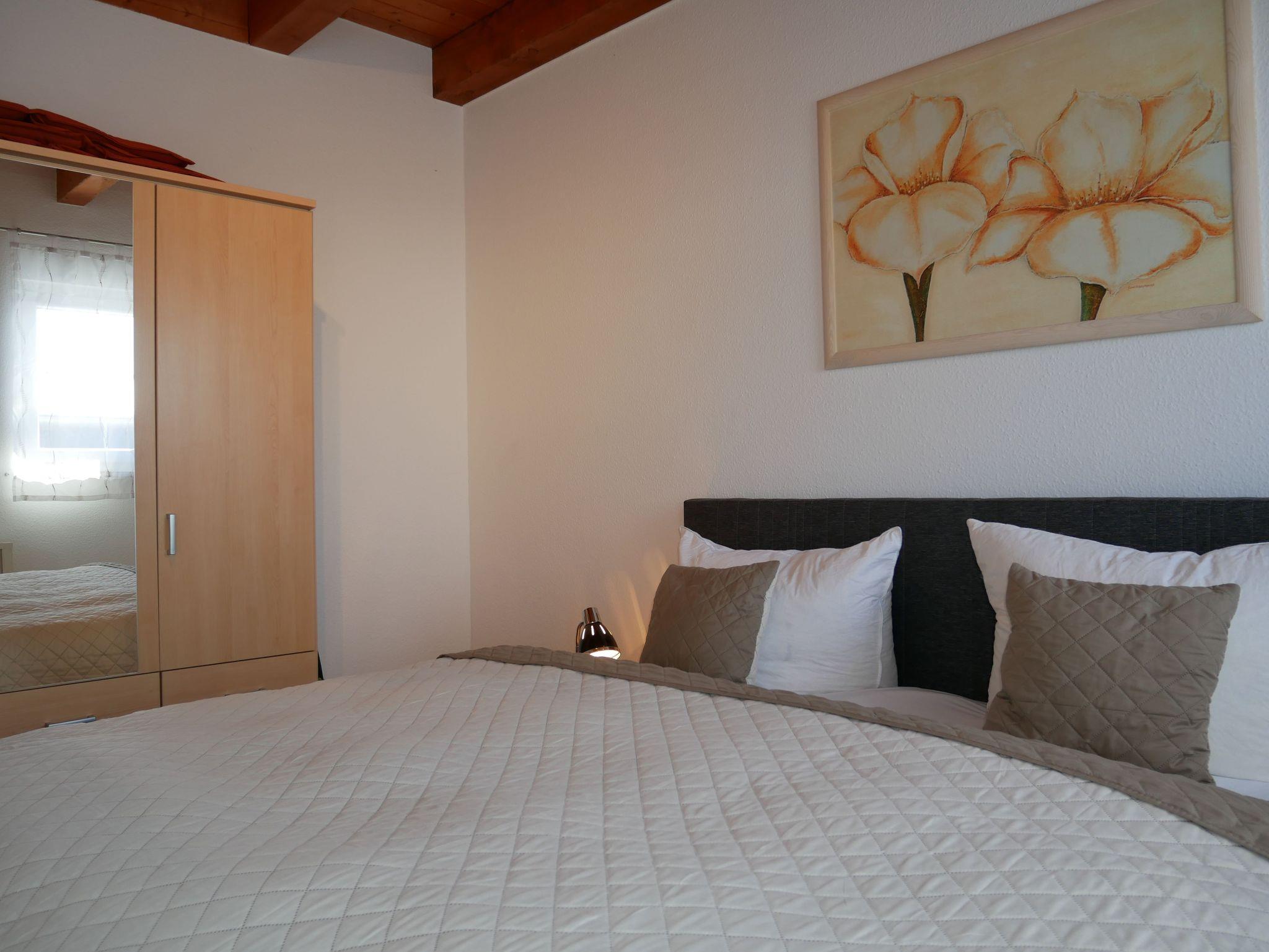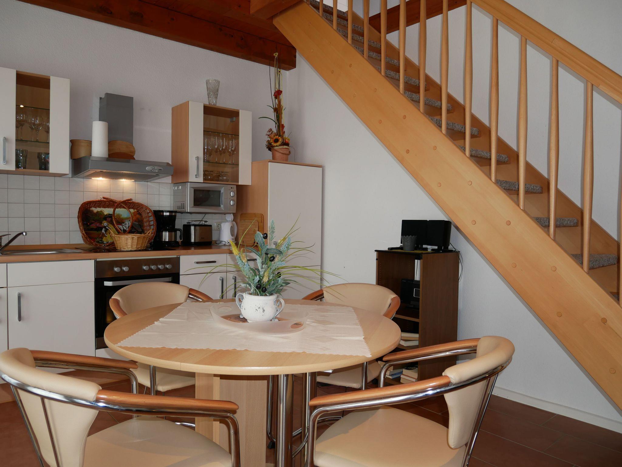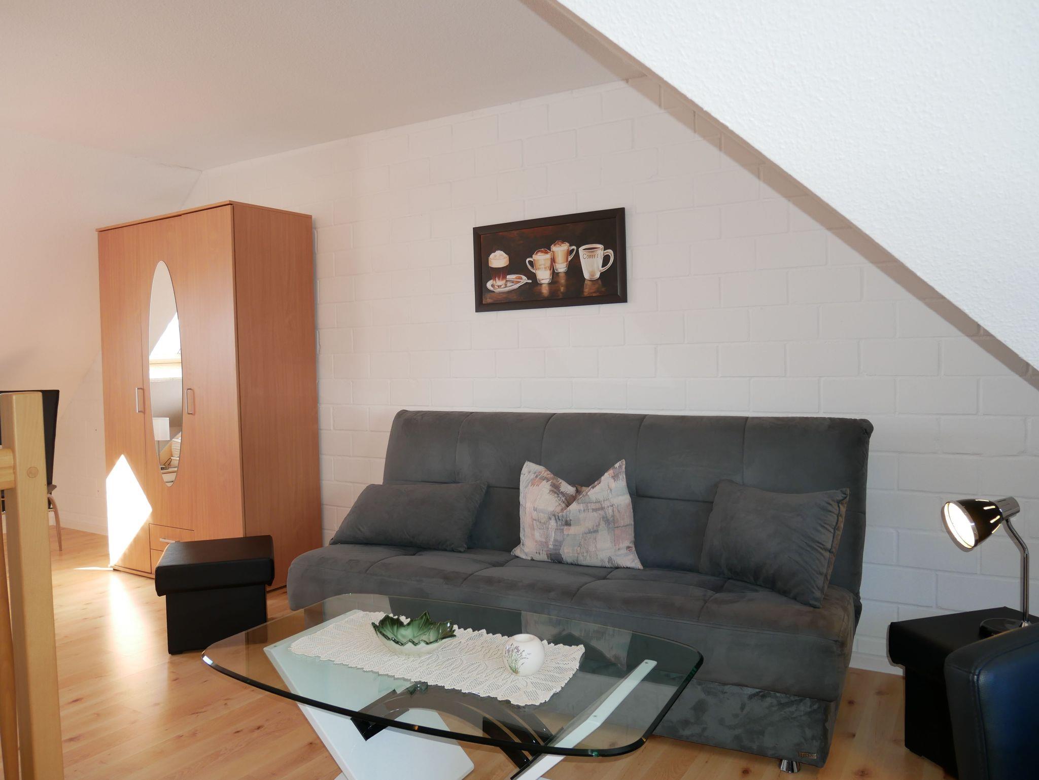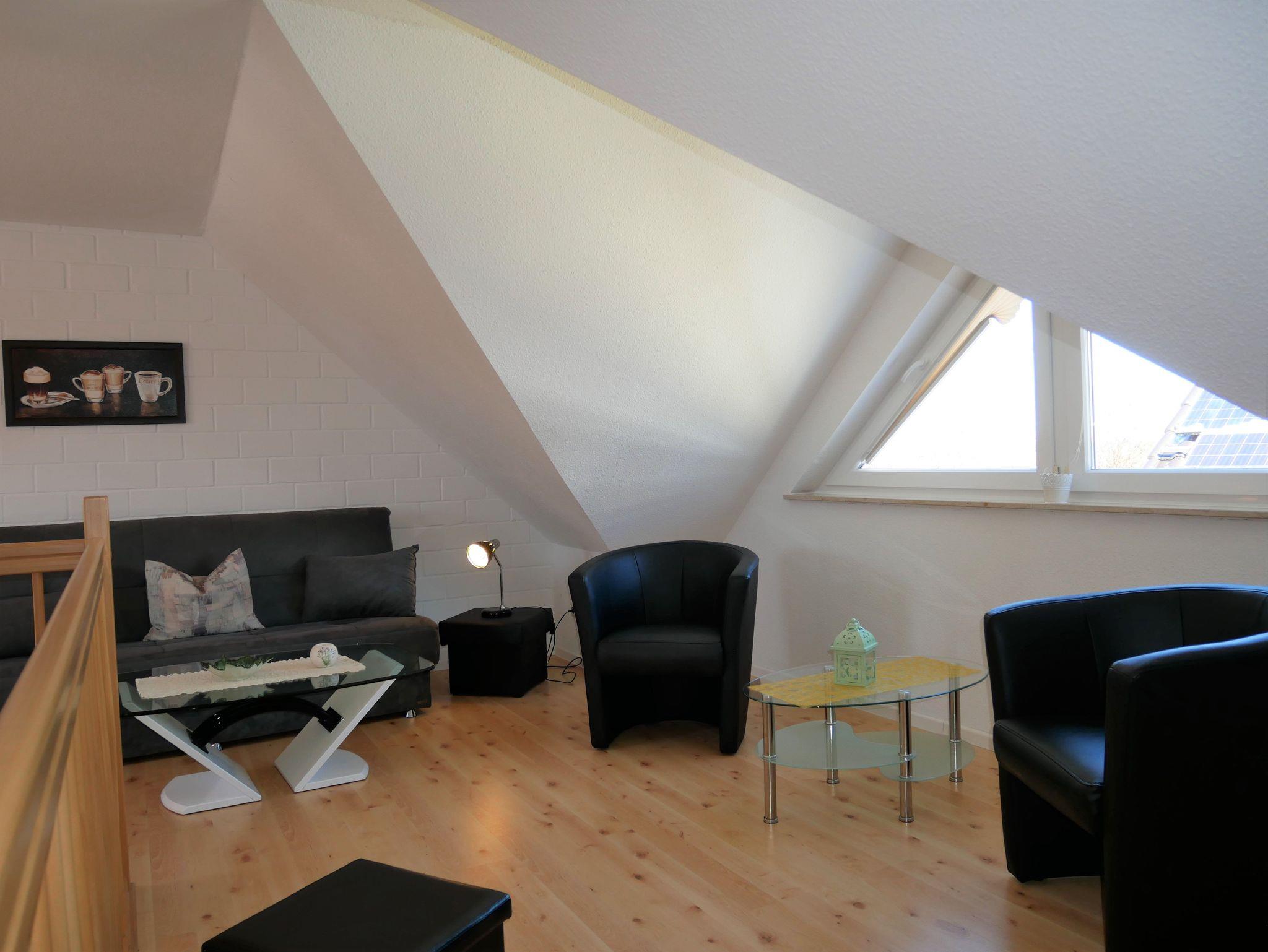 In das Obergeschoss gelangt man über eine offene Buchentreppe. Diese Etage ist offen gestaltet in einen Schlafbereich mit einem Doppelbett und einem großzügigen Wohnbereich mit Flat-TV und Schlafcouch (Aufbettungsmöglichkeit für die 5. Person) aufgeteilt.