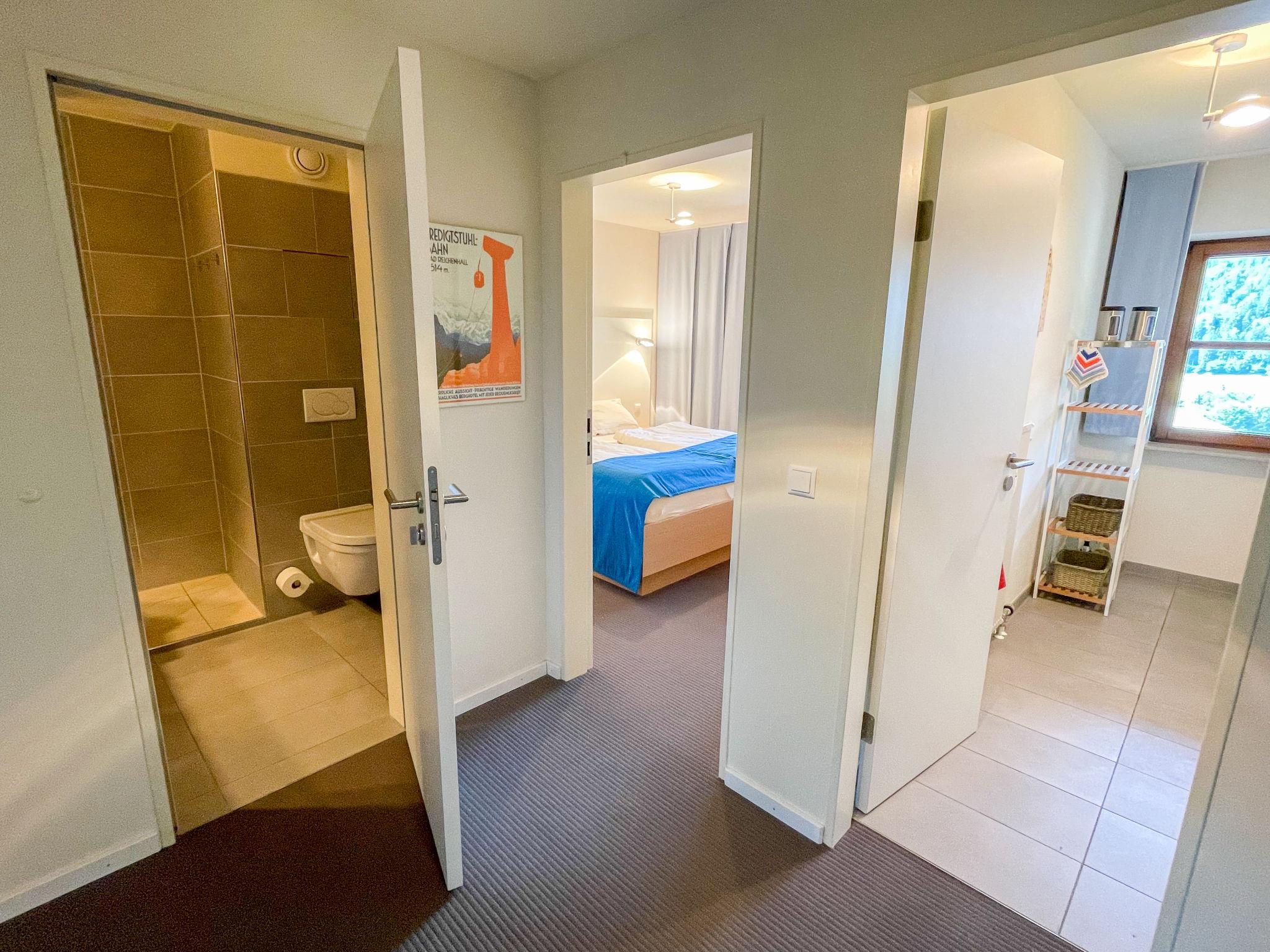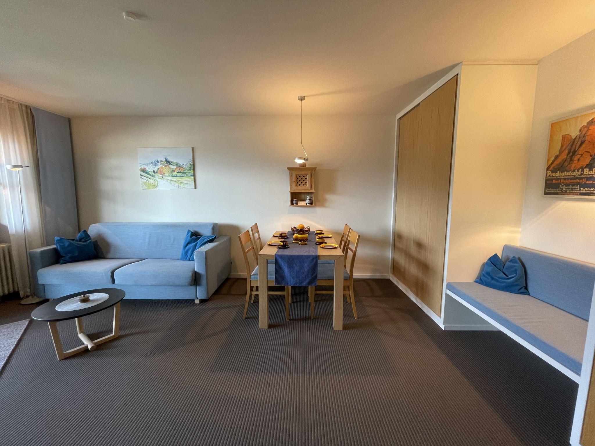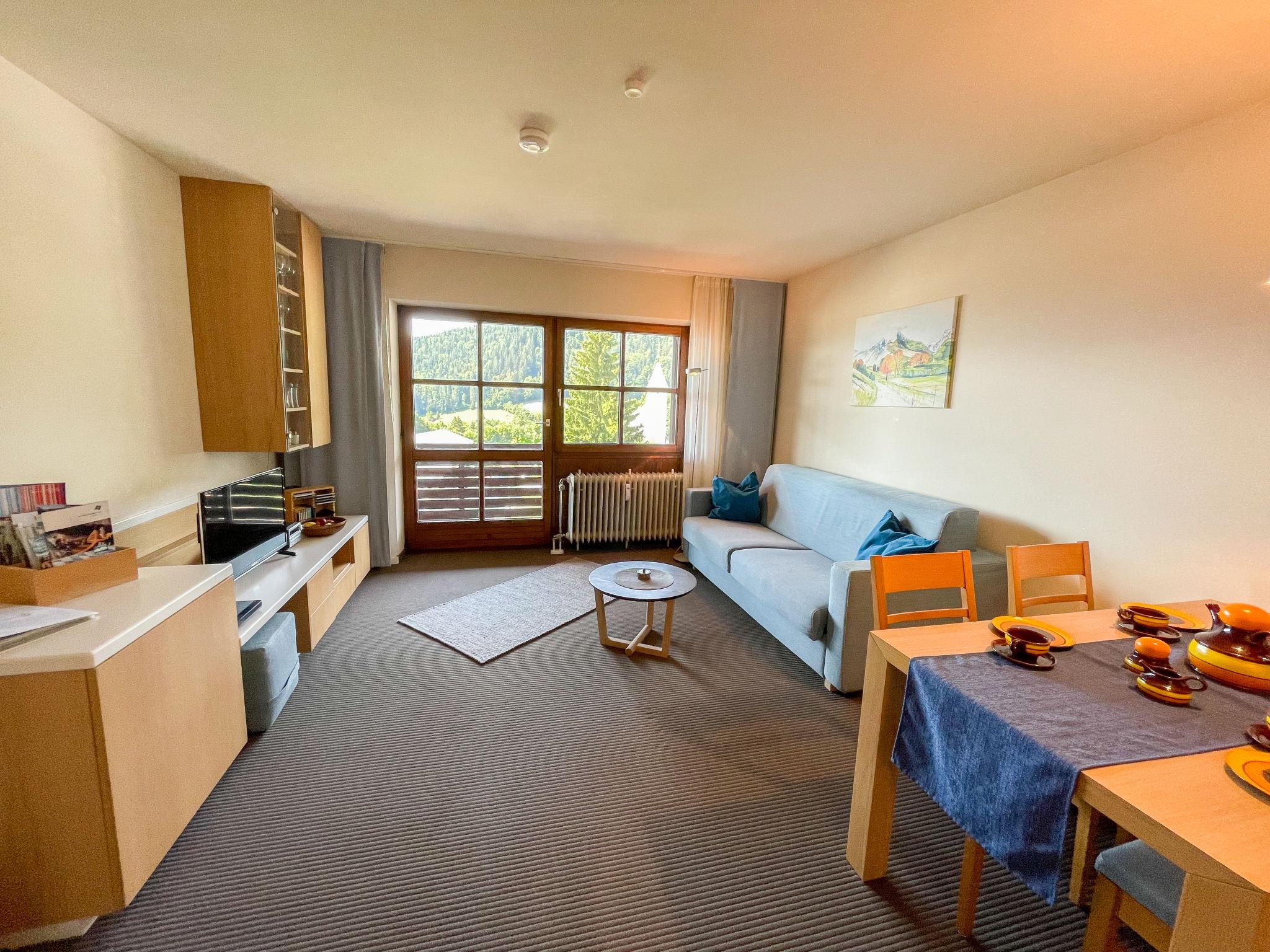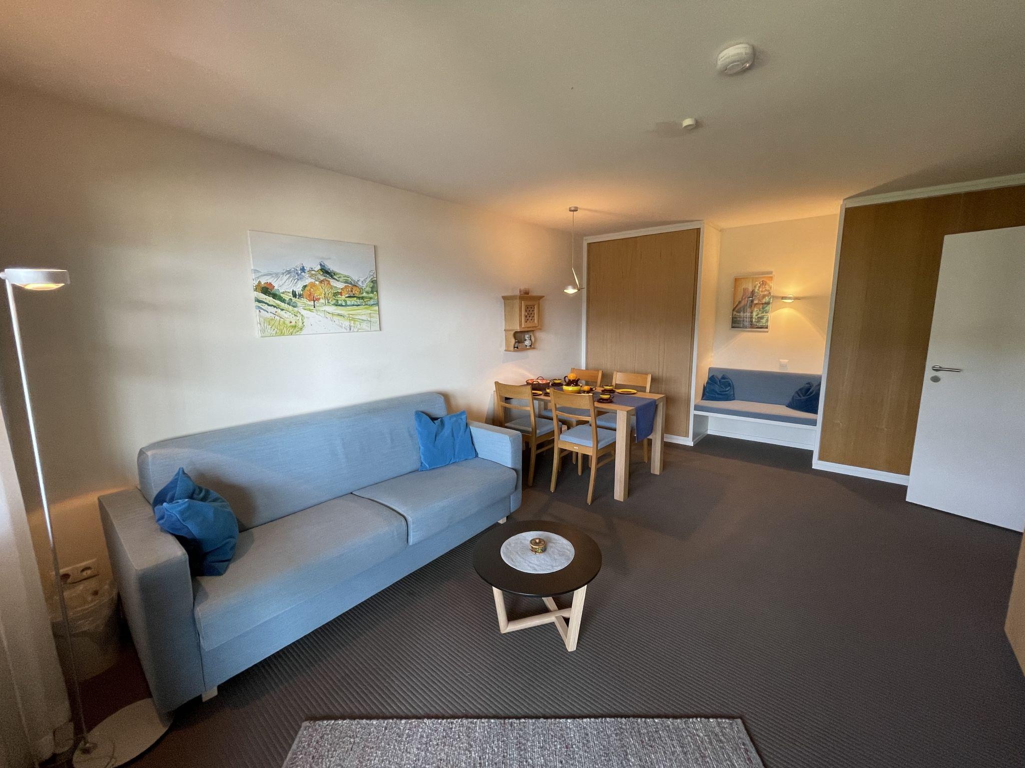 "Alpenappartement Buchenhöhe A301", 2-room apartment 60 m2 on 3rd floor. Bright, comfortable and tasteful furnishings: entrance hall. Living/dining room with 1 double sofabed (180 cm, length 200 cm), cable TV (flat screen), hi-fi system and DVD. Exit to the balcony. 1 double bedroom. Small kitchen (oven, dishwasher, 4 ceramic glass hob hotplates, electric coffee machine). Shower/WC. Balcony 15 m2. Balcony furniture. Very beautiful panoramic view of the mountains and the countryside. Please note: non-smokers only.