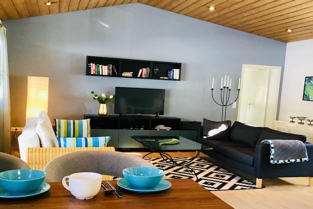 I 2. etasje: (Kjøkken(komfyr med kokeplater, vannkoker, brødrister, kaffetrakter, stekovn, mikrobølgeovn, oppvaskmaskin, kjøleskap, fryser), Stue/spisestue(1 persons sovesofa, TV, spisebord, radio, høy barnestol, selskapsspill, leketøy), soveværelse(king size dobbeltseng, sprinkelseng), soveværelse(enkeltseng, enkeltseng, sprinkelseng), bad(badekar, dusj, håndvask, toalett, Inkl. håndklær), WC(håndvask, toalett, Inkl. håndklær)) balkon, hagemøbler, Parasoll