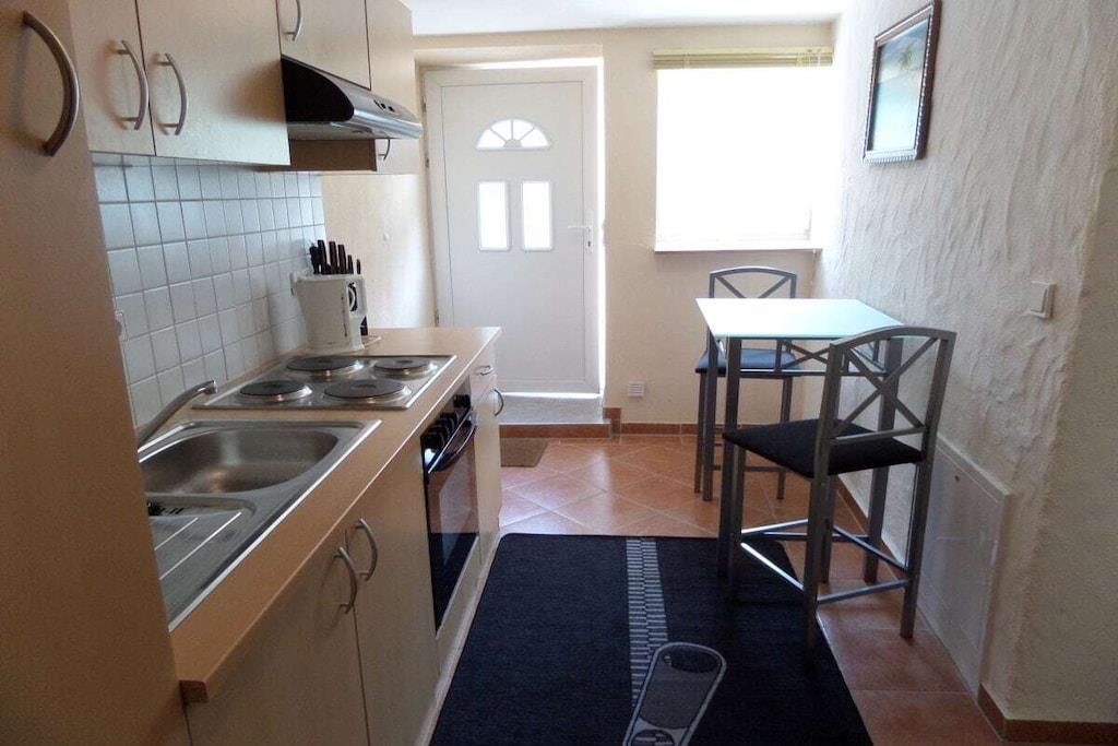 Ground floor: (bathroom(Mirror, toilet, radio, shower, washbasin, heating)) Fire Alarm, Hot Water, Vacuum Cleaner, Living room(Armchair, Sofa, TV, heating, insect screens), Kitchen(Egg Cooker, Tea Towels, Kitchenette, dining table, stove, electric kettle, toaster, cooker, coffee machine, oven, fridge, heating, insect screens), bedroom(Bed Linen, double bed, heating), Internet access, heating, terrace(Sun Umbrella, garden furniture), parking, Laundry Package for a fee