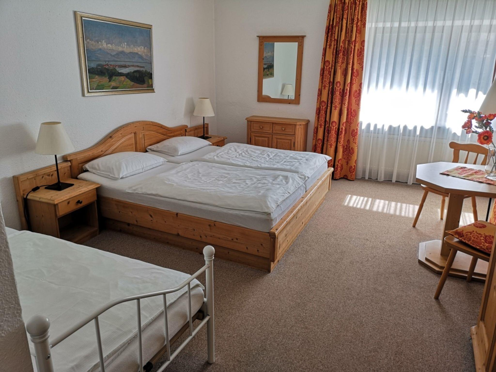 Die Ferienwohnung mit rd. 56 m² Wohnfläche im Obergeschoss besteht aus einem Schlafzimmer mit Doppelbett und einem hellen Wohnraum (zusätzliche Schlafmöglichkeit für 2 Personen), Ausziehcouch, einer Kochnische mit Küchenausstattung, einer Dusche mit WC, einer separaten Toilette und einem Südbalkon. Sie ist für maximal 5 Personen geeignet.