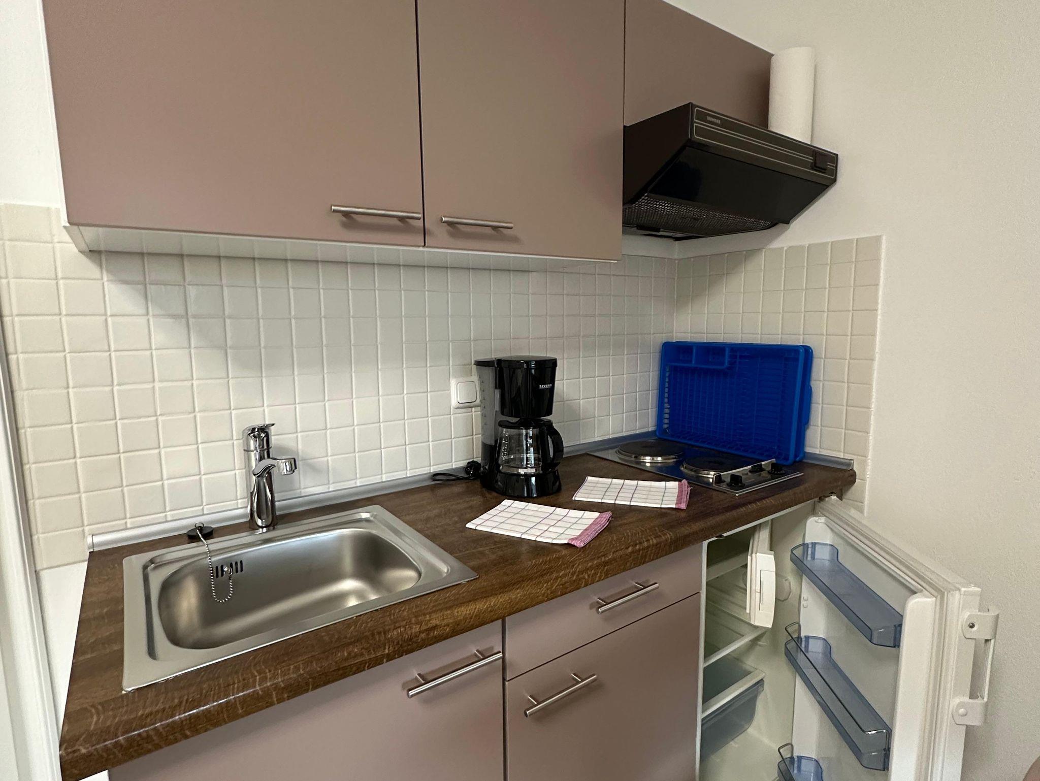 voll ausgestattet mit Doppelkochfeld, Gefrier-/Kühlschrankkombination, Kaffeemaschine und Spüle.