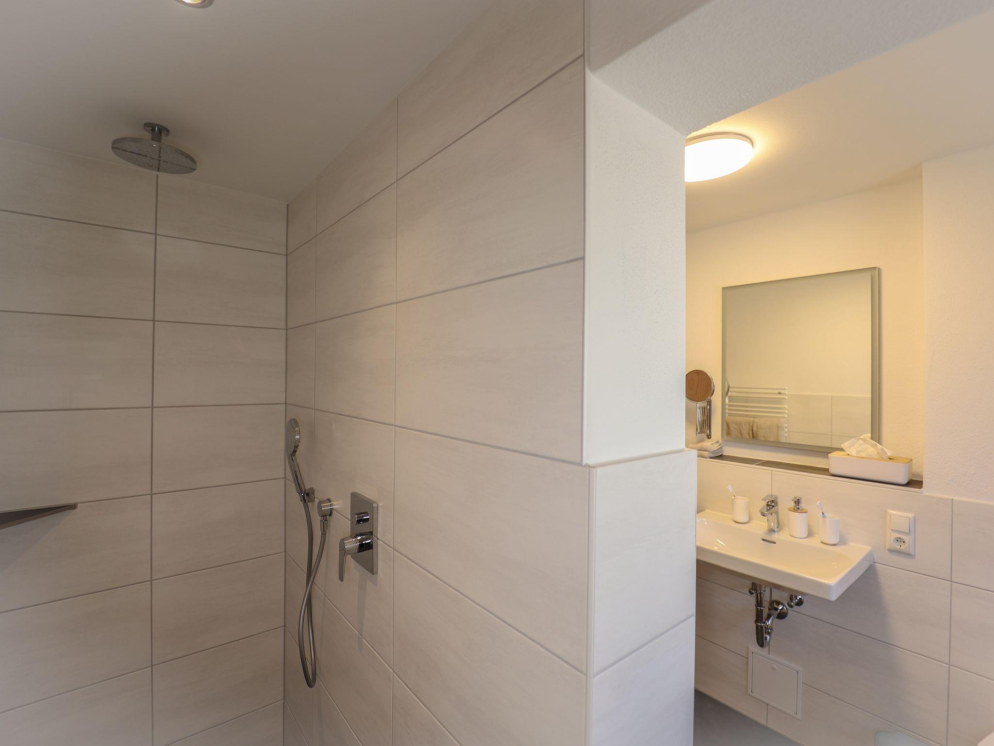 begehbare Regendusche. Haartrockner und Vergrößerungsspiegel vorhanden.