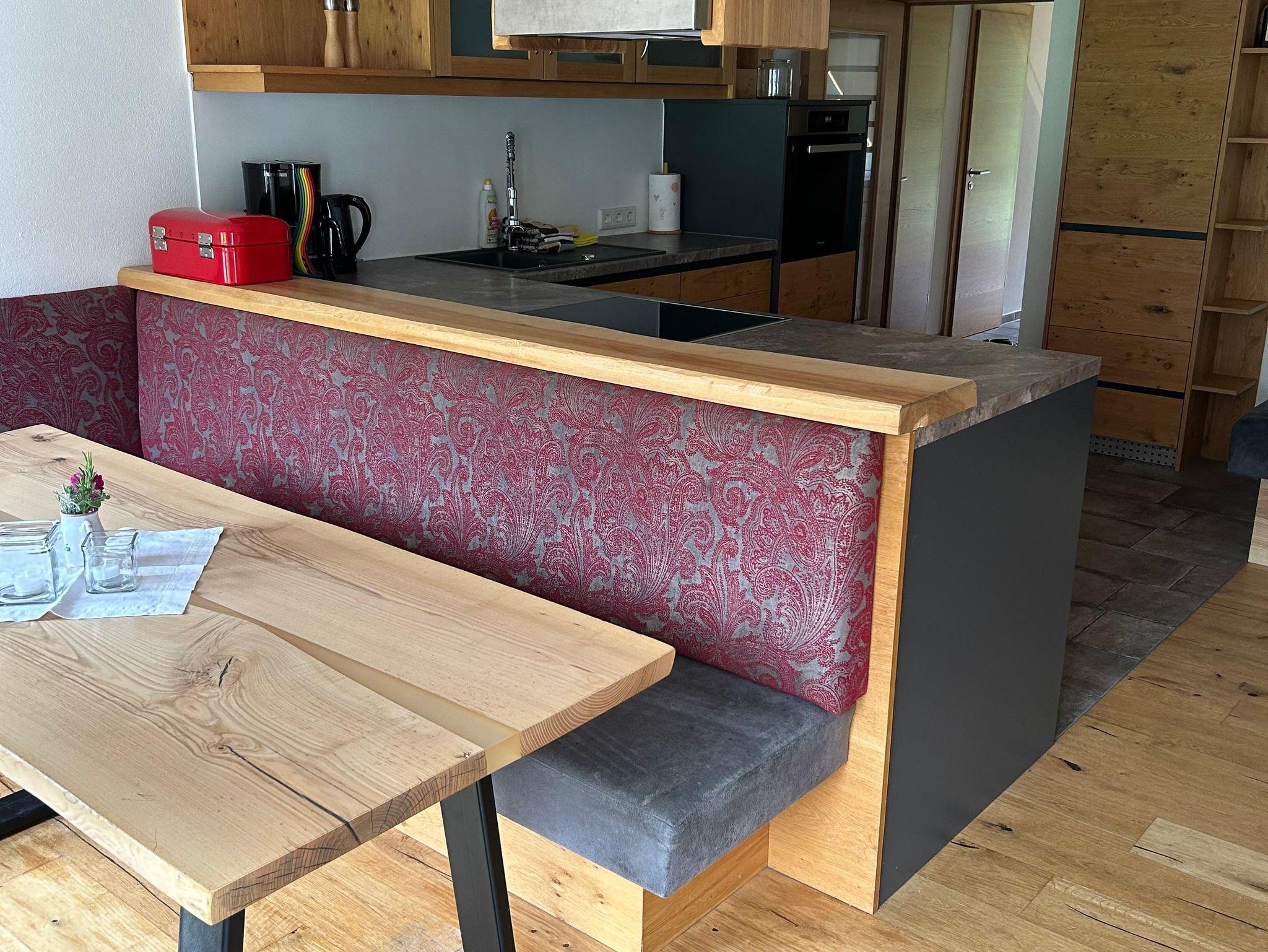Draußen lädt die Terrasse mit Bergblick zu erholsamen Stunden inmitten der Natur ein.