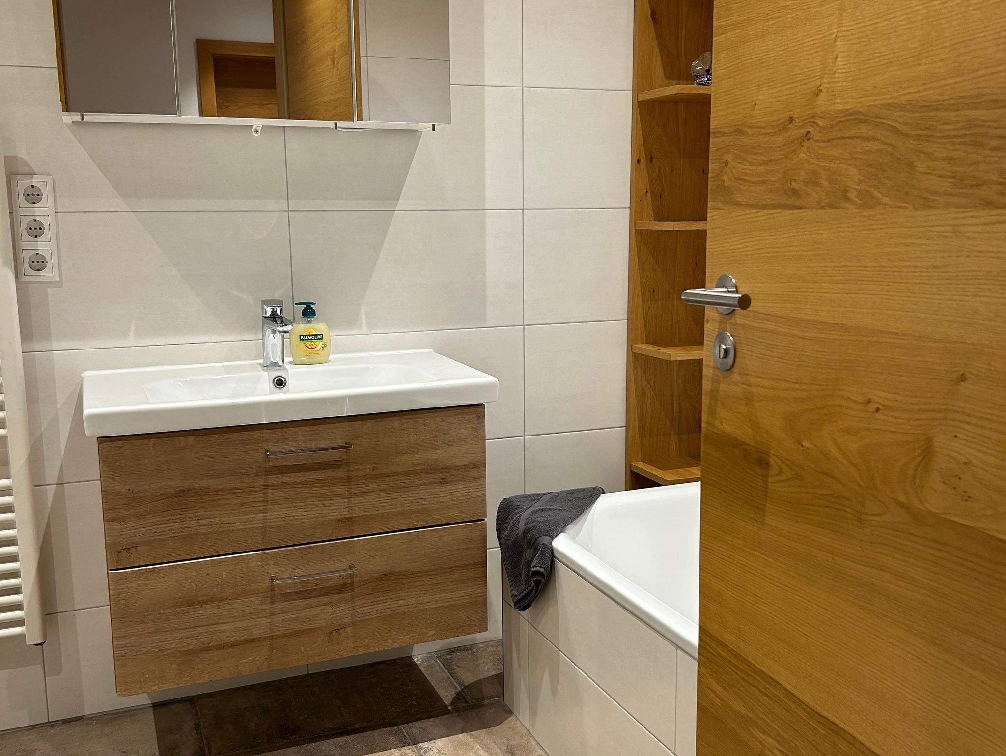 Das Bad ist ausgestattet mit Regendusche, Badewanne und Waschmaschine, dazu gibt es ein separates WC.