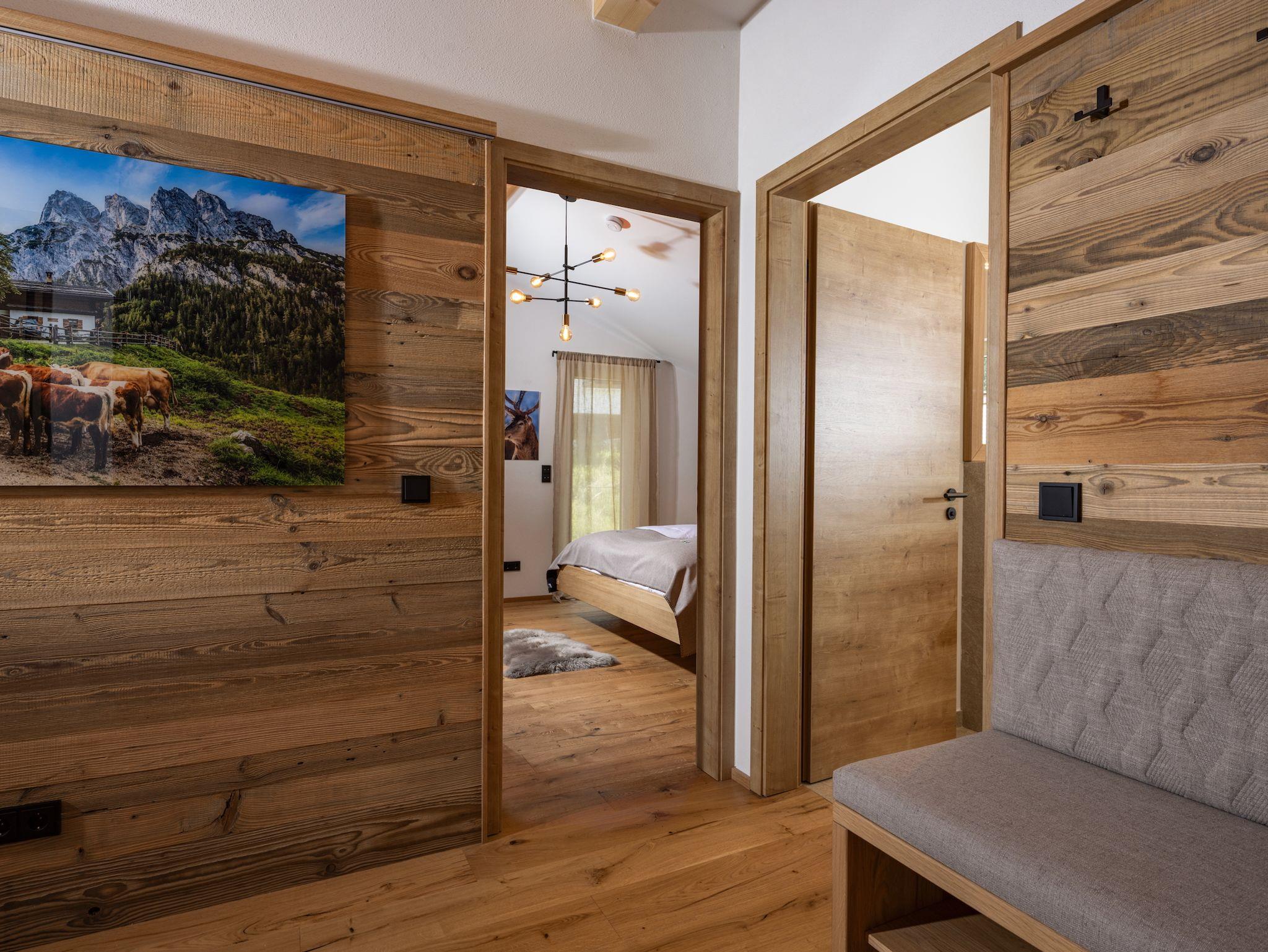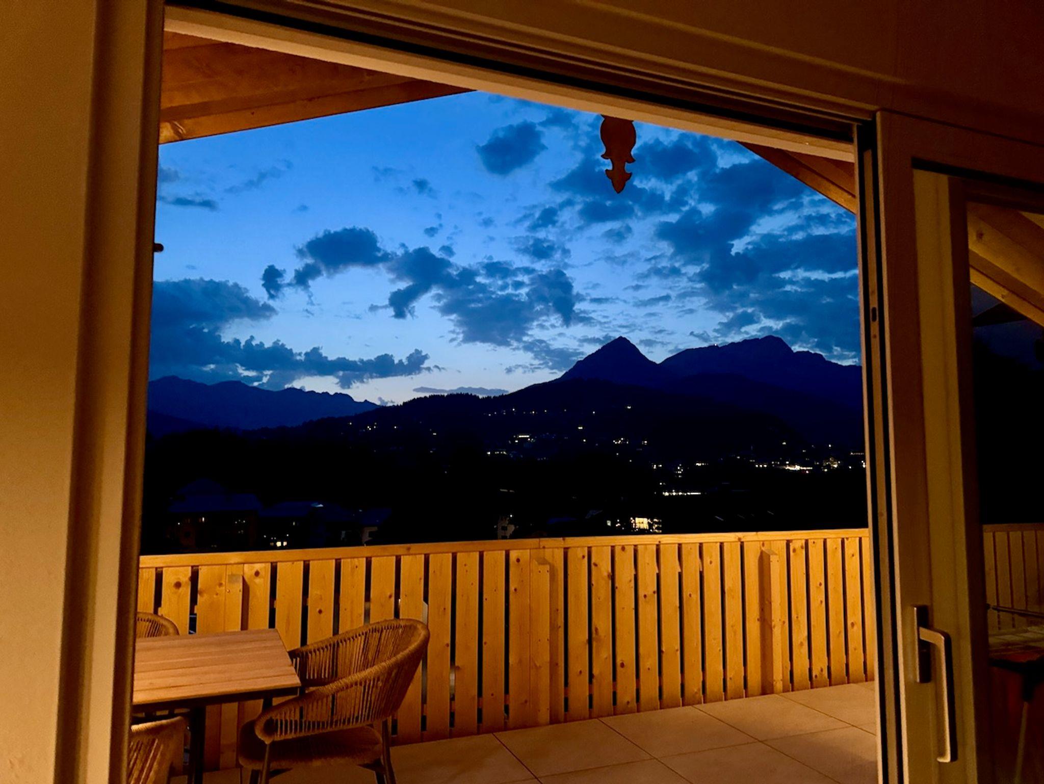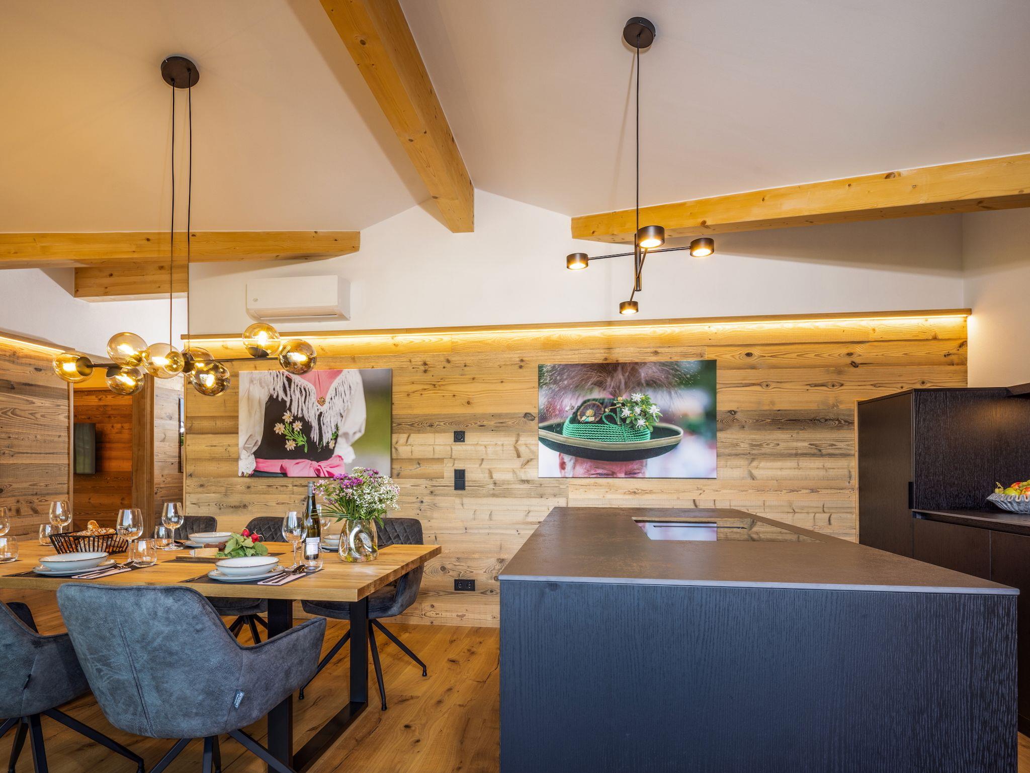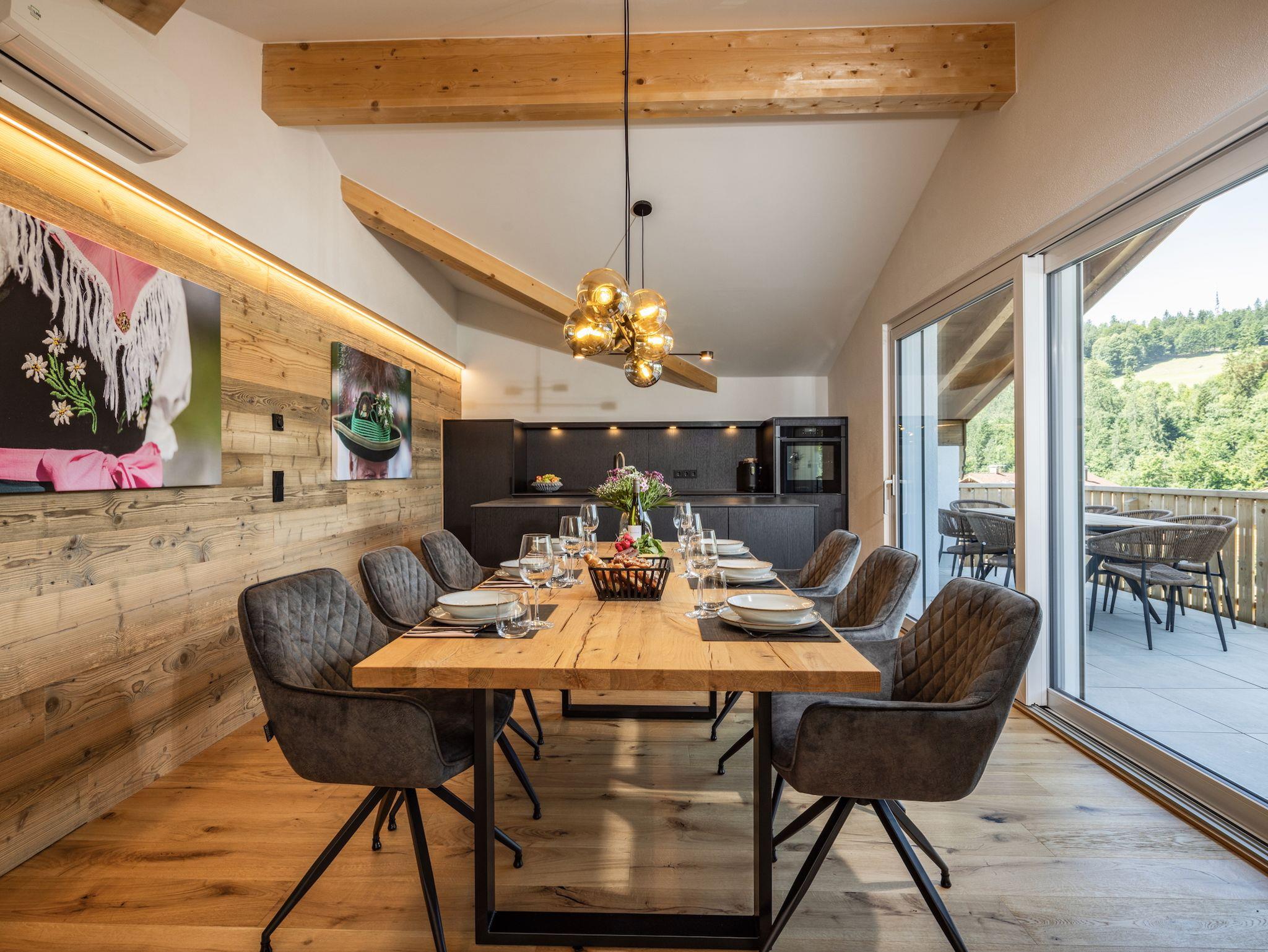 Die Ferienwohnung Das Gipfelglück ist sehr großzügig geschnitten, klimatisiert und bietet mit zwei Schlafzimmern, zwei Balkonen sowie einem offenen Wohn- und Essbereich viel Raum für Erholung und gemeinsame Zeit. Hohe Decken sorgen für ein luftiges Raumgefühl, während Wandvertäfelungen aus Altholz und liebevoll ausgewählte Dekoration eine warme, stilvolle Atmosphäre schaffen. Die hochwertige Innenausstattung und die Liebe zum Detail spiegeln sich in jedem Bereich der Wohnung wider. Das Gipfelglück ist neu im eleganten Chalet-Design mit alpinem Charme eingerichtet – mit natürlichen Materialien, maßgefertigten Echtholzmöbeln und ausgesuchten Wohnakzenten.