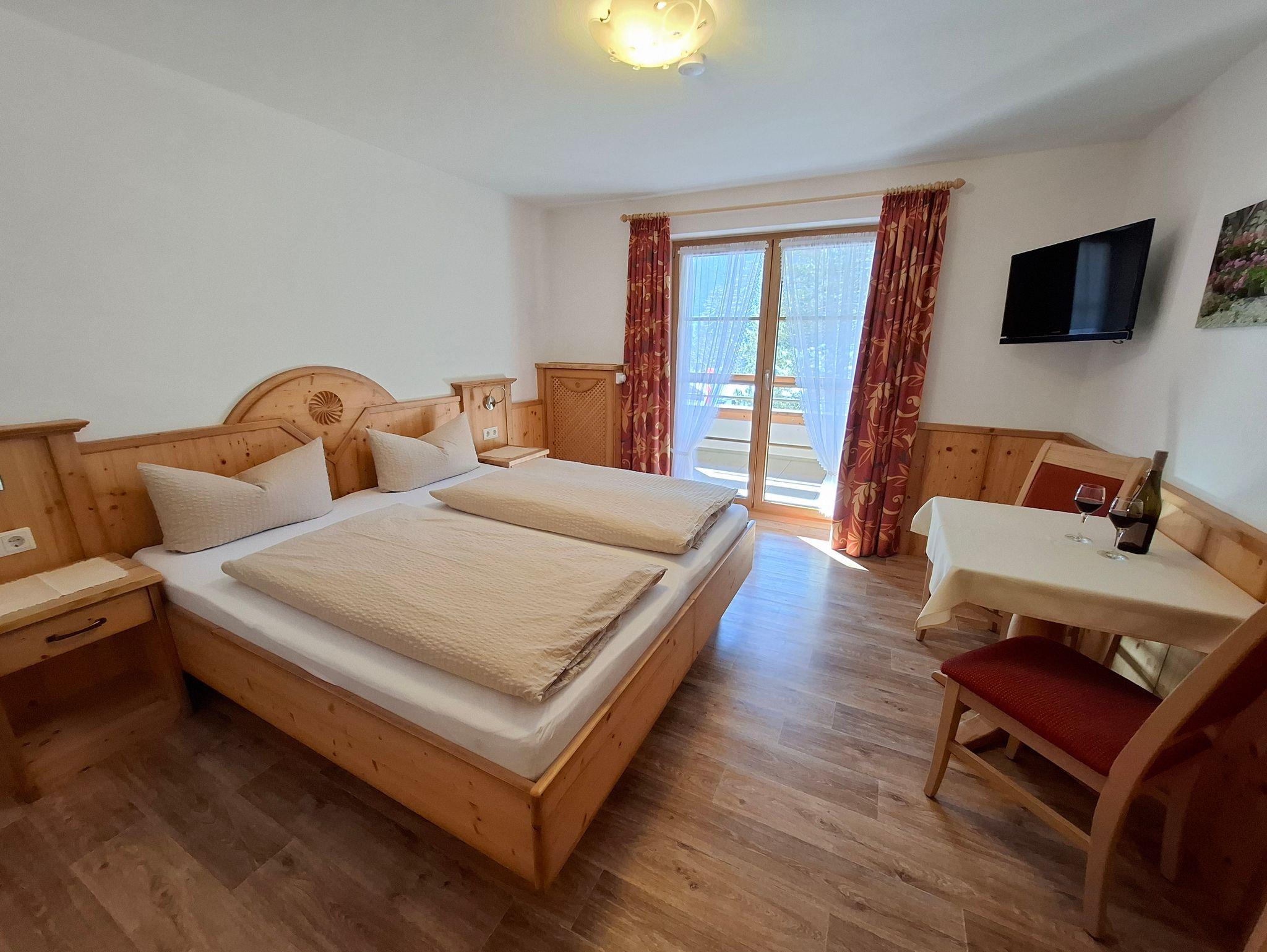 Unsere komfortablen Doppelzimmer sind mit Echtholzmöbel eingerichtet. Zur Standardausstattung gehört eine Sitzgelegenheit mit Tisch, TV und kostenloses W-LAN, sowie ein Badezimmer. Alle Zimmer haben einen Balkon mit herrlichem Bergblick oder mit Blick ins Grüne. Die Zimmergröße beträgt 18 bis 21 qm.