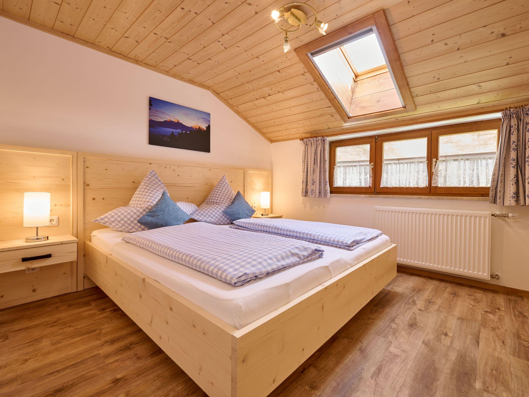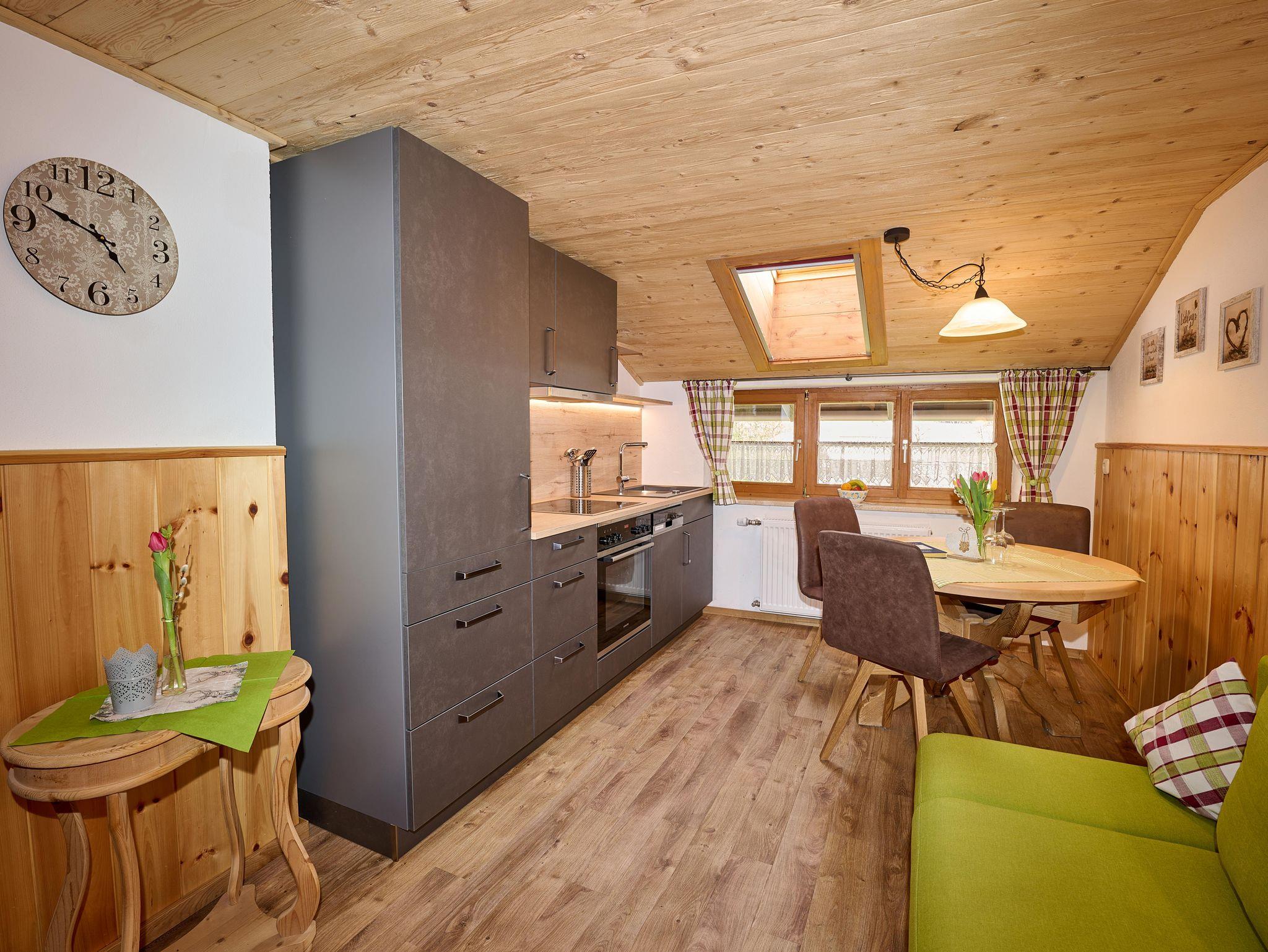 Unsere liebevoll eingerichtete und helle Dachgeschoßwohnung Wiesenblume (ohne Balkon) befindet sich im 2. OG und ist für zwei Personen ausgelegt. Sie verfügt über eine gemütlich eingerichtete Wohnküche mit ausziehbarer Couch und Flach-Sat-TV sowie separatem Schlafzimmer und einem Bad mit Dusche/WC, Fön und Kosmetikspiegel. Ein eigener Balkonanteil im 1. Stock steht für unsere Gäste zur Nutzung bereit. Dort kann man bereits am Morgen die Sonne und den Bergblick genießen. Die sonnige Terrasse mit Liegewiese lädt ebenfalls jederzeit zum Verweilen ein.