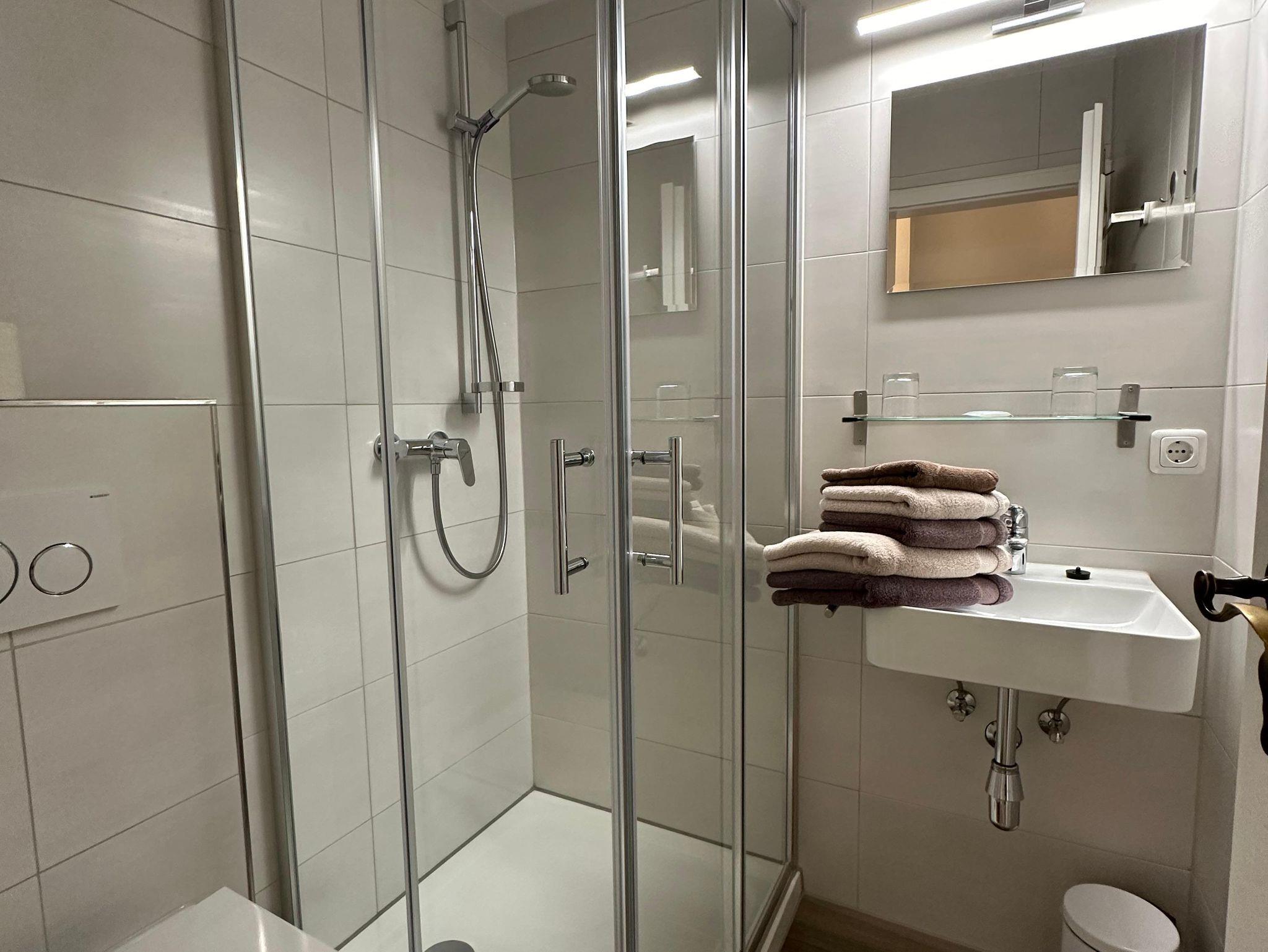 sind vorhanden. Im eigenen Bad finden Sie Dusche/WC und Waschbecken. Die Handtücher werden