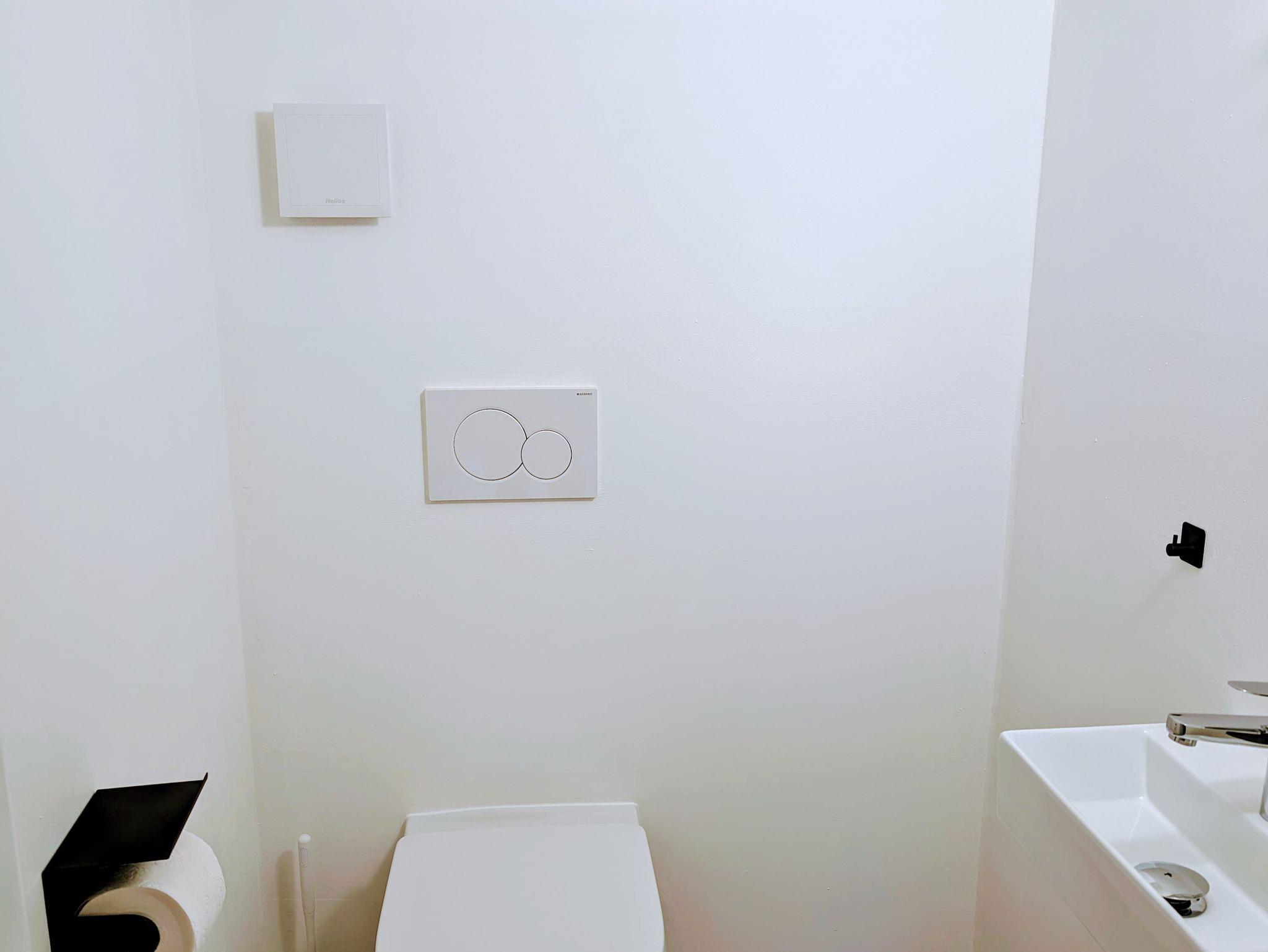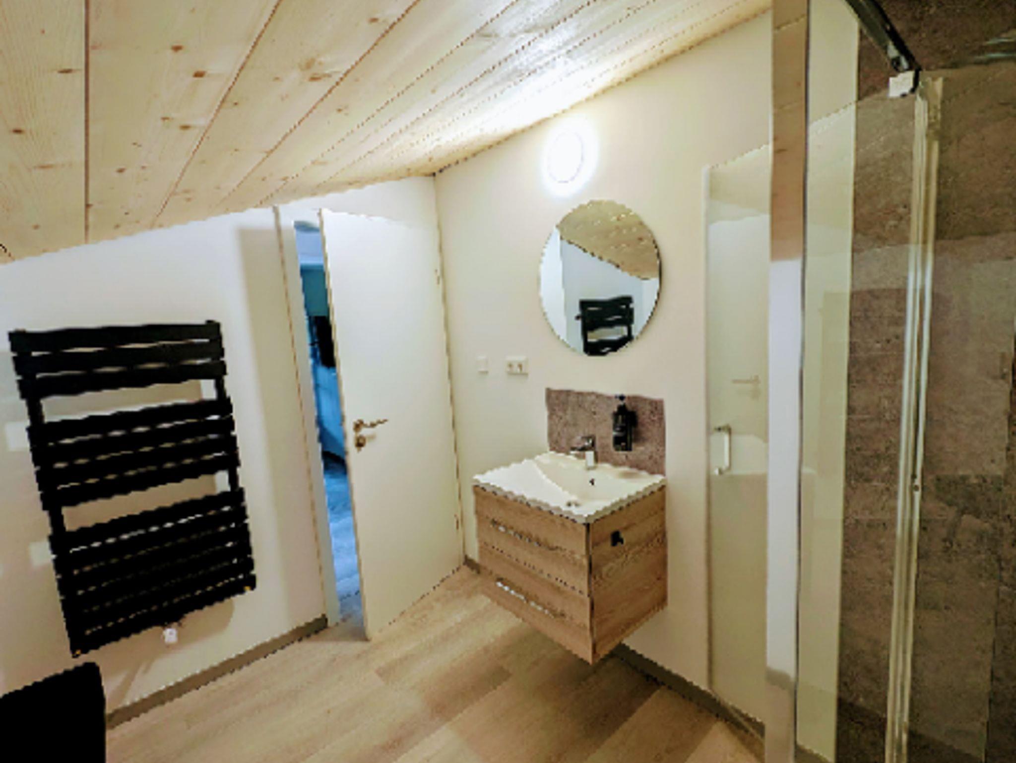 Das Badezimmer wurde modernisiert und beeindruckt durch eine große Dusche. Zusätzlich gibt es ein WC im Badezimmer. Ein weiteres WC ist bequem über den Flur erreichbar, was den Komfort für alle Gäste erhöht.