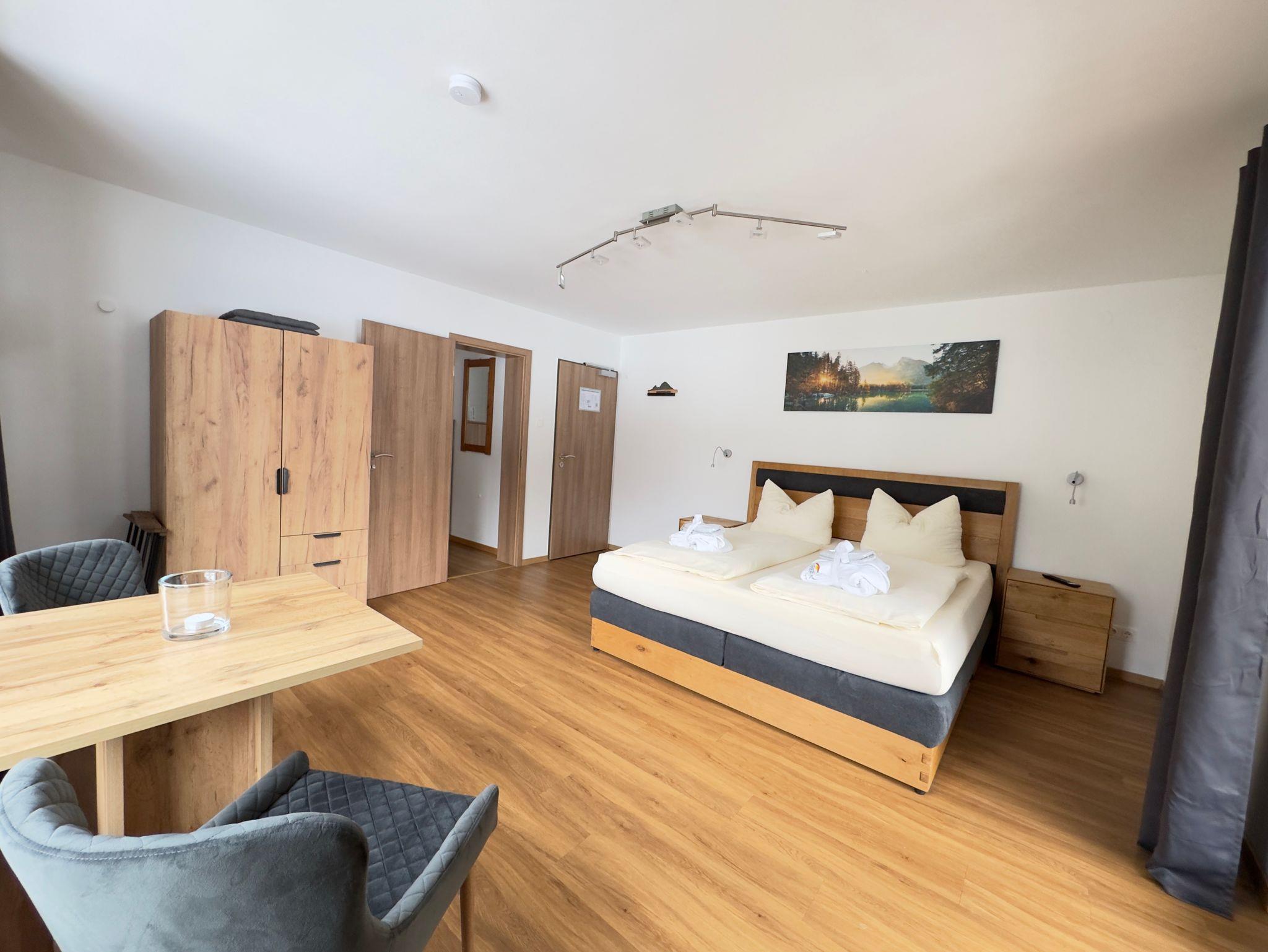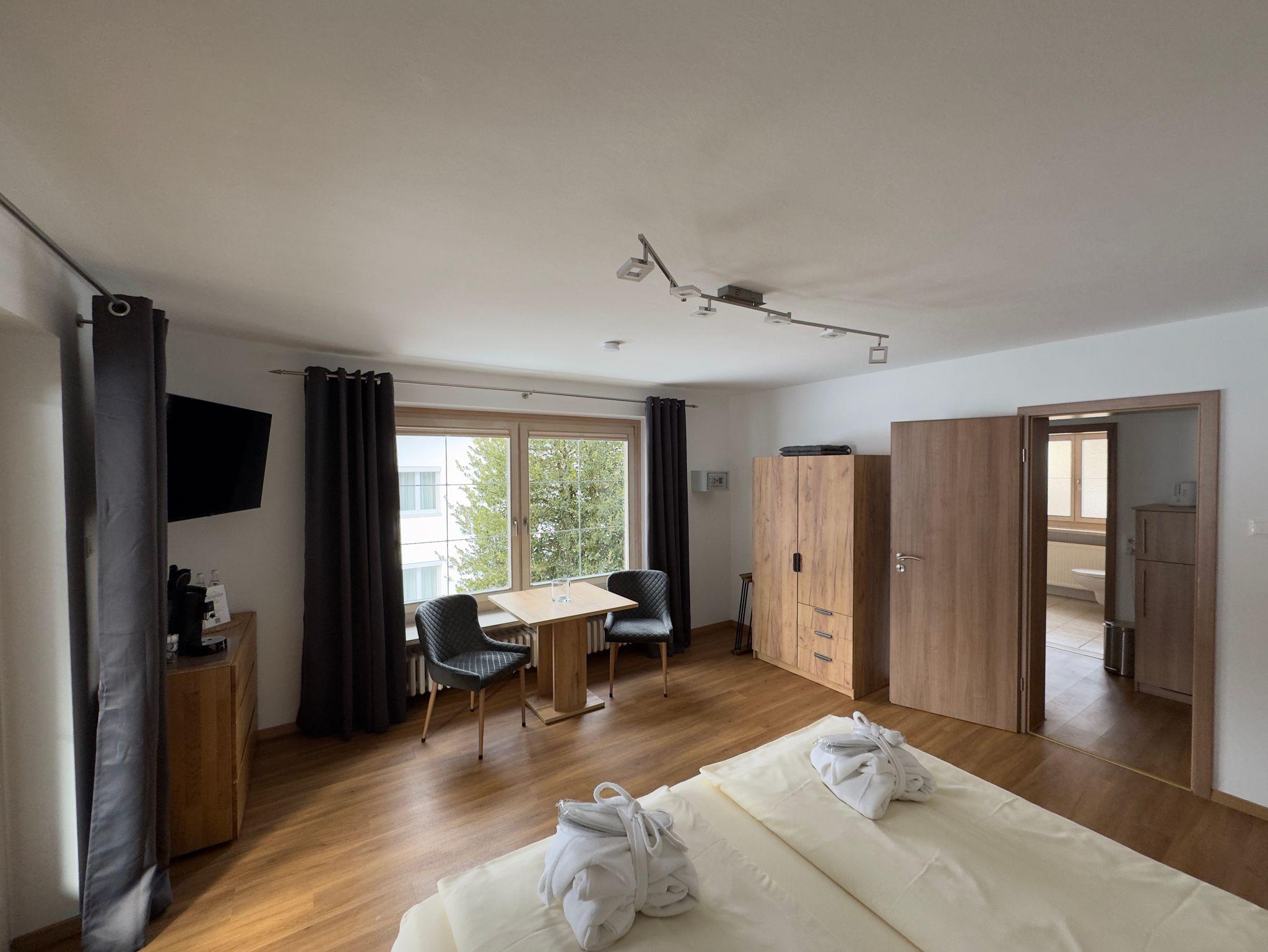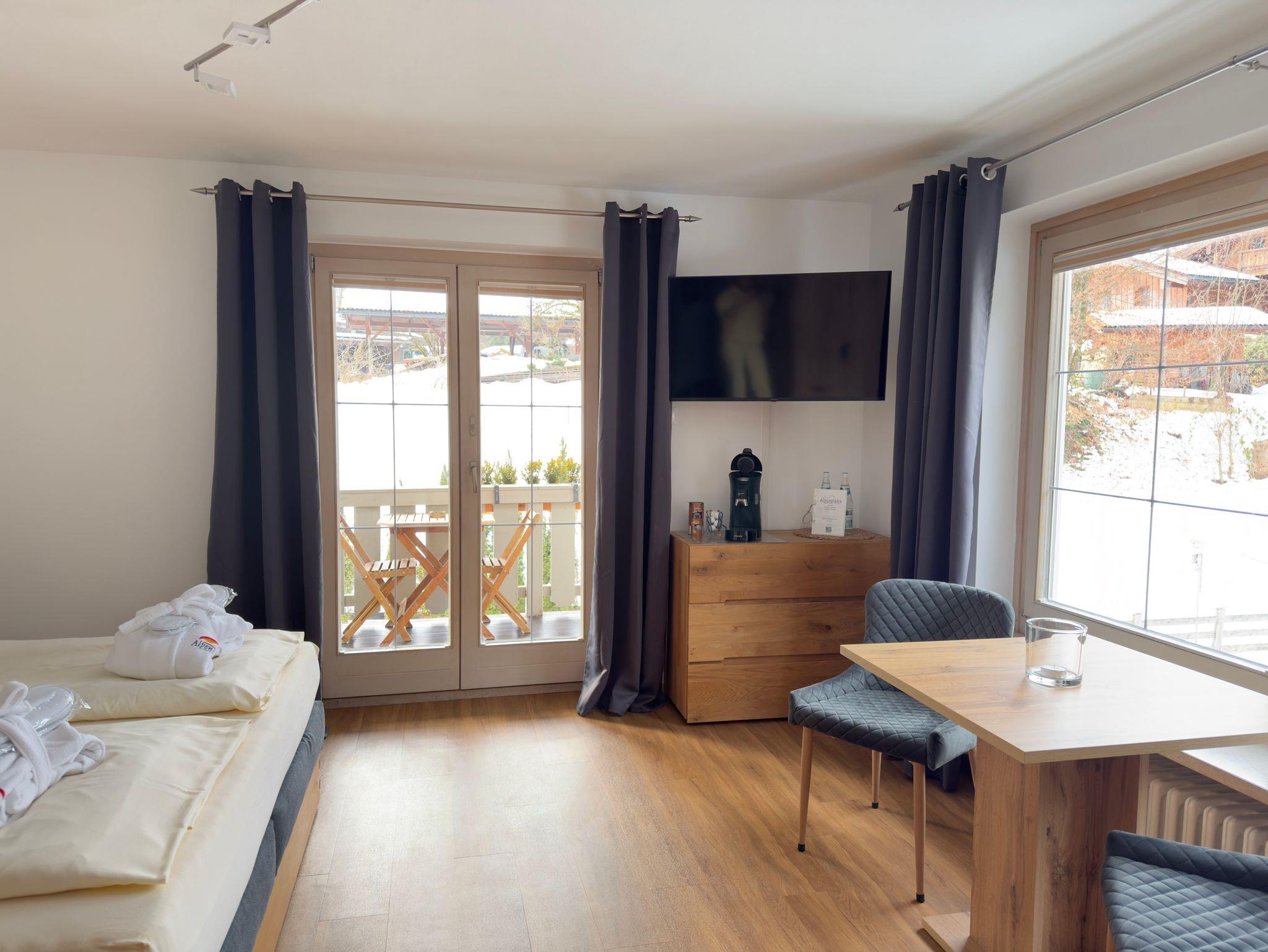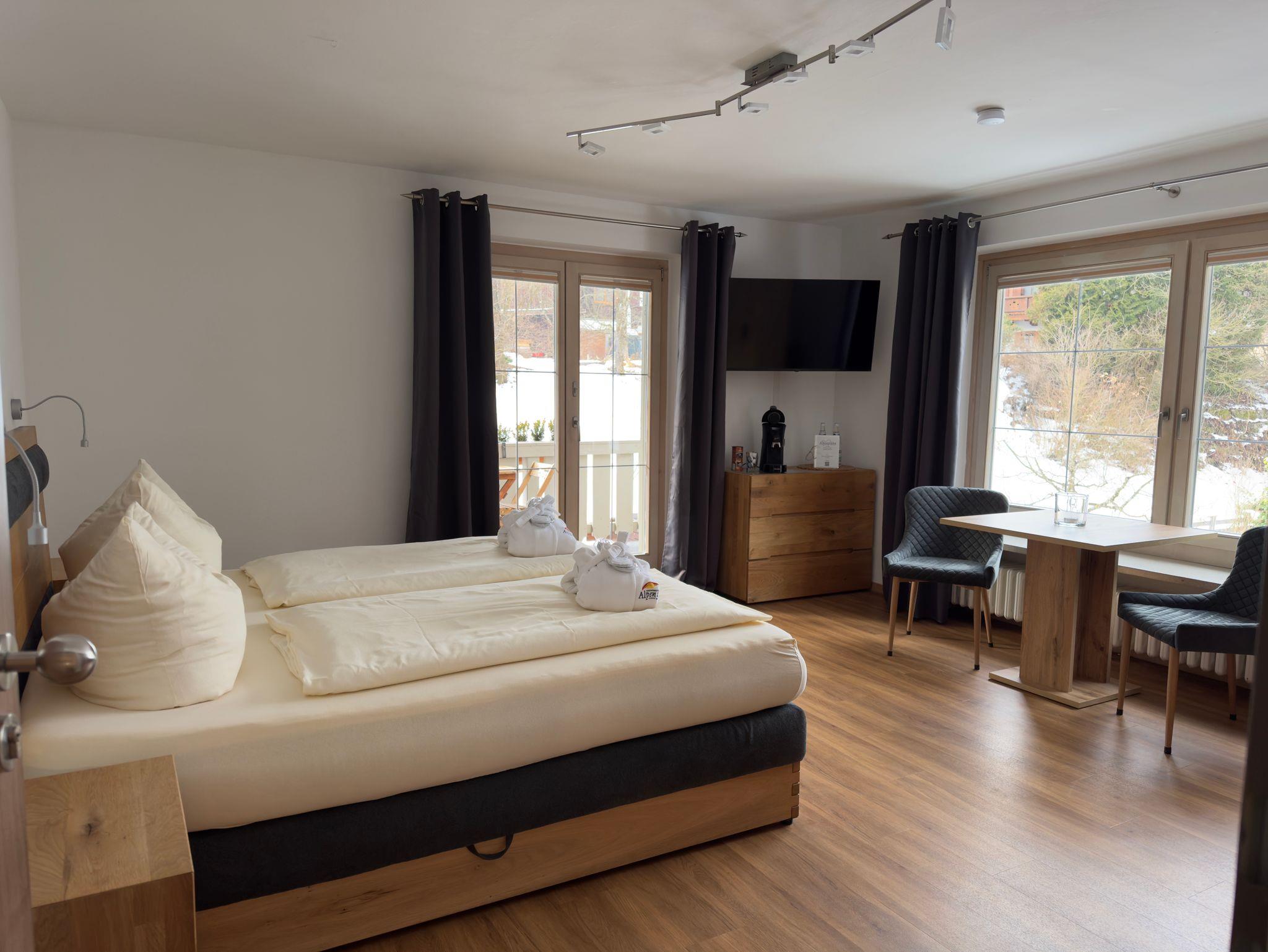 Das große Doppelzimmer im Altbau bietet auf 40 m² ebenfalls ein charmantes Urlaubsquartier für Ihren Urlaub. Das Zimmer befindet sich im Haupthaus der Betreiberfamilie. Entspannen Sie im Queensize-Bed. Das integrierte große Bad ist mit Dusche, sowie großer Badewanne und WC ausgestattet. Das moderne Mobiliar mit Queensize-Bed, Kleiderschrank und Esstisch mit zwei bequemen Stühlen (auch für Homeofficearbeiten bequem), schafft ein warmes und gemütliches Ambiente. Das Doppelzimmer verfügt über einen: Kühlschrank mit Tiefkühlfach, Senseo Kaffeemaschine, Flat Screen-TV. Ausserdem Gläser und Geschirr, wie Besteck sind vorhanden. Von Ihrem nach Süden ausgerichteten, hellen, großen Balkon mit einer Liege und einer Sitzgarnitur aus Holz, haben Sie einen traumhaften Blick über die Berchtesgadener Bergwelt, bis hin zu dem geschichtsträchtigen Eagles Nest. Ausserdem können Sie im Garten den beheizten Swimmingpool von April bis Oktober, sowie den immer beheizten Whirlpool ganzjährig nutzen. Im Bereich des Neubaus befindet sich unsere Sauna (kostenpflichtig pro Benutzungszeit pro Wohnung 15 €) die Ihnen auch zur Verfügung steht. Zusätzlich bietet das Alpenglühn Brötchenservice vor Ihre Tür und Frühstück im Stüberl auf Vorbestellung an.