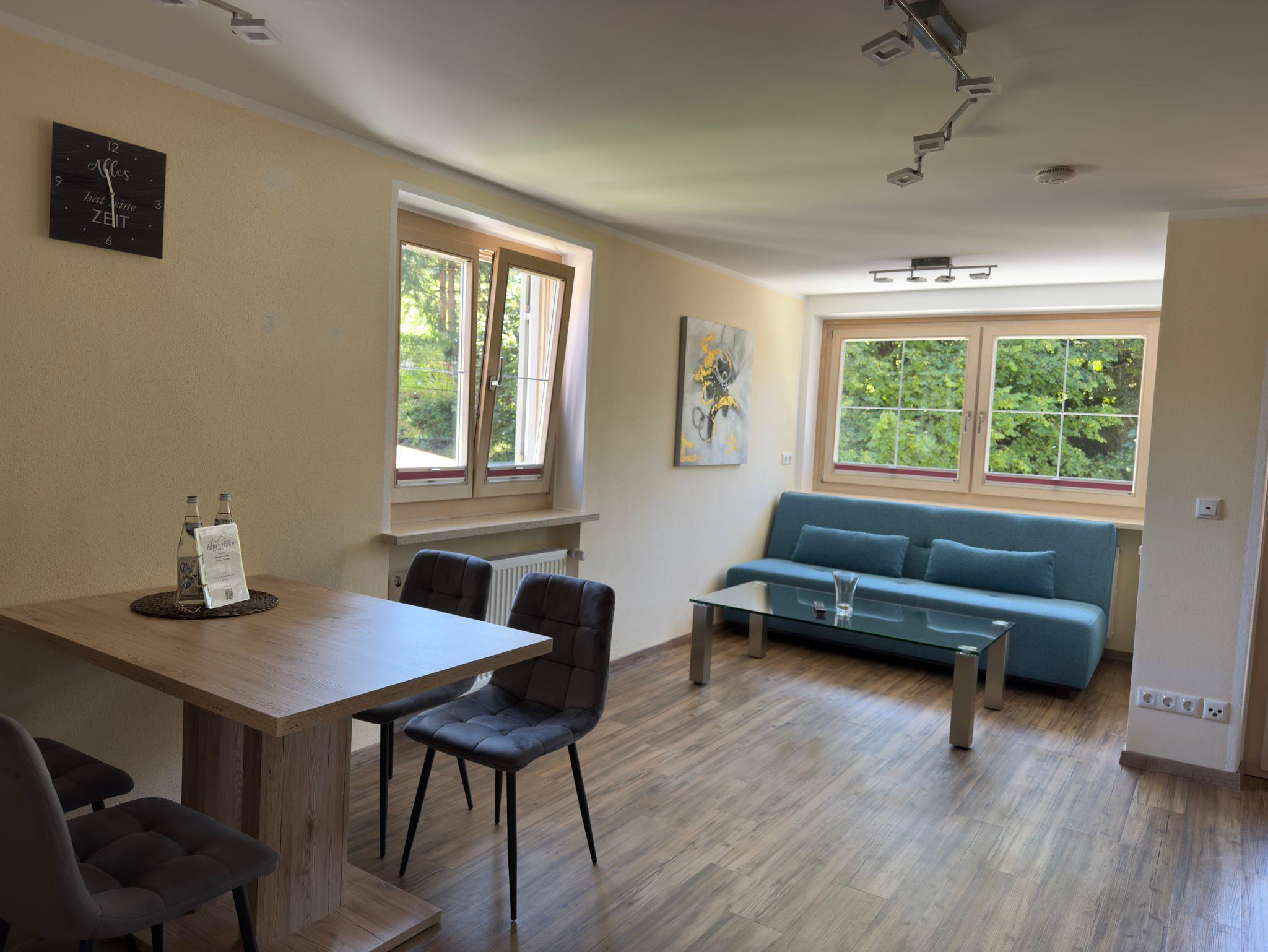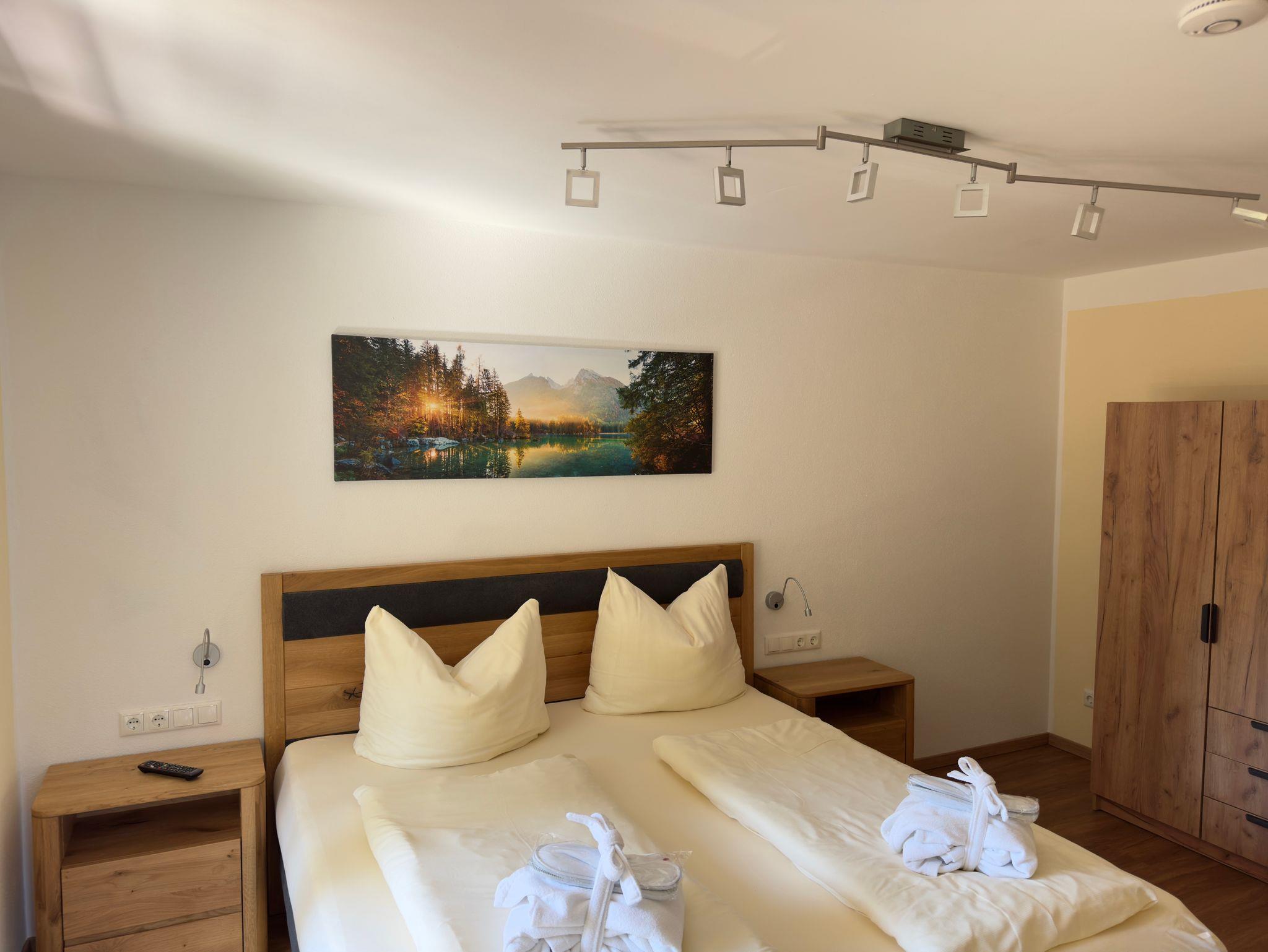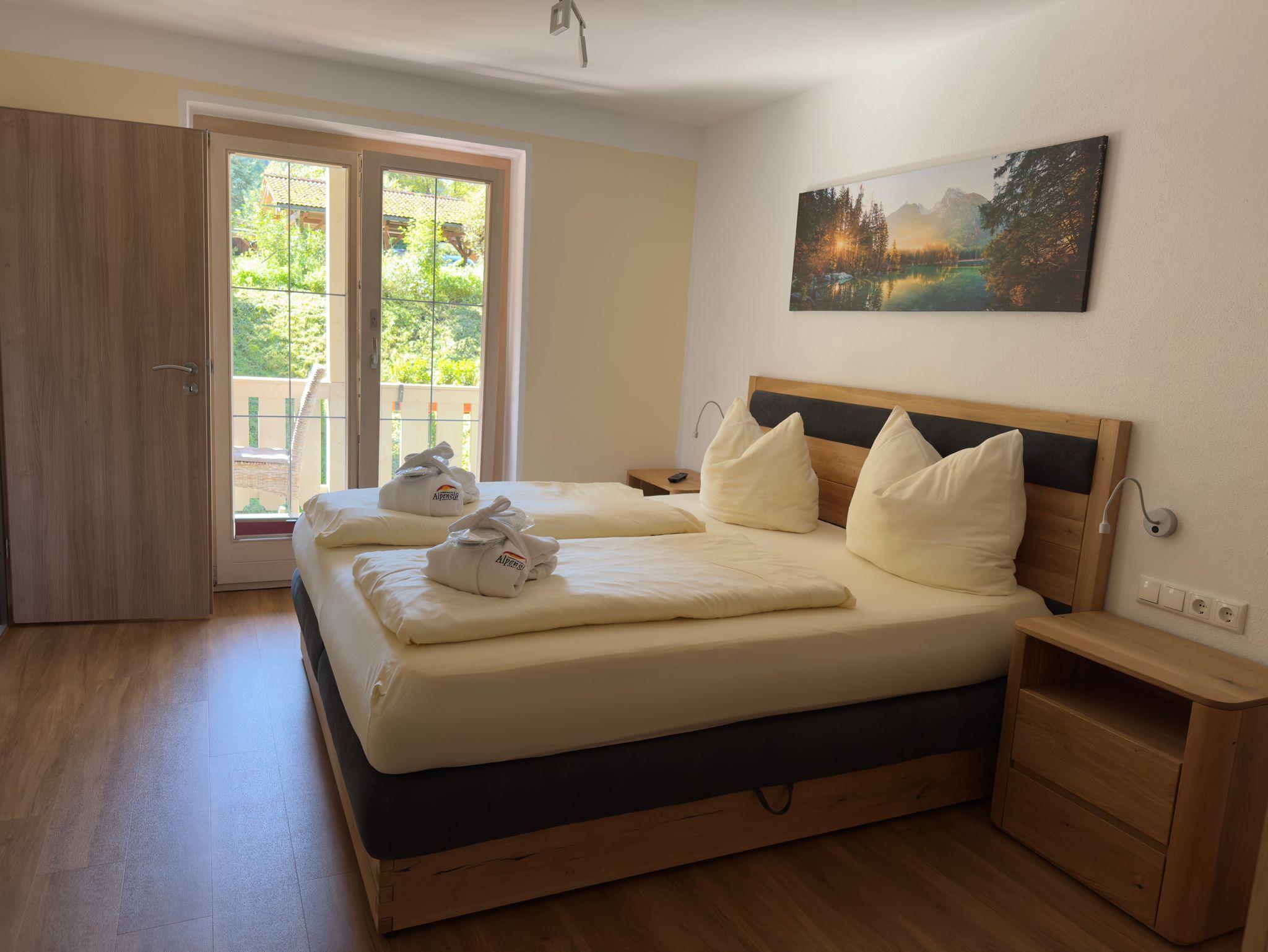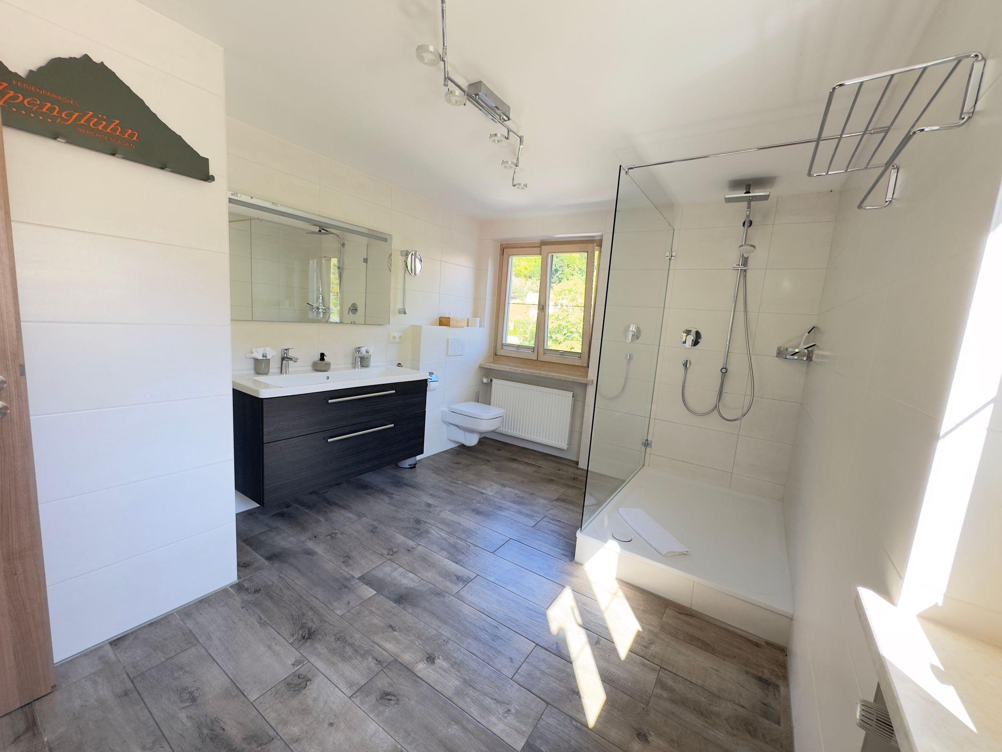 Der nach Süden ausgerichtete Balkon der Ferienwohnung Untersberg, bietet Ihnen einen traumhaften Bergblick auf den Obersalzberg, den Kehlstein und das Massiv des Hohen Göll's. Das nach Süden gemütliche ausgerichtete Schlafzimmer, hat ein Doppelbett mit Komforthöhe, Beistelltischen sowie ein Flat Screen-TV. Im Bad befindet sich eine Dusche, ein WC, ein großes Waschbecken, ein großen Spiegel mit zusätzlichen Vergrößerungsspiegel, ein Kosmetikeimer, dazu sind Handtücher, Bademäntel mit Schlappen, Toilettenpapier, Zahnbecher und Flüssigseife sowie Duschgel vorhanden. Auch einen Wäscheständer für feuchte Handtücher gibt es. Die Küchen ist eine offene Küche die mit dem Wohnraum verschmelzt. Sie ist voll ausgestattet, mit allem was man braucht. Gegenüber der Küche befindet sich der Essbereich mit einem großen Tisch und vier Stühlen. Der helle Wohnbereich ist nach Süden hin ausgerichtet, mit einem großen Sofa, welches auch als Schlafsofa umfunktioniert werden kann. Auch hier in diesem Bereich ist ein großer Flatscreen. Zum Balkon gelangt man vom Wohnbereich, sowie auch vom Schlafzimmeraus. Alle Wohnungen verfügen über freies WLAN. Zusätzlich bietet das Alpenglühn Brötchenservice vor Ihre Tür und Frühstück im Stüberl auf Vorbestellung an.